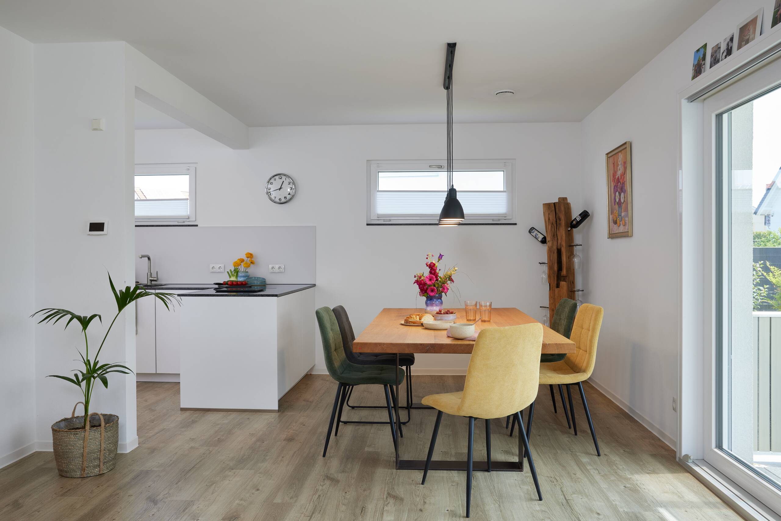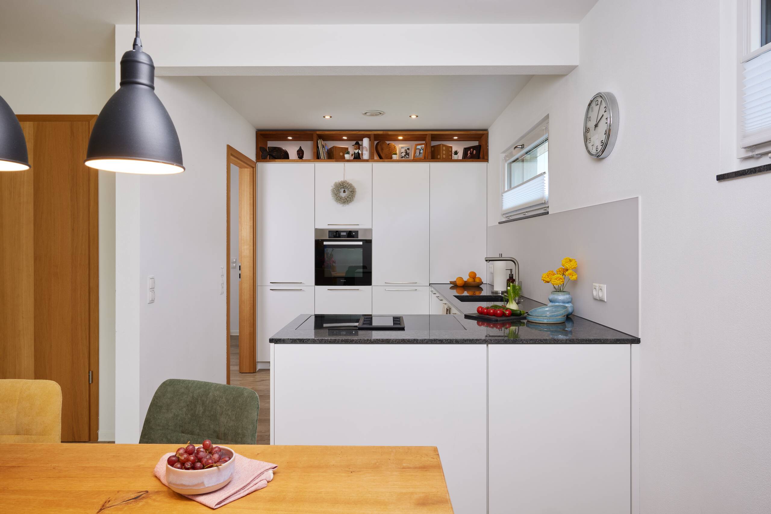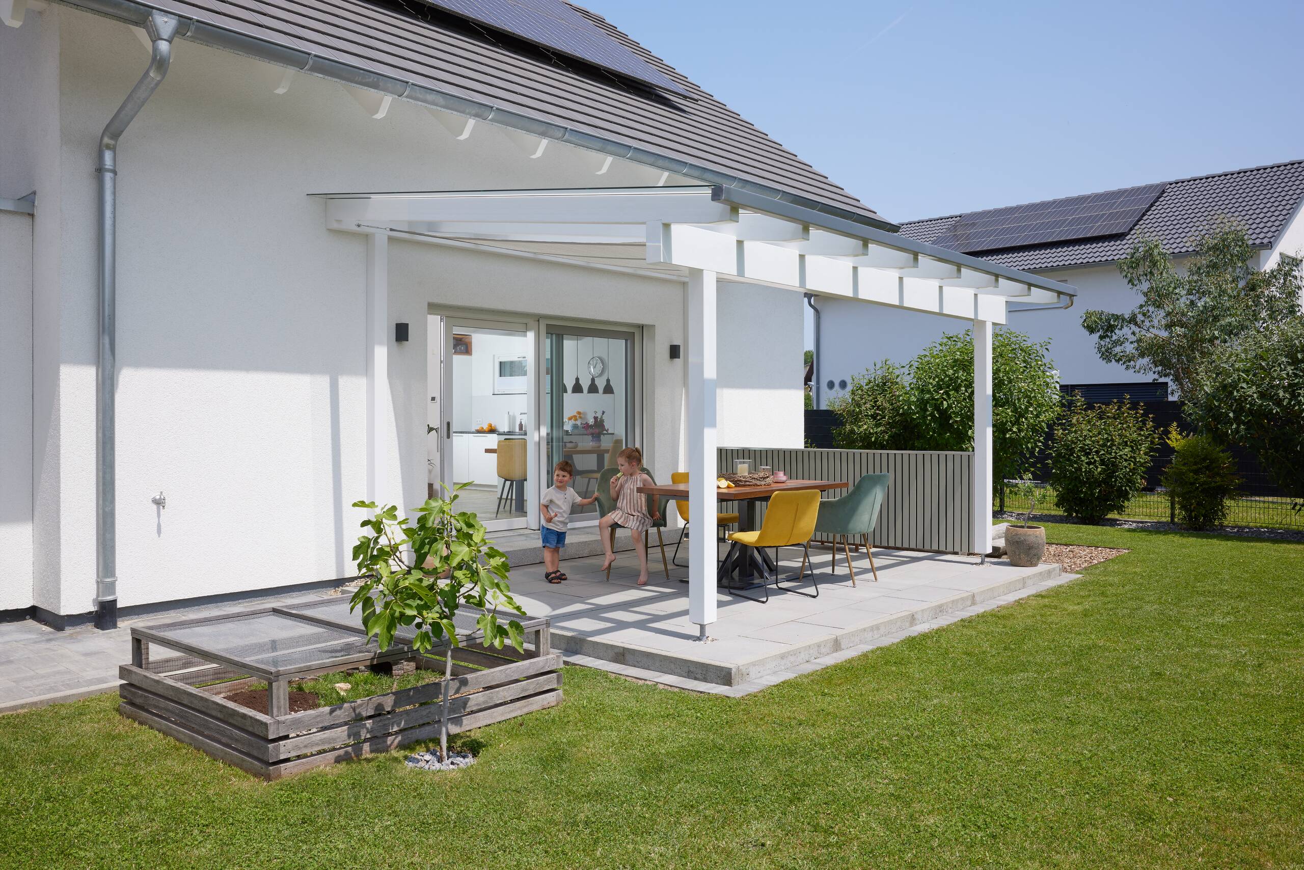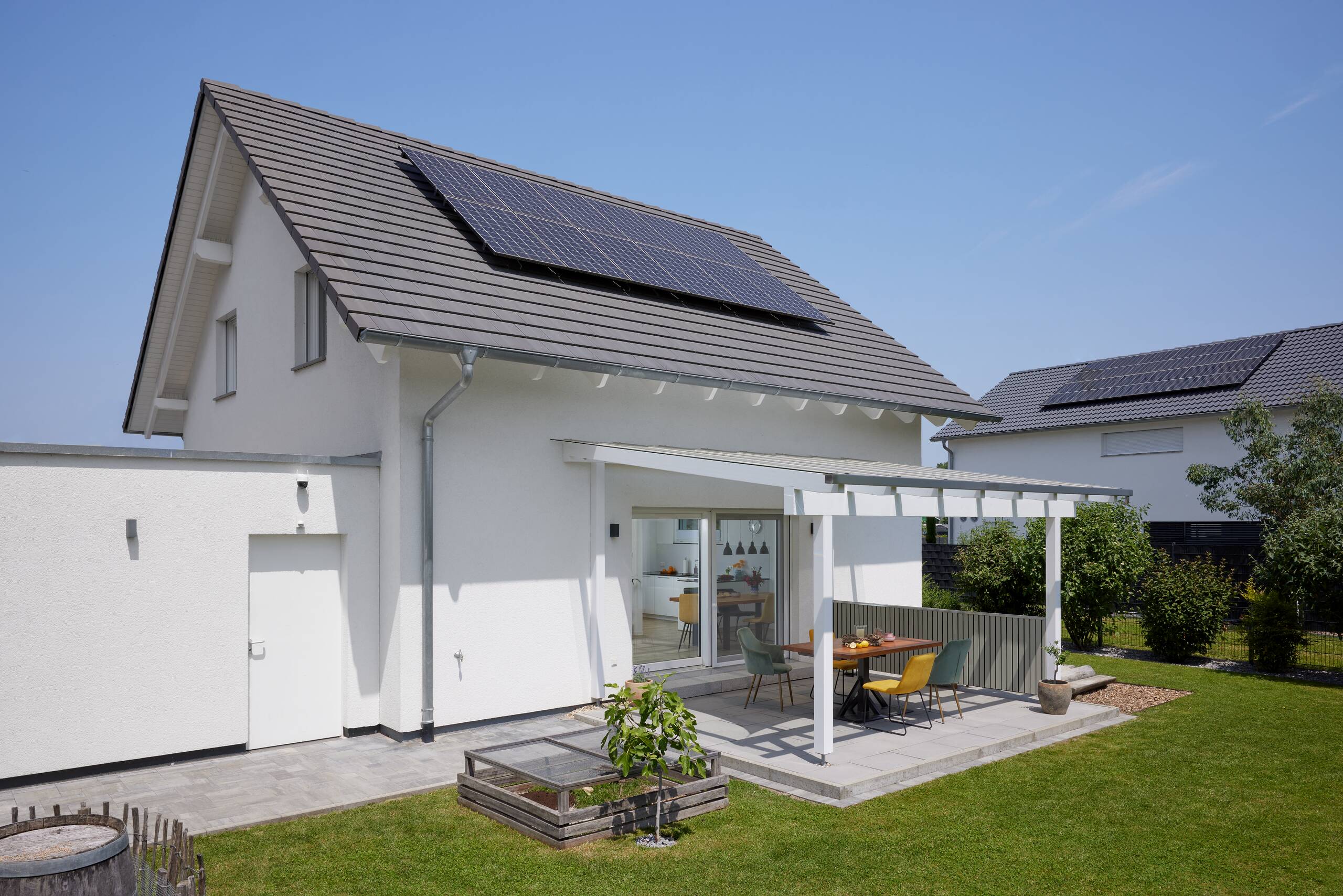 Dieses Einfamilienhaus passt sich mit seinen kompakten Abmessungen von 8,84 x 8,84 m und der klassischen Architektur perfekt in viele Baugebiete ein. Der quadratische, weiss verputze Baukörper wird gekrönt von einem dunkel eingedeckten Satteldach mit weiten Dachüberständen. Auf der Gartenseite schliesst sich eine überdachte Terrasse an.