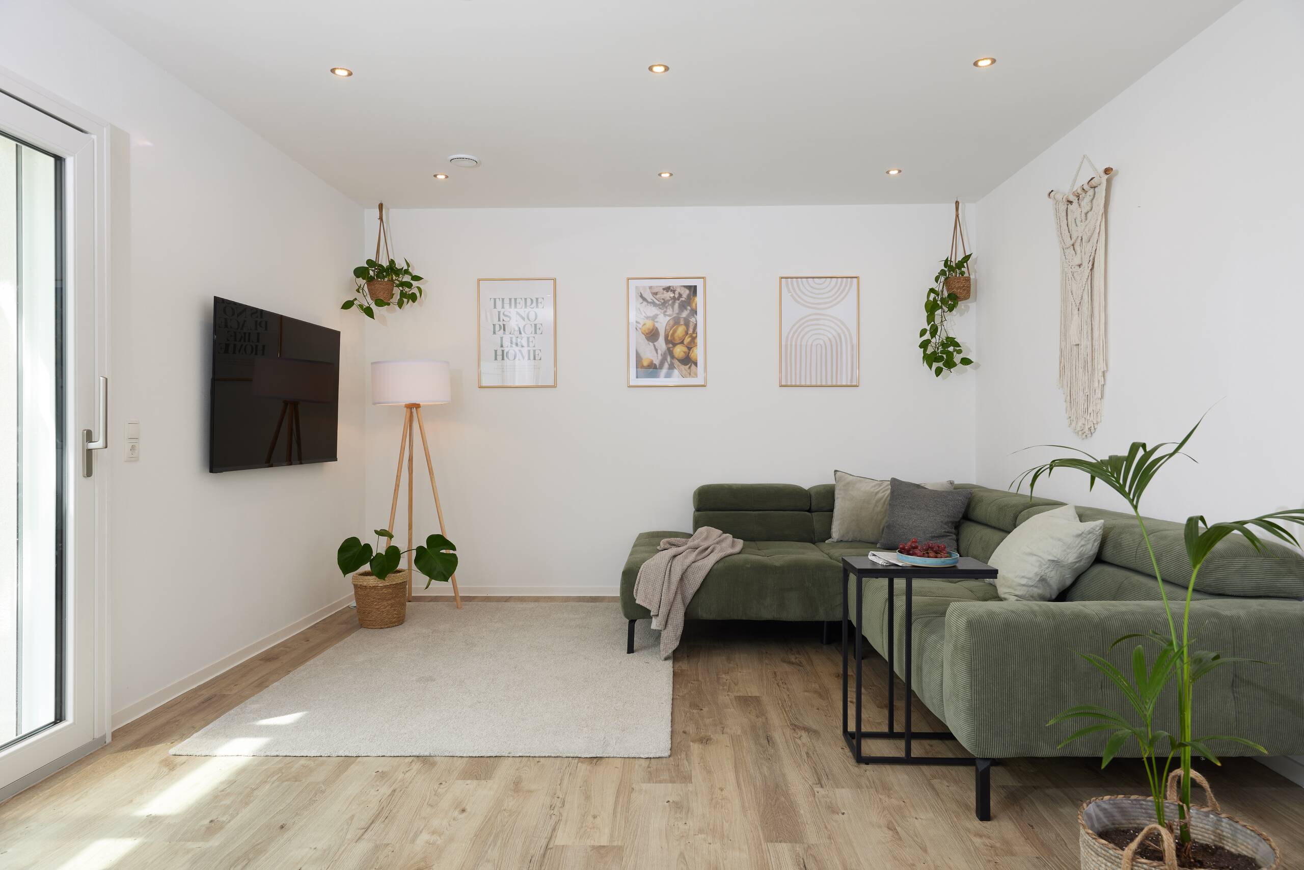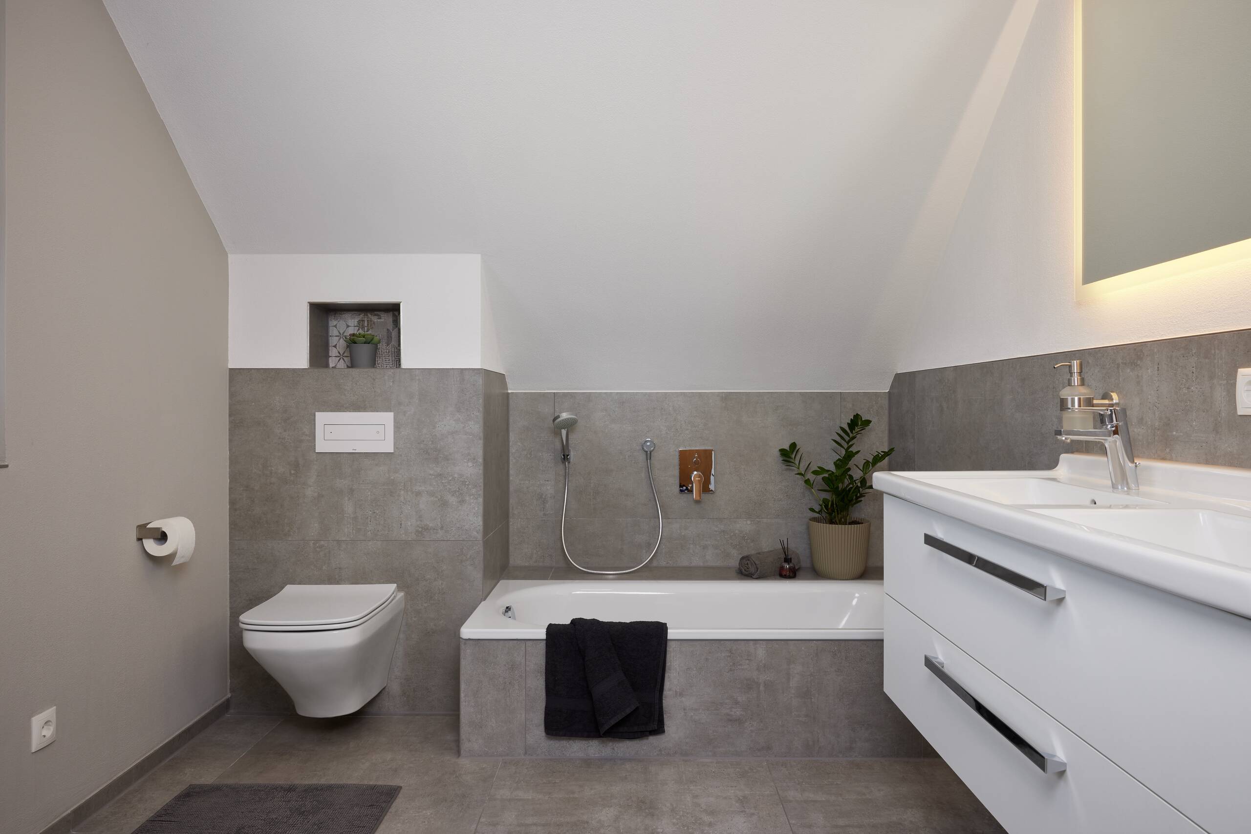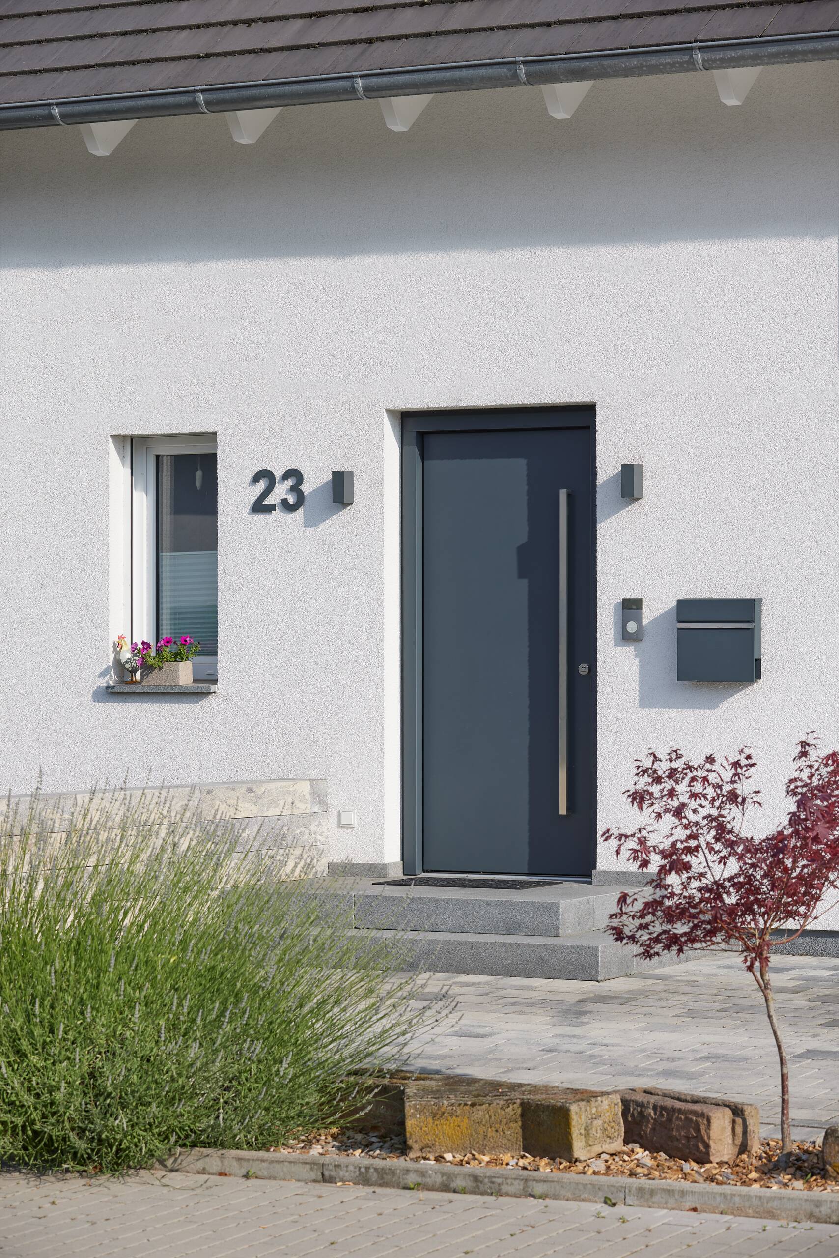 Dieses Einfamilienhaus passt sich mit seinen kompakten Abmessungen von 8,84 x 8,84 m und der klassischen Architektur perfekt in viele Baugebiete ein. Der quadratische, weiss verputze Baukörper wird gekrönt von einem dunkel eingedeckten Satteldach mit weiten Dachüberständen. Auf der Gartenseite schliesst sich eine überdachte Terrasse an.