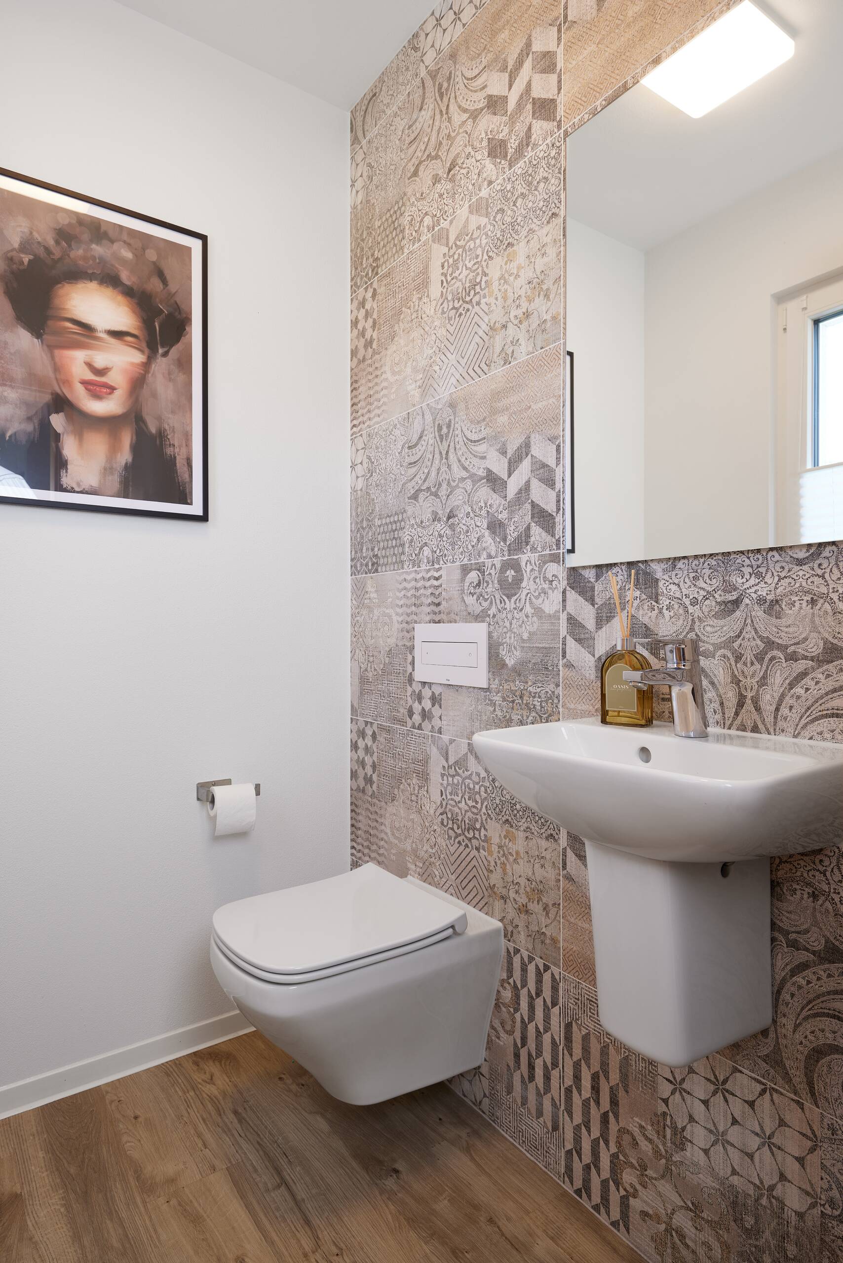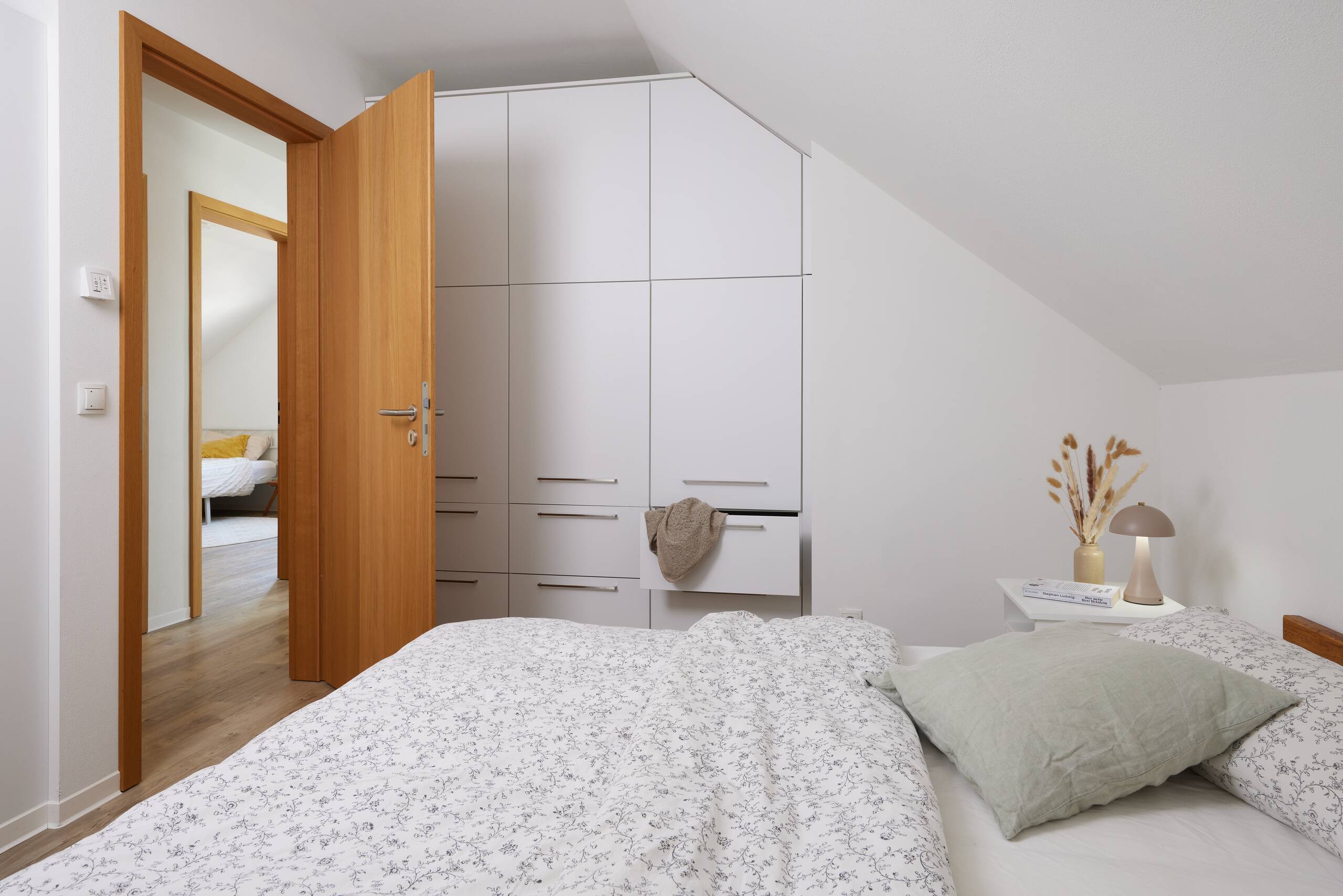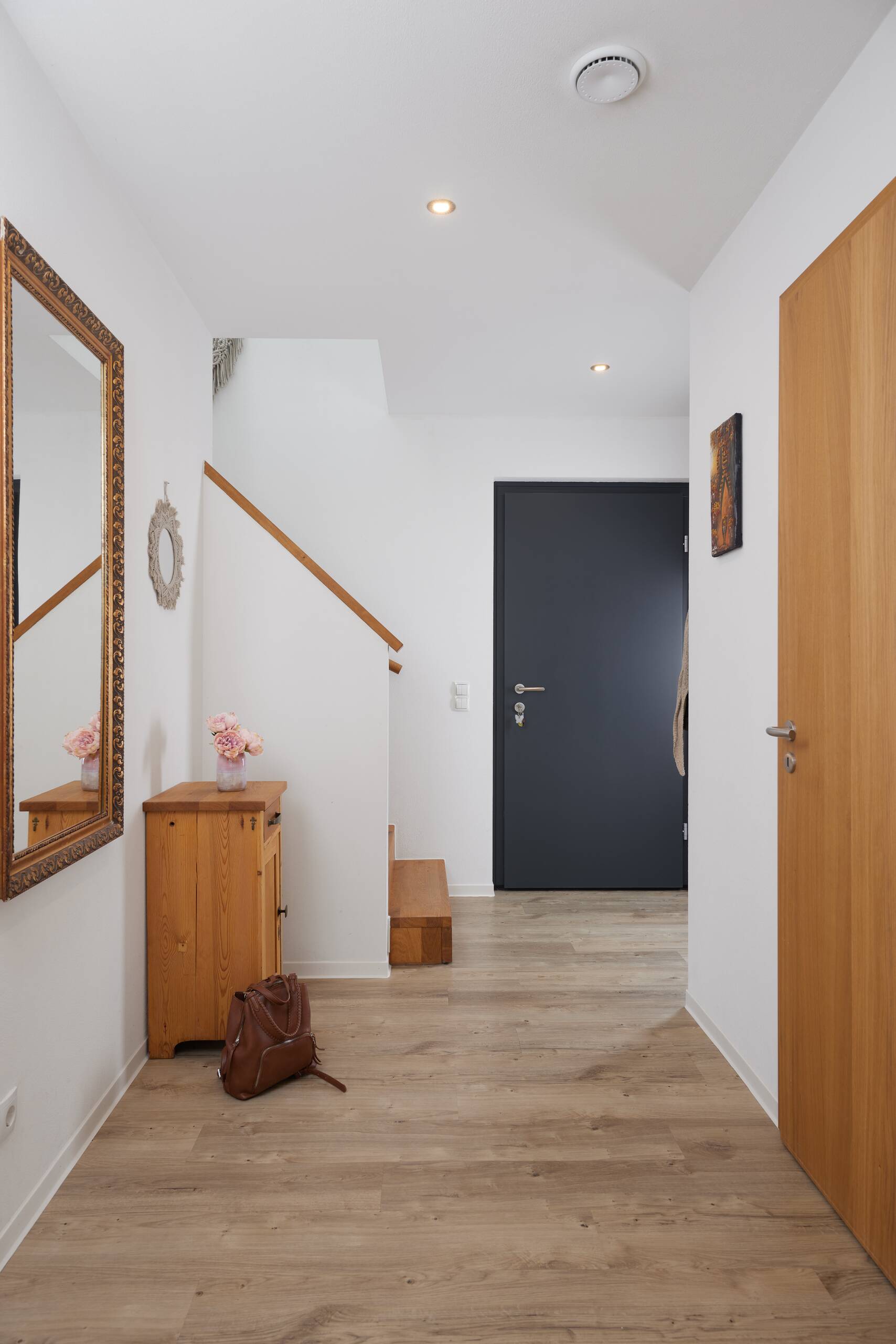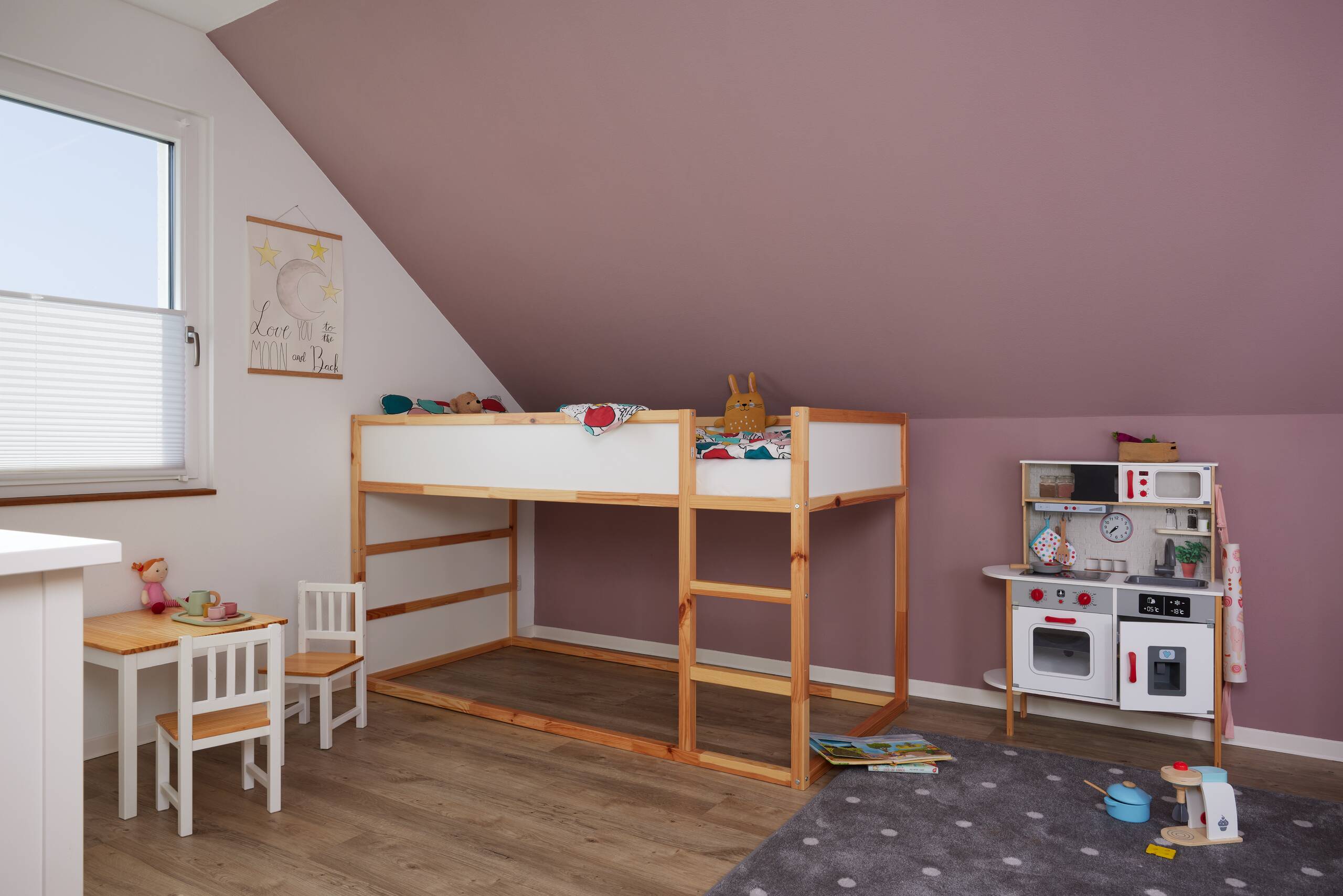 Dieses Einfamilienhaus passt sich mit seinen kompakten Abmessungen von 8,84 x 8,84 m und der klassischen Architektur perfekt in viele Baugebiete ein. Der quadratische, weiss verputze Baukörper wird gekrönt von einem dunkel eingedeckten Satteldach mit weiten Dachüberständen. Auf der Gartenseite schliesst sich eine überdachte Terrasse an.