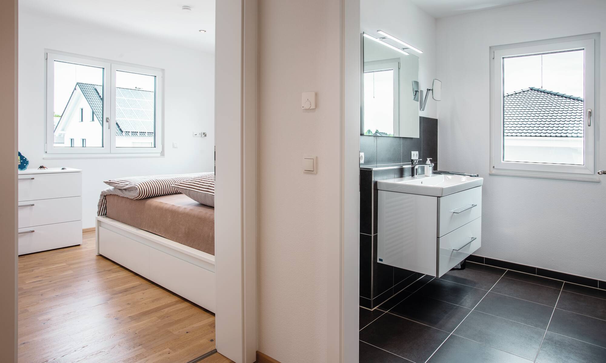 Das neue Balance 250 mit zwei Vollgeschossen passt sich den Wünschen und Visionen der Bauherren flexibel an. Gleichzeitig bietet das Haus rund 160 m² Wohnfläche mit vielen smarten Details. Der überdachte Hauseingang zum Beispiel - für einen trockenen Zugang zum Haus. Eine Pergola aus Holz mit Glaseindeckung ist ebenso möglich wie eine Photovoltaikanlage, auch als optisch harmonische Indach-Montage. So wird Ihr Haus zum eigenen kleinen Kraftwerk.