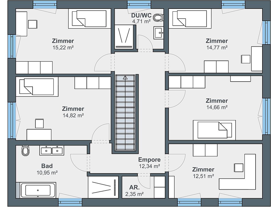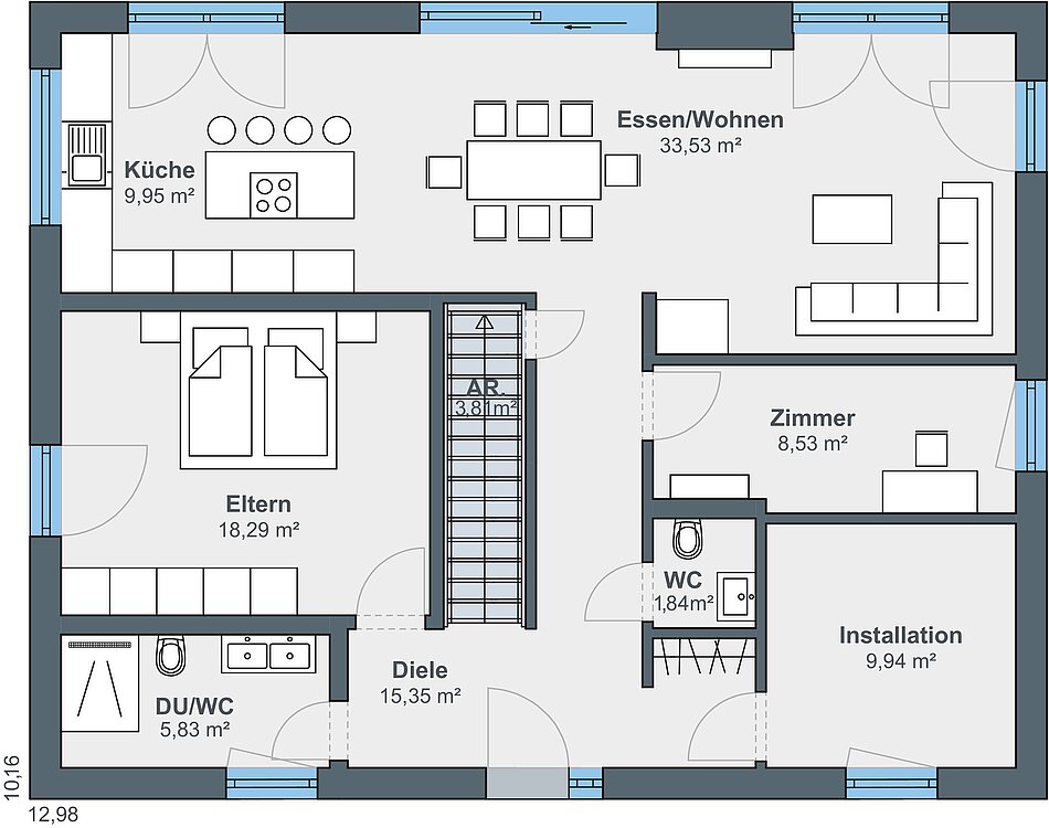 Ein gradliniger Baukörper, eine weiße Putzfassade und ein dunkel eingedecktes Walmdach – diese elegante Stadtvilla macht sowohl im gewachsenen Umfeld als auch in komplett neu erschlossenen Baugebieten eine gute Figur. Für Spannung sorgen die grau abgesetzten Bereiche am Obergeschoss, die dem Haus im Zusammenspiel mit den grauen Fensterrahmen einen ruhigen, unaufdringlichen Charakter verleihen. Harmonisch fügen sich die transparenten Überdachungen über dem Eingang und über der Terrasse in das Gesamtbild ein.