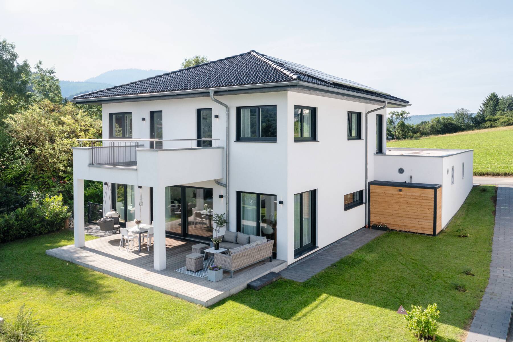 Die Stadtvilla mit rund 150 Quadratmeter Wohnfläche und einem Zeltdach basiert auf der Baureihe CityLife. An das zweigeschossige Einfamilienhaus grenzt eine Garage mit direktem Zugang zum Haus. Hier befindet sich auch ein Teil der innovativen Energietechnik, die bei diesem Kundenhaus als Pilotprojekt umgesetzt wurde: Das picea-System von HPS Home Power Solution. Dabei handelt es sich um ein Kompaktgerät zur ganzjährigen autarken Energieversorgung. Die Speicheranlage wandelt nicht sofort genutzten Strom in Wasserstoff um.