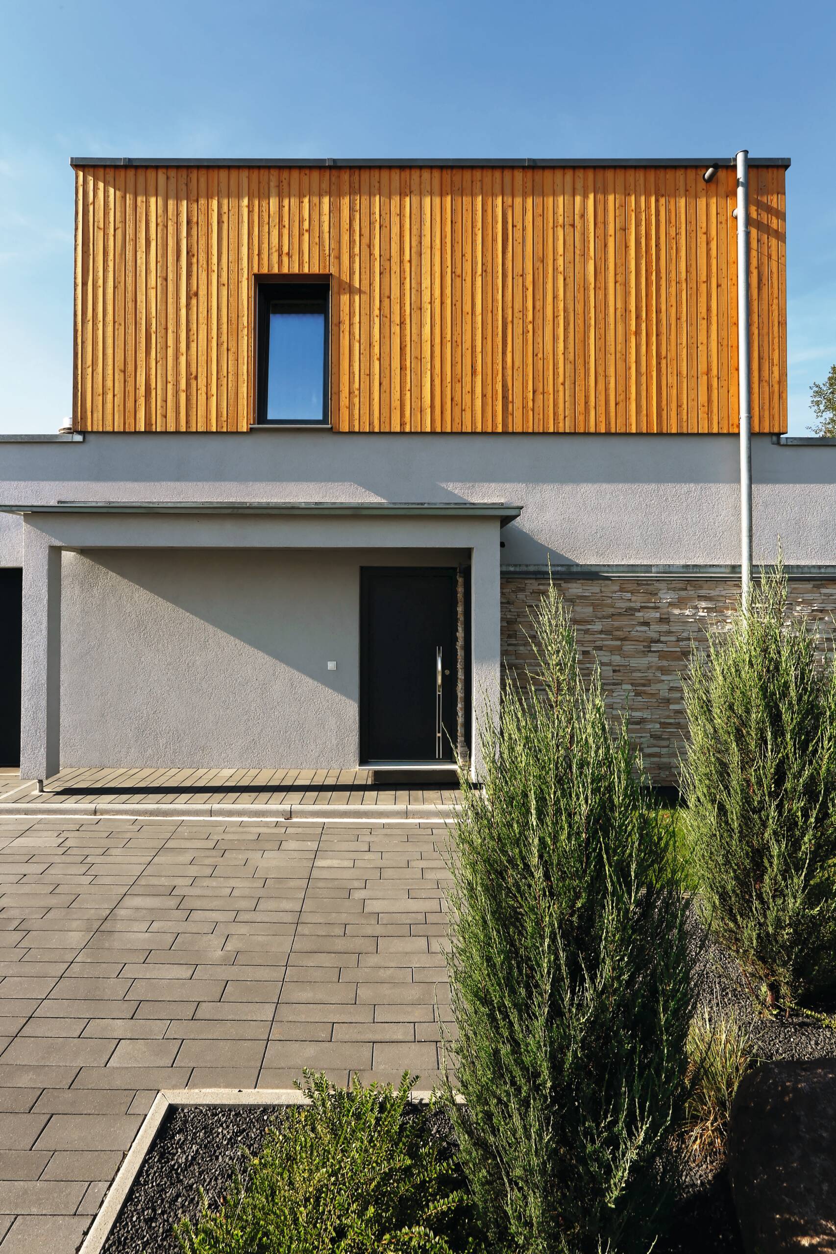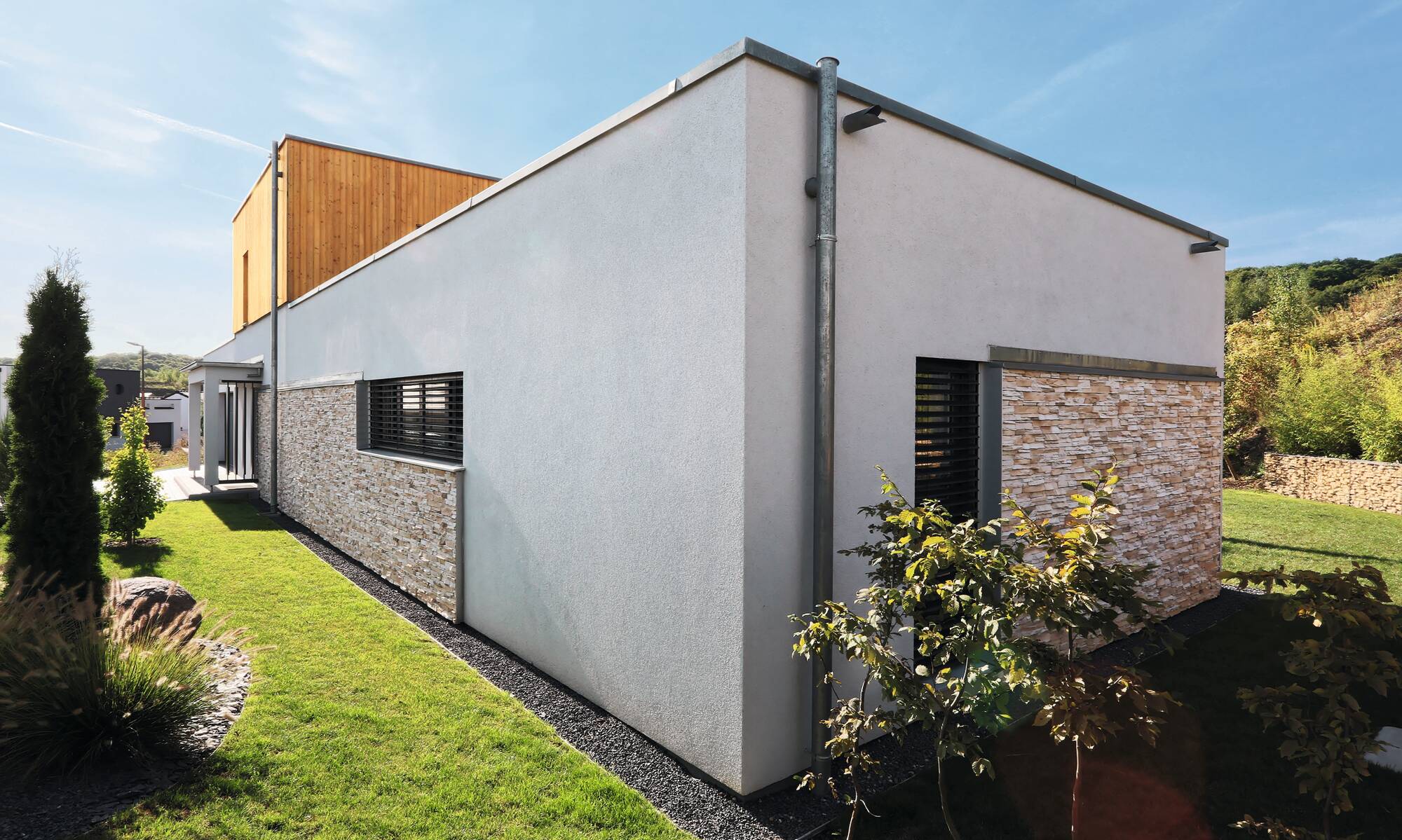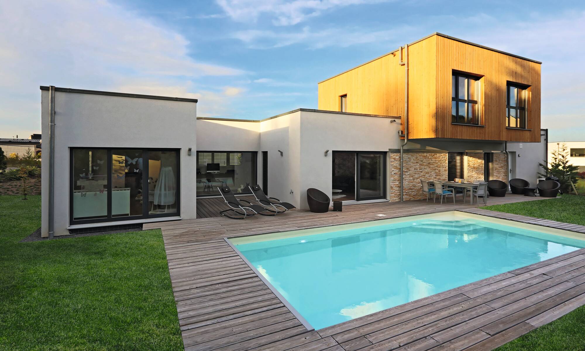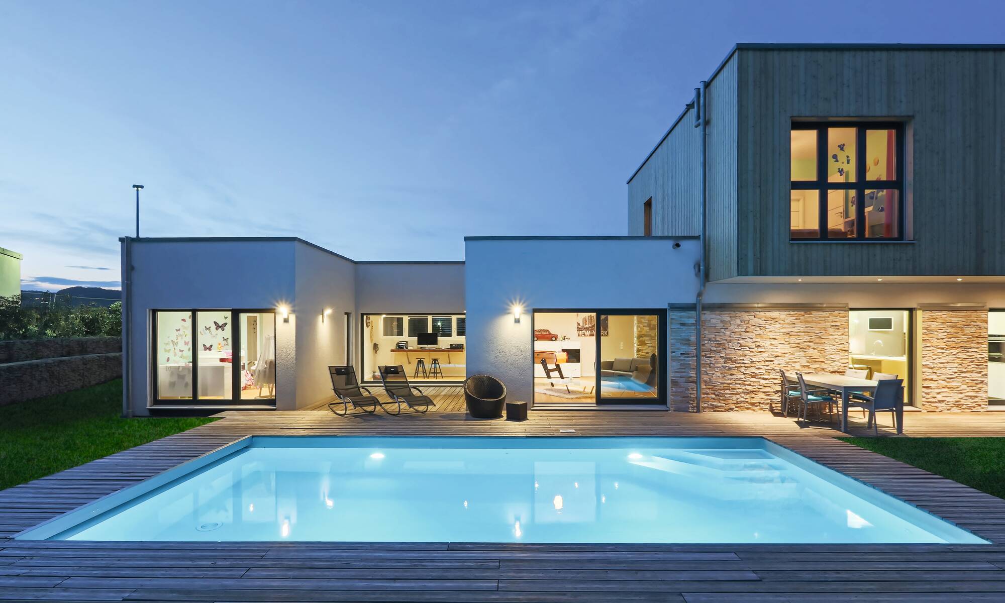„Wir freuen uns jeden Abend, nach der Arbeit in dieses schöne Zuhause heim zu kommen.“ Diesen Satz äußert das Bauherrenpaar aus Frankreich einstimmig über ihr individuell geplantes Architektenhaus. Mit ihren beiden Sprösslingen wohnt die Familie in einem durchgestylten Haus, dessen Grundriss ein schlanker, langgezogener Baukörper ist. Smart konzipiert finden alle Räume mit einer Geschosserhöhung auf 2,64 m im Erdgeschoss ihren idealen Platz. Als Sahnehaube zeigt sich in der Gartenanlage ein großer, moderner Pool, den die ganze Familie ausgiebig nutzt.