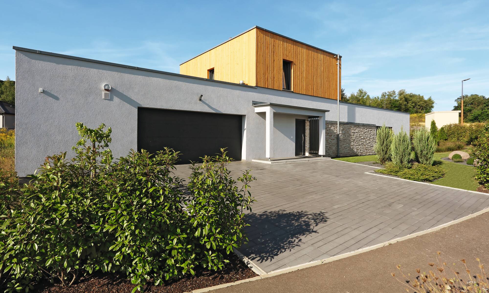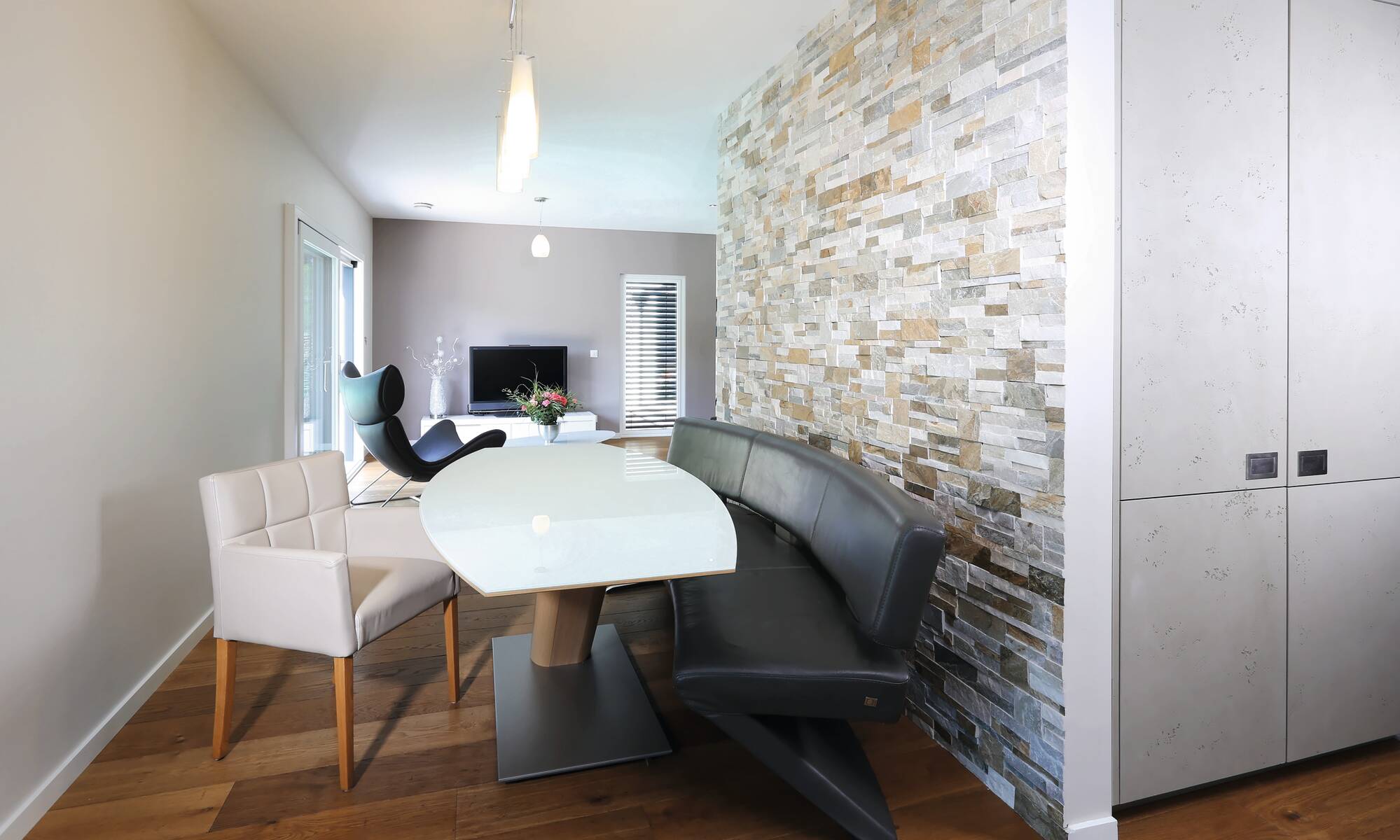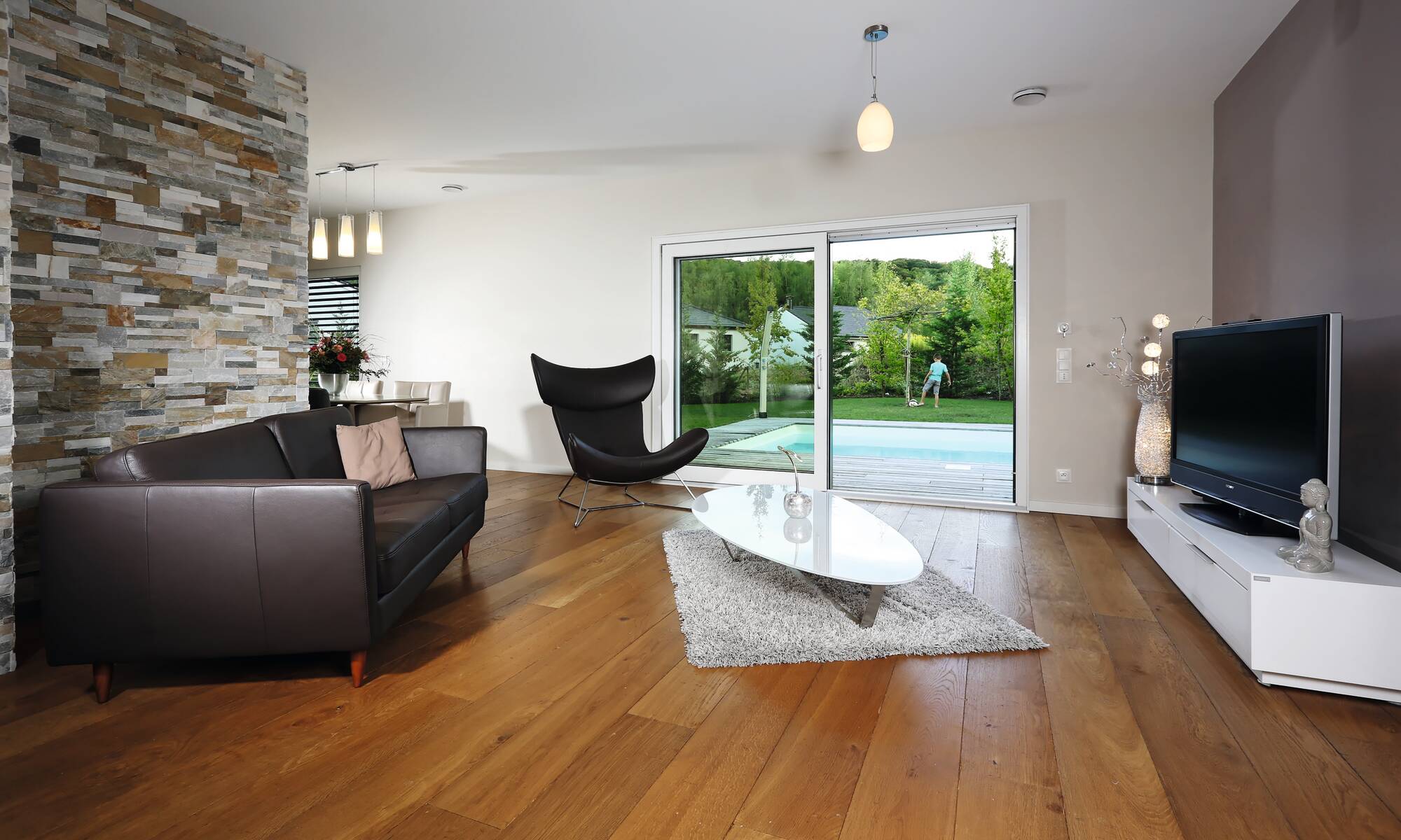 „Wir freuen uns jeden Abend, nach der Arbeit in dieses schöne Zuhause heim zu kommen.“ Diesen Satz äußert das Bauherrenpaar aus Frankreich einstimmig über ihr individuell geplantes Architektenhaus. Mit ihren beiden Sprösslingen wohnt die Familie in einem durchgestylten Haus, dessen Grundriss ein schlanker, langgezogener Baukörper ist. Smart konzipiert finden alle Räume mit einer Geschosserhöhung auf 2,64 m im Erdgeschoss ihren idealen Platz. Als Sahnehaube zeigt sich in der Gartenanlage ein großer, moderner Pool, den die ganze Familie ausgiebig nutzt.