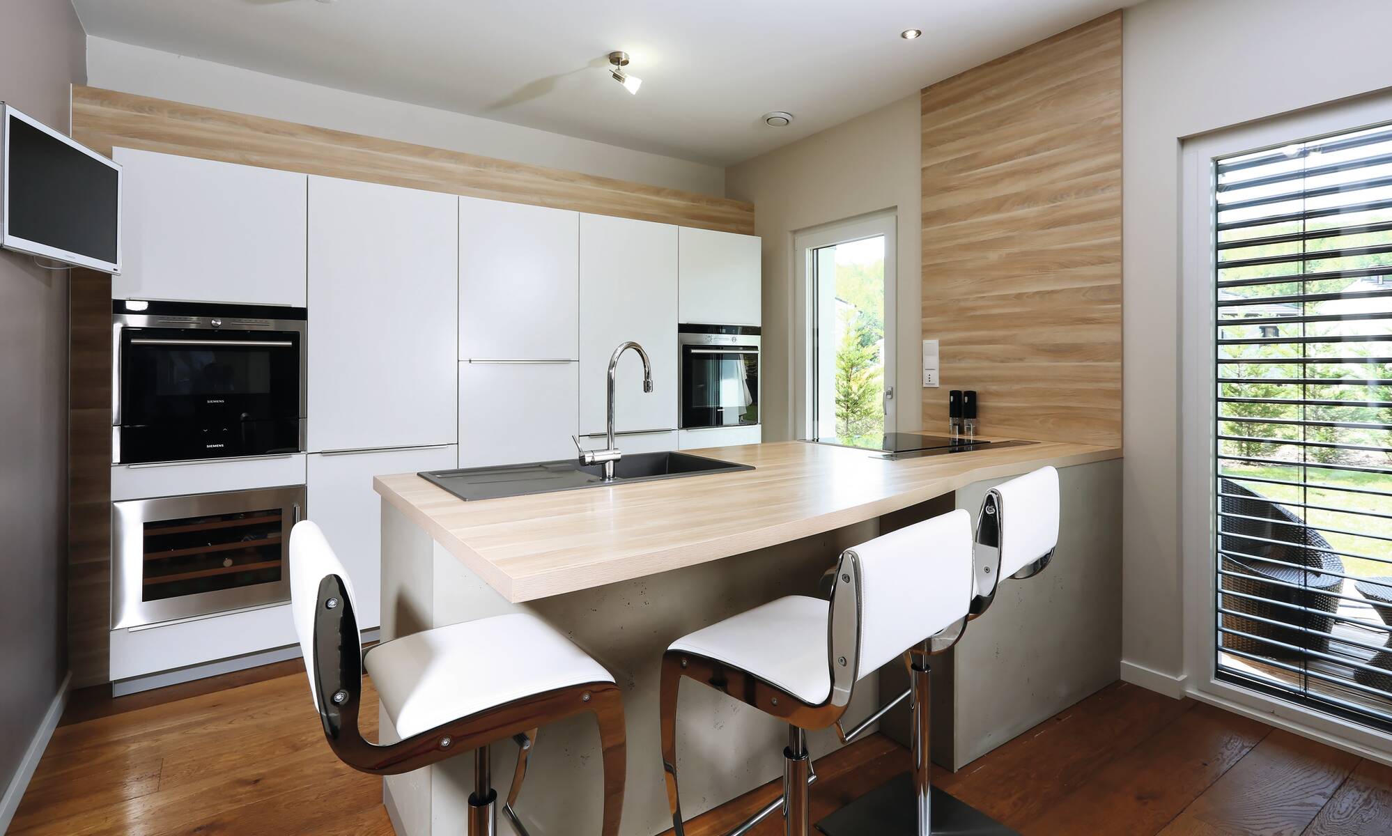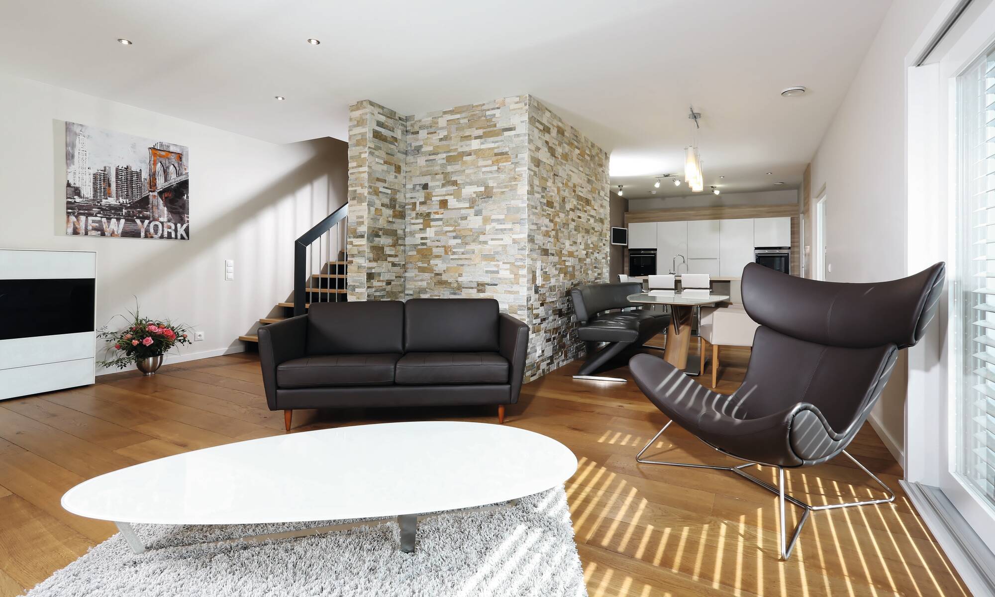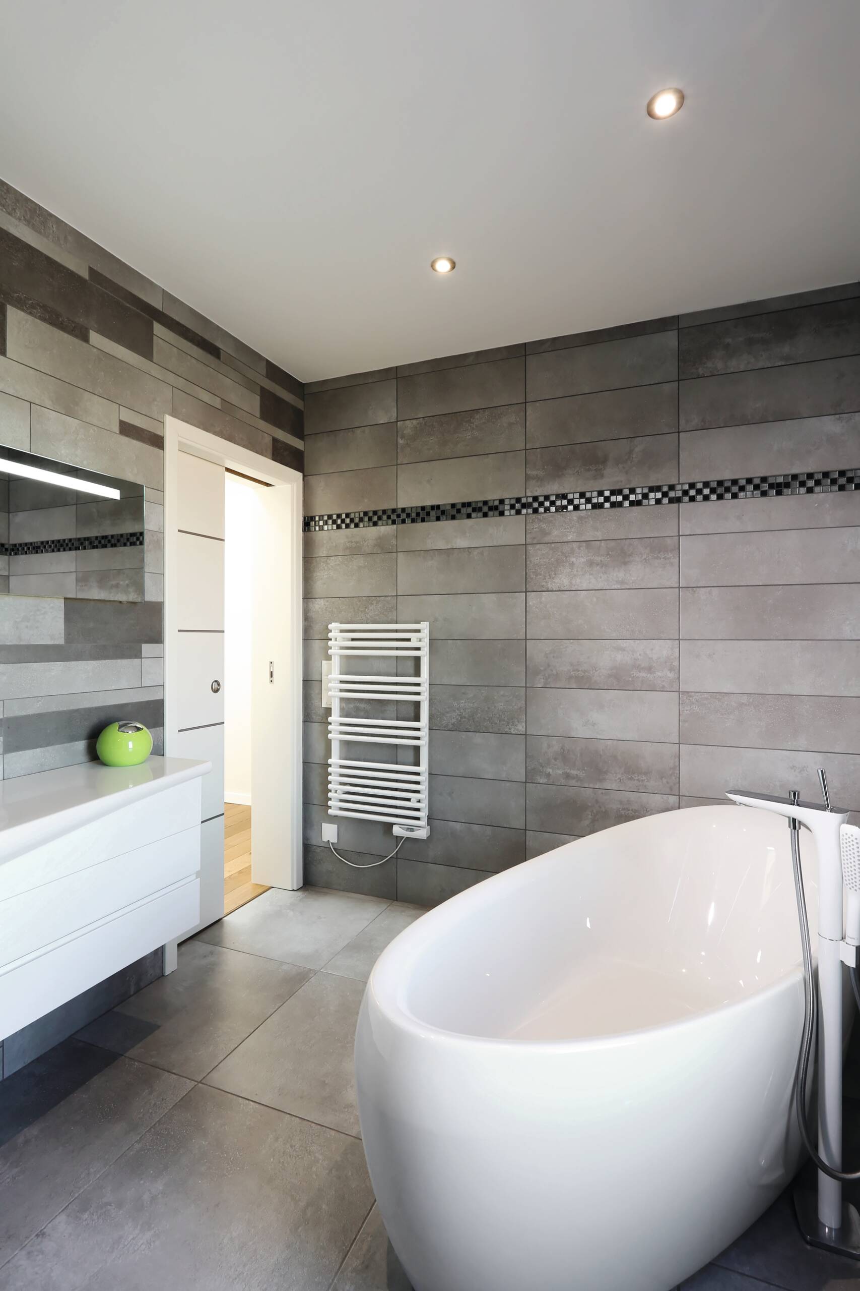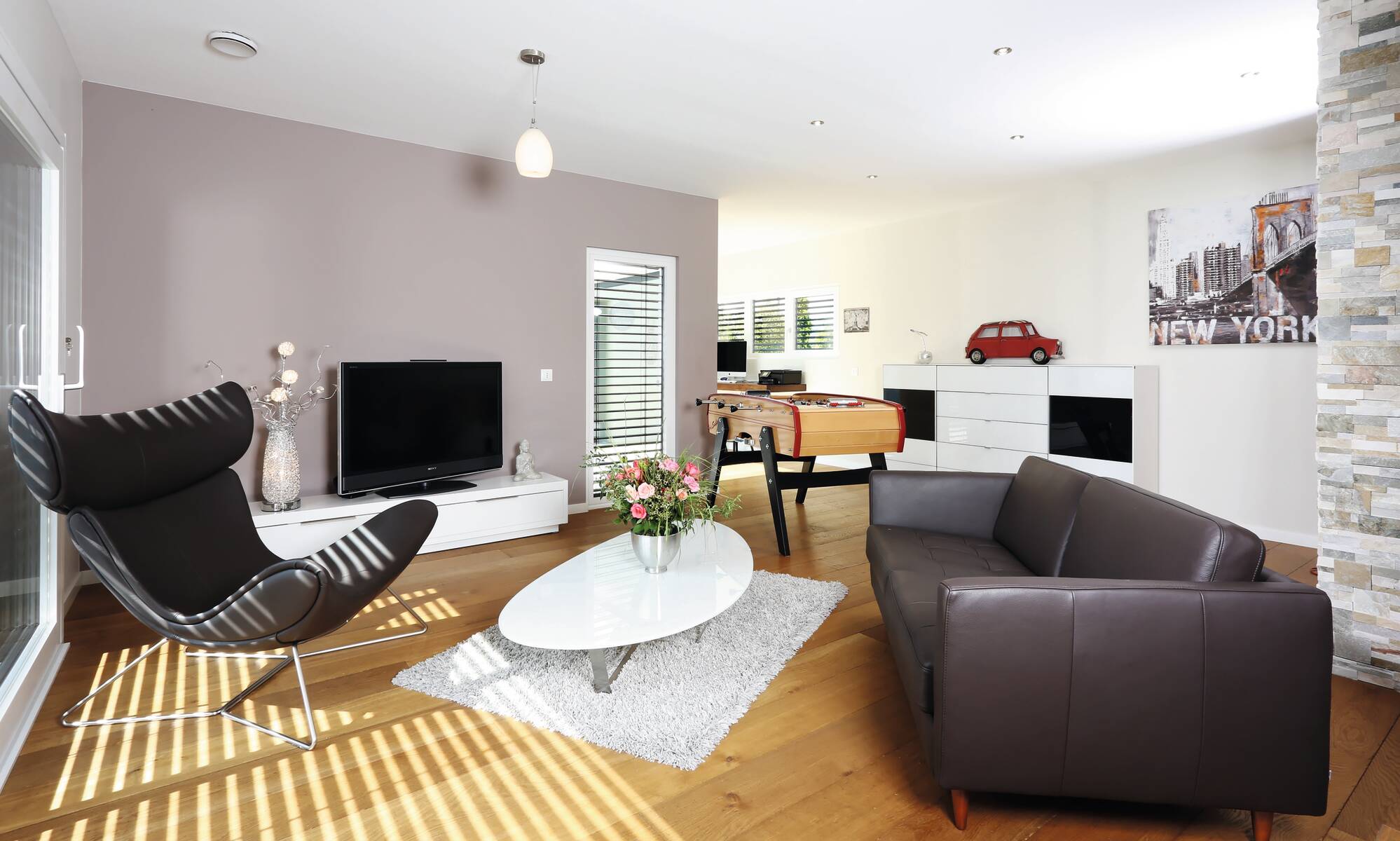 „Wir freuen uns jeden Abend, nach der Arbeit in dieses schöne Zuhause heim zu kommen.“ Diesen Satz äußert das Bauherrenpaar aus Frankreich einstimmig über ihr individuell geplantes Architektenhaus. Mit ihren beiden Sprösslingen wohnt die Familie in einem durchgestylten Haus, dessen Grundriss ein schlanker, langgezogener Baukörper ist. Smart konzipiert finden alle Räume mit einer Geschosserhöhung auf 2,64 m im Erdgeschoss ihren idealen Platz. Als Sahnehaube zeigt sich in der Gartenanlage ein großer, moderner Pool, den die ganze Familie ausgiebig nutzt.