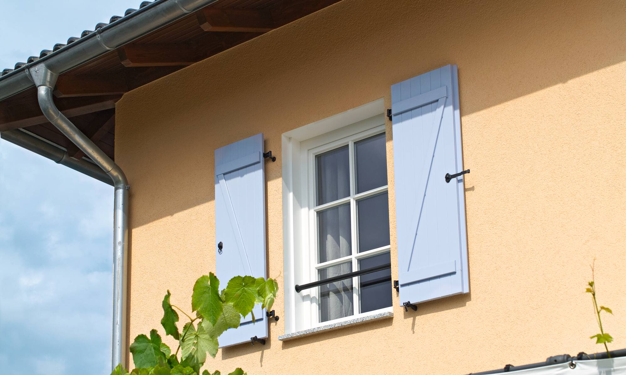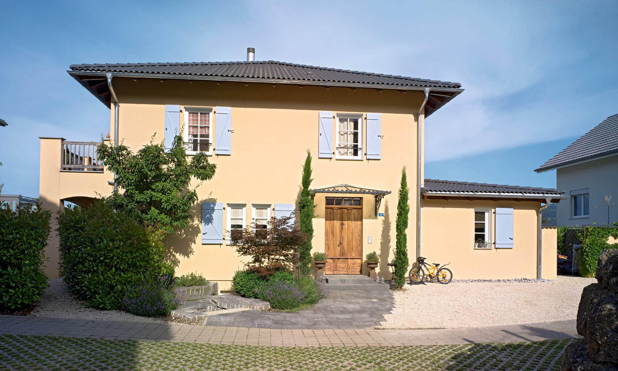 Dieses Haus weckt Erinnerungen an den letzten Urlaub im Süden. Inspiriert von mediterraner Landhaus-Architektur, fügt sich dieser Entwurf sowohl in ländliche als auch in städtische Baugebiete harmonisch ein. Besonders attraktiv: die Kombination aus sandfarbenem Putz und hellblauen Fensterläden. Der großzügige Balkon und die hübschen Arkaden unterstreichen das ländlich-romantische Ambiente, welches sich auch in der Gestaltung des Innenbereiches wiederfindet – jedoch ohne aufgesetzt oder allzu rustikal zu wirken.