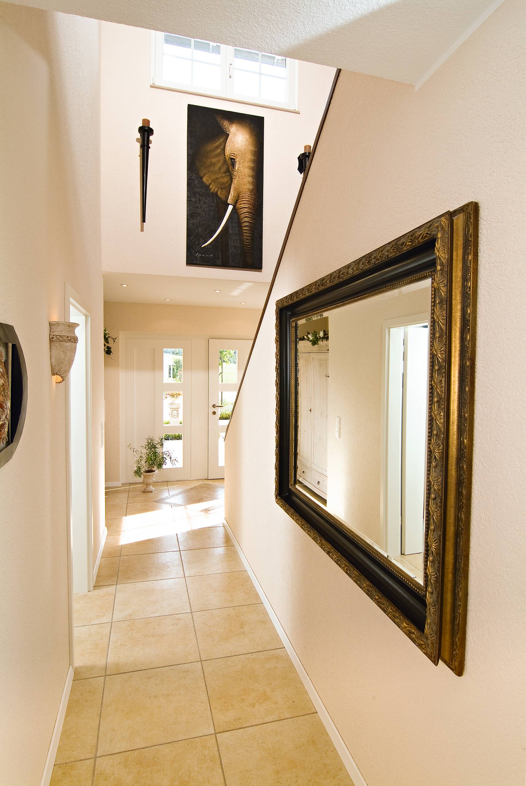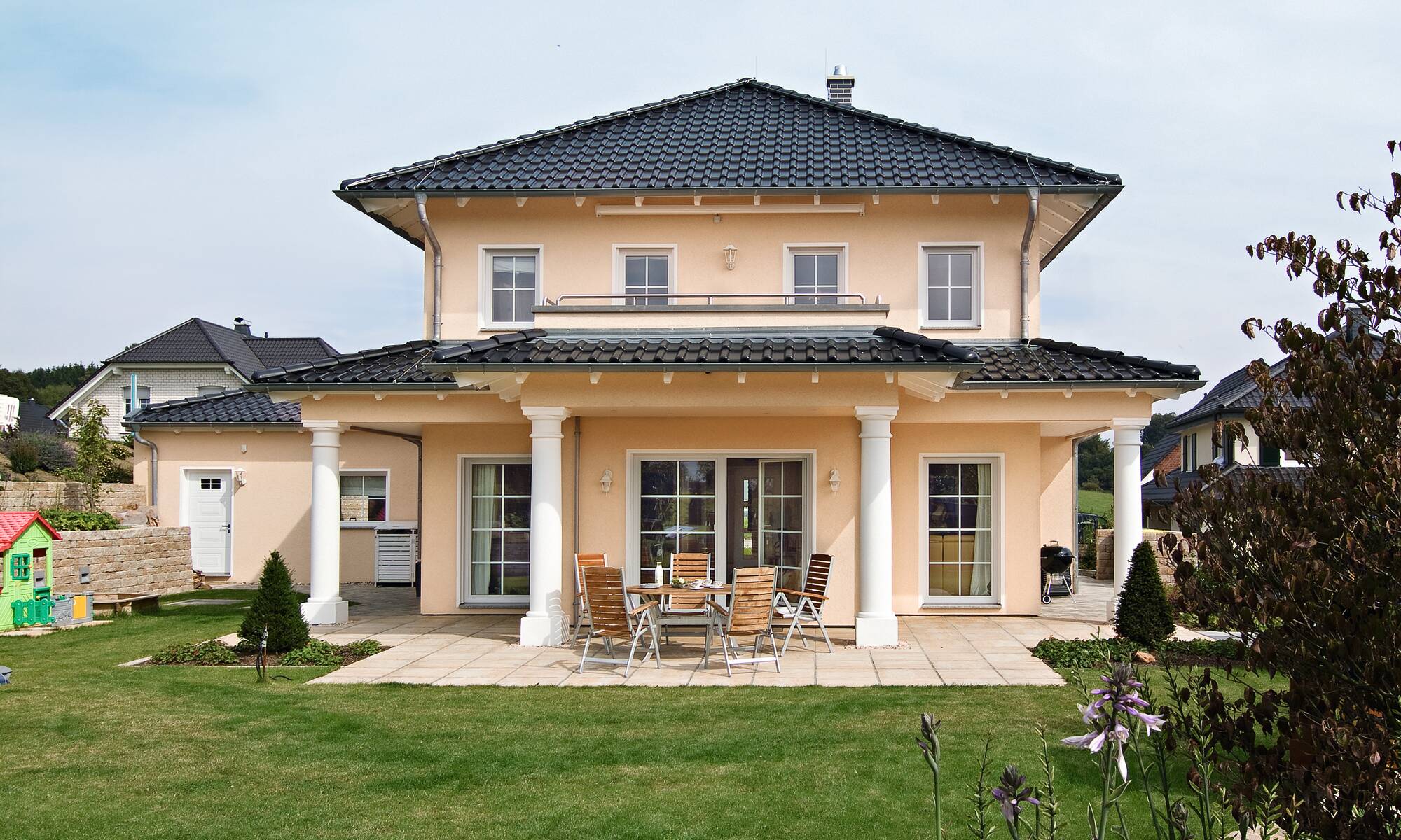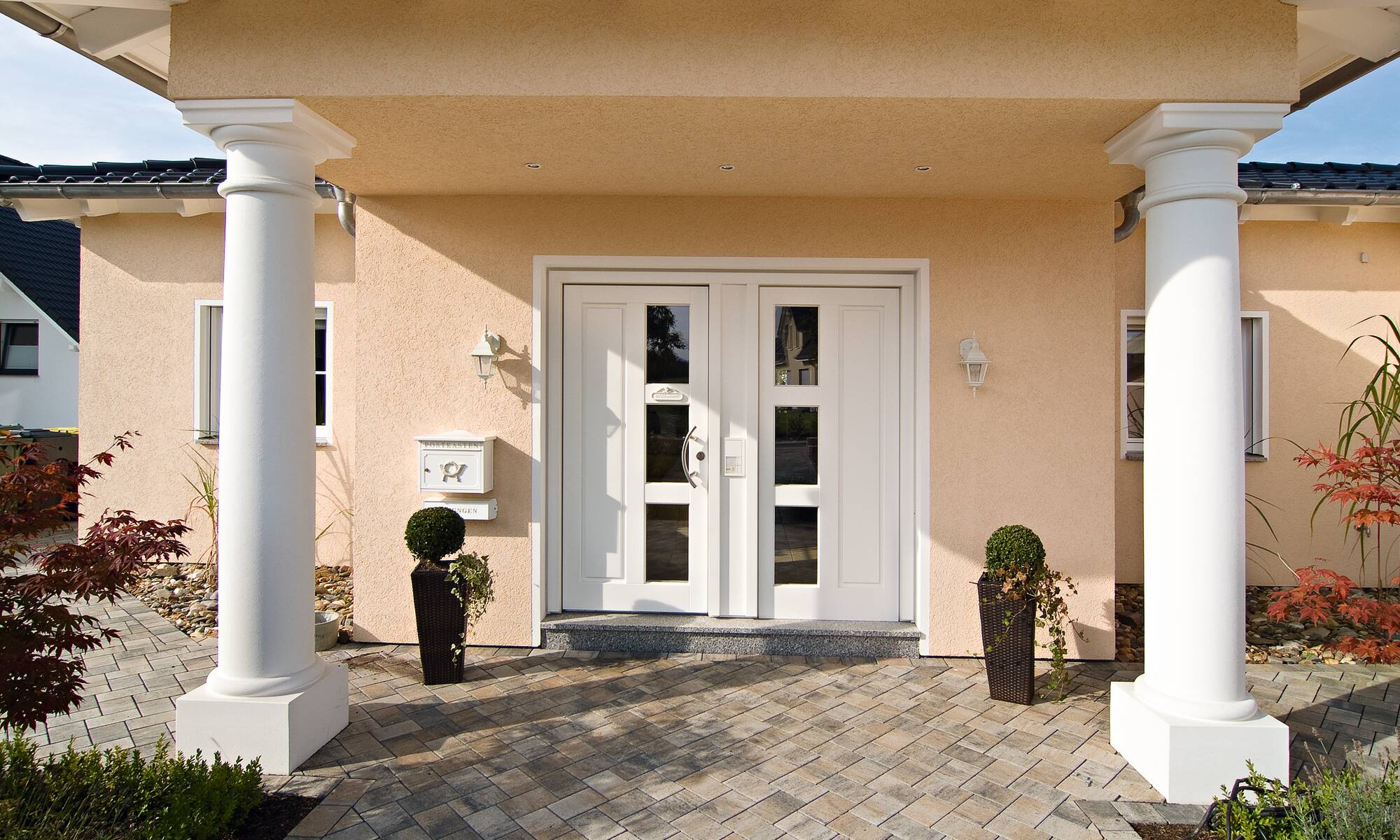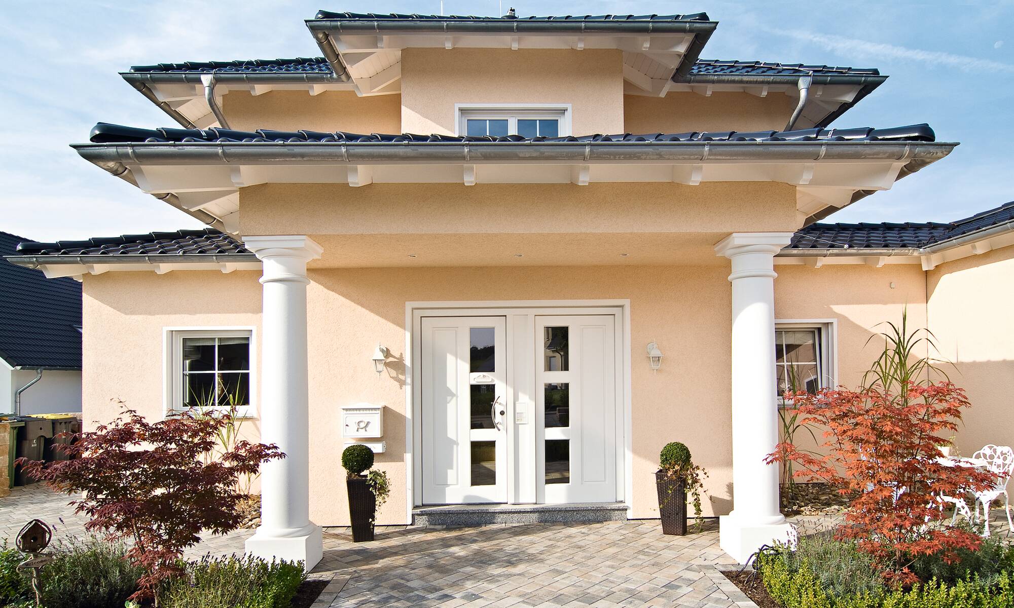 Die asiatische Architektur stand bei diesem individuellen Entwurf Pate. Das Hauseingangsportal wirkt durch die Säulen und das ausladende Vordach besonders imposant. Das Obergeschoss ist ein kleines Stück nach innen versetzt, was dem Haus Leichtigkeit verleiht. Das Innere besticht durch eine offene Gestaltung mit einem Haus Fernost. Die hochwertigen Materialien in erdigen Farbtönen machen die Wohnräume zu einer Quelle von Harmonie und Lebensfreude.