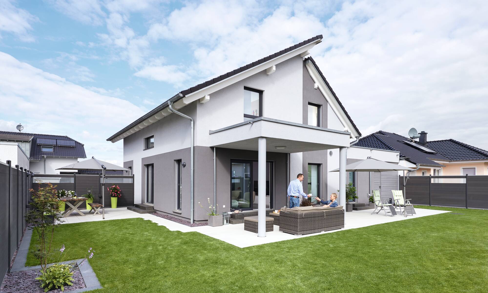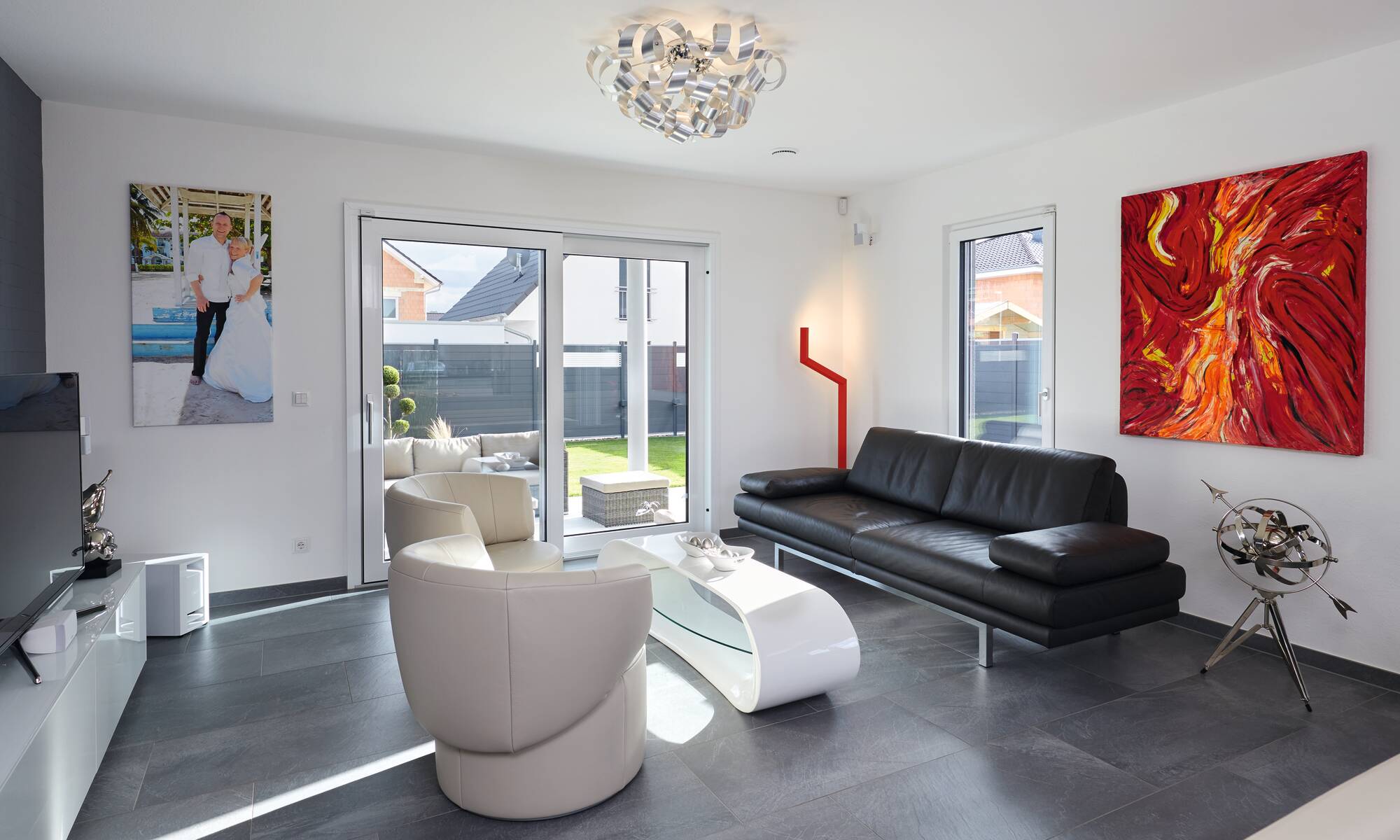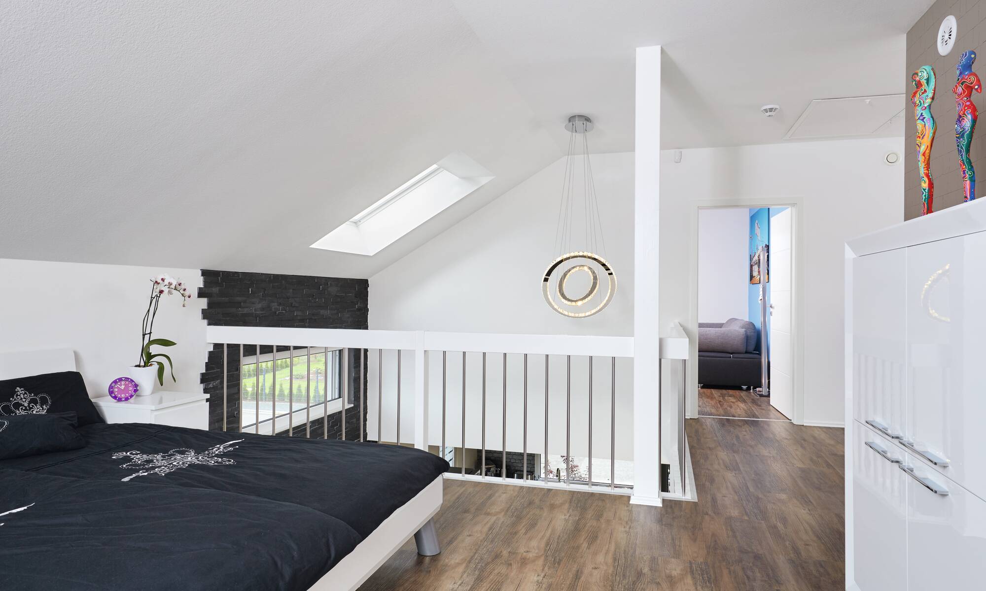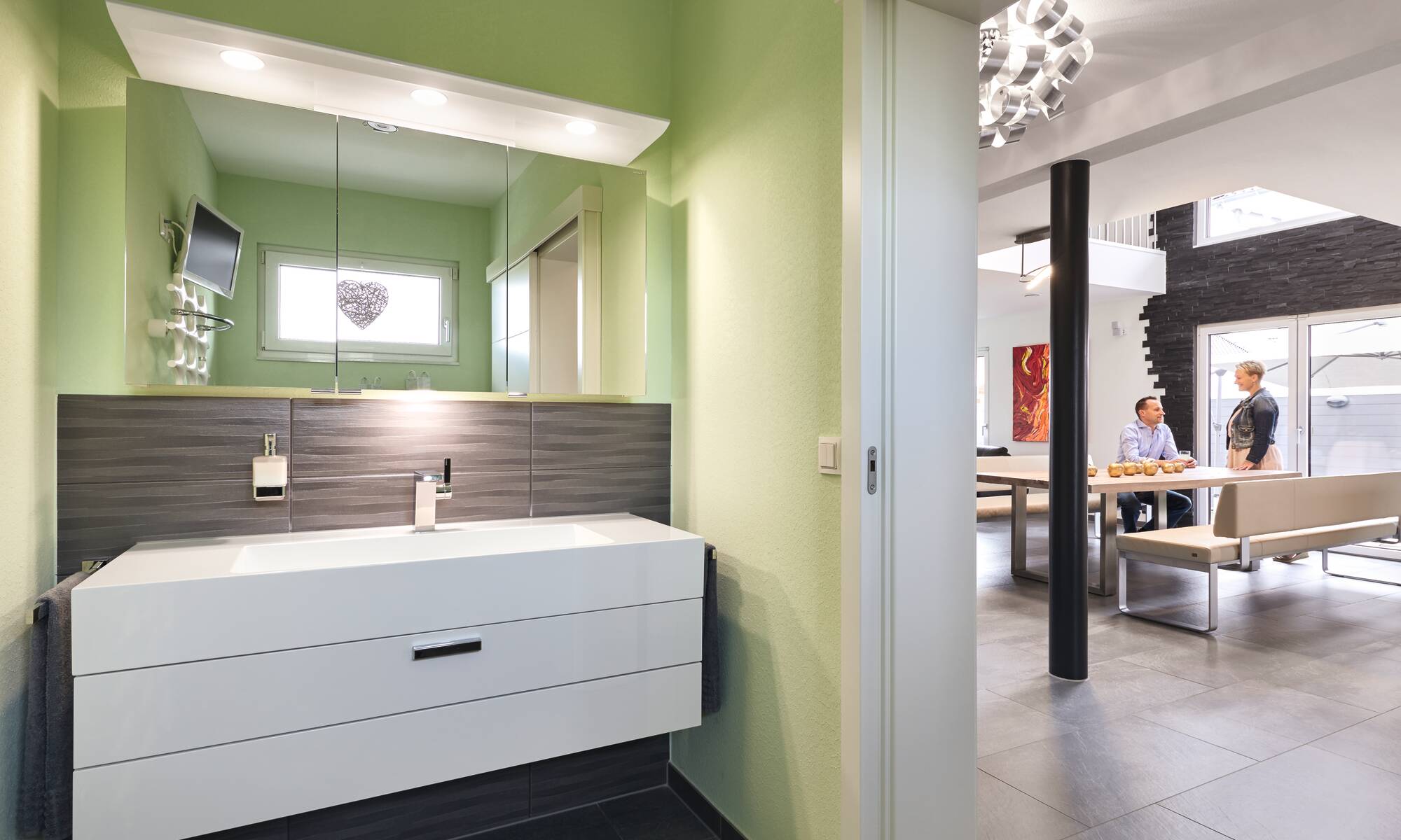 Als das Bauherrenpaar das Musterhaus in Bad Vilbel betrat, war es Liebe auf den ersten Blick: „Wir haben mit unserem Berater und dem Architekten einige Anpassungen vorgenommen, aber im Großen und Ganzen ist es das Haus geblieben, in das wir uns sofort verliebt haben“, verrät die stolze Bauherrin. Das versetzte Pultdach und die schön abgestimmten Grautöne der Fassade haben im Wohngebiet schon für viel Aufsehen gesorgt. Im Inneren des Entwurfes nach generation5.5 spiegelt sich die Persönlichkeit der Bauherren wieder. Geflieste Wandbereiche, praktische Lösungen und ein offenes Schlafzimmer sind ebenso individuell umgesetzte Wünsche wie die smarte Haussteuerung und die große Terrasse.