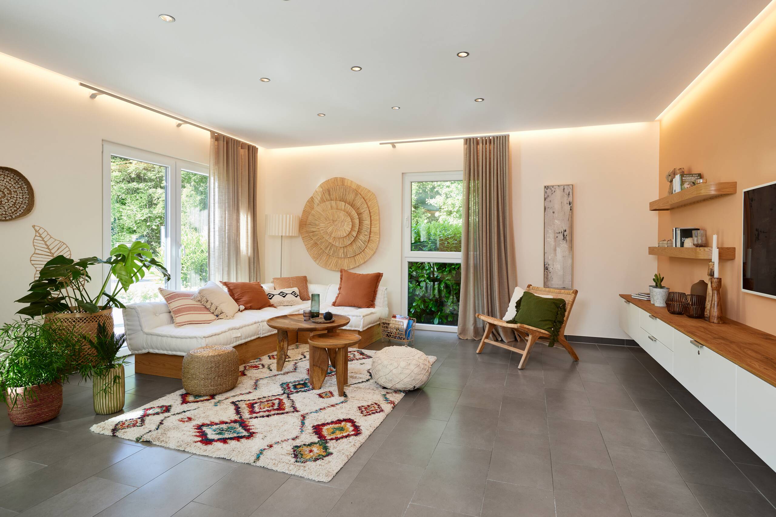 Großzügige Grundrisse. Moderne, reduzierte Formen. Und mit dem leicht versetzten Pultdach beste Voraussetzungen für eine Photovoltaikanlage: So könnte Ihr generation5.5 als PlusEnergie-Haus aussehen. Auf 1 ½ Geschossen ist reichlich Platz für Komfort-Extras wie die große Terrasse mit Pergola, die vom Wohn-Essbereich in den Garten führt. Das Büro oder Gästezimmer im Erdgeschoss. Oder die große Ankleide neben dem Elternschlafzimmer. Optionen? Viele. Zum Beispiel eine Garage mit überdachter Verbindung zum Haus und zusätzlichem Abstellraum.