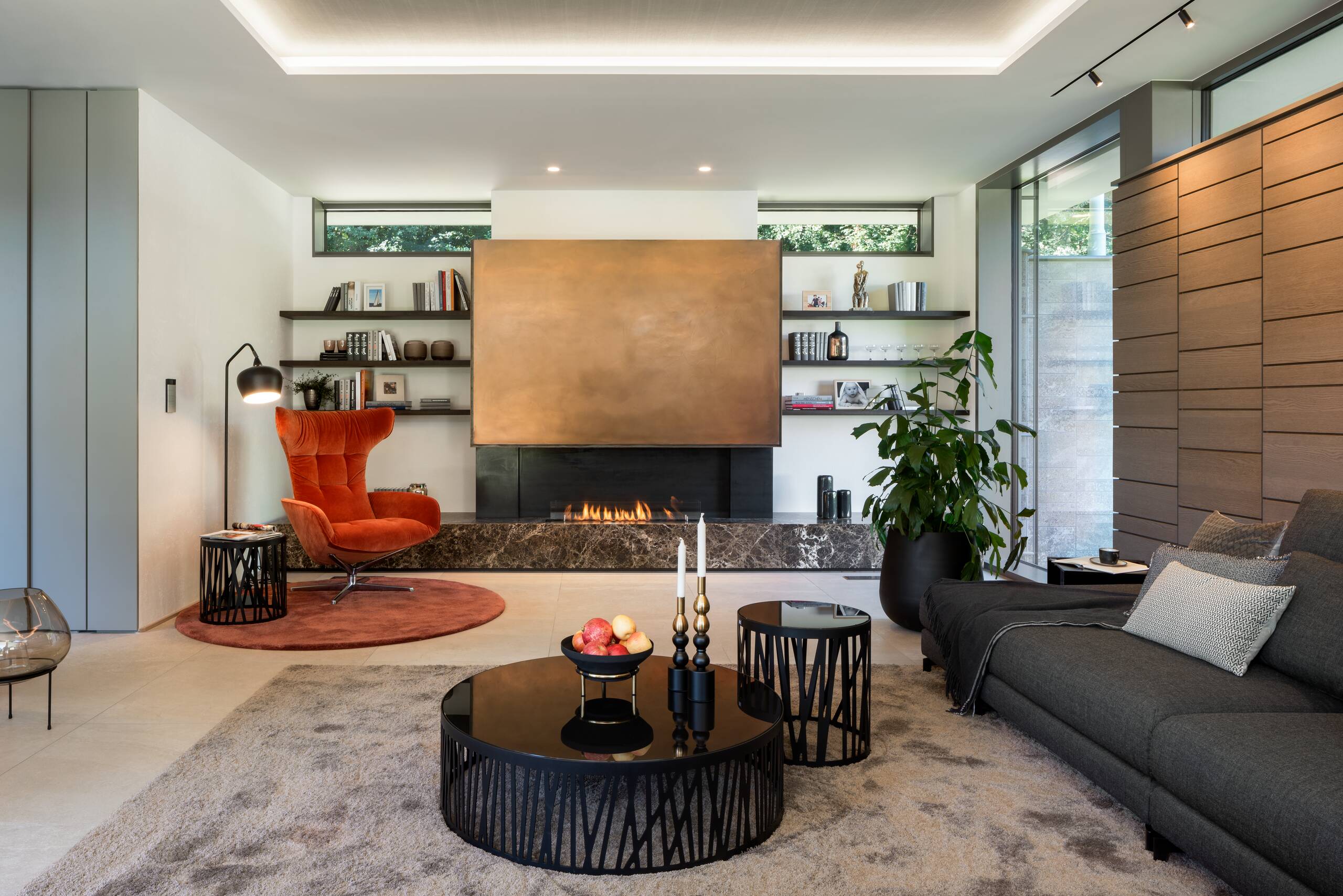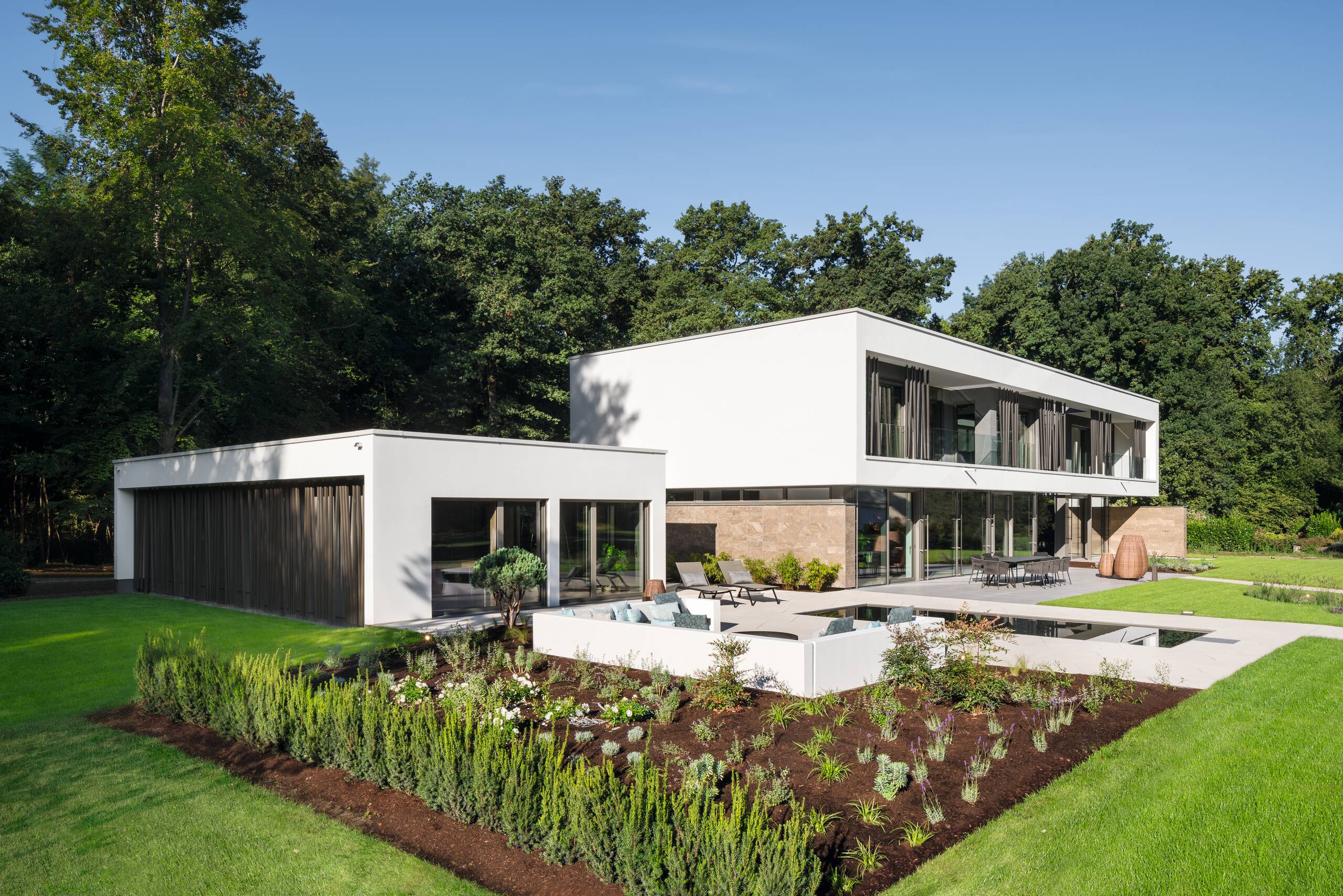 Das luxuriöse Musterhaus überzeugt mit seinen klaren Linien und der modernen Architektur, die unverkennbar der Tradition des Bauhauses entstammt. Entworfen hat das eindrucksvolle Fertighaus der Londoner Architekt Nick Blunt. Der Baukörper misst eine Länge von 25 Metern, während die Haustiefe neun Meter beträgt. Große, bodentiefe Glaselemente öffnen das Einfamilienhaus zur Gartenseite und lassen viel Tageslicht ins Hausinnere. Betritt man das rund 335 Quadratmeter große Haus, lassen sich bereits auf den ersten Blick die großzügigen Raumverhältnisse erfassen. Das Eingangsgeschoss ist unterteilt in ein Wohnzimmer, das über eine geschosshohe, in die Wand integrierte Tür dezent verborgen werden kann. Der zweite Bereich besteht aus einem offenen Koch-Essbereich. Nebenräume wie ein Abstellraum, ein WC, der Aufzug und ein Secret Room als Bar sind wie ein raumhohes Möbel ins Erdgeschoss eingestellt. Im Obergeschoss liegt der Elterntrakt mit Schlafzimmer, Wellness-Bad und großzügiger Ankleide. Zwei Kinderzimmer jeweils mit eigenem Bad sowie ein Büro komplettieren das Raumangebot im Obergeschoss. Als eigenständiges Gebäude stehen eine Doppelgarage sowie ein Wellnessbereich mit Sauna, WC und Aquamoon-Dusche neben dem Haupthaus. Die hochwertige Detaillierung und die handwerkliche Qualität fallen besonders auf. Nichts in dieser Villa ist Standard.