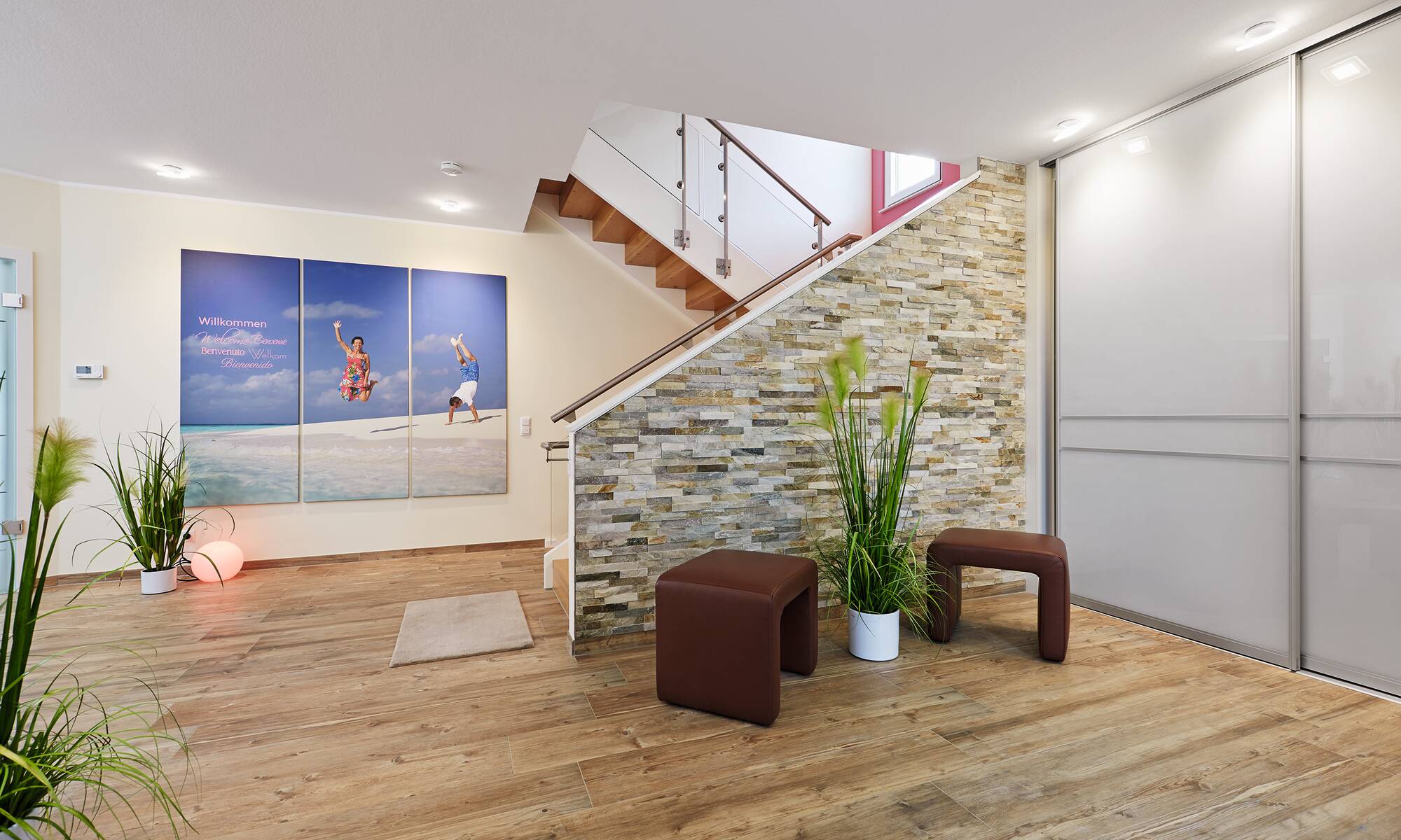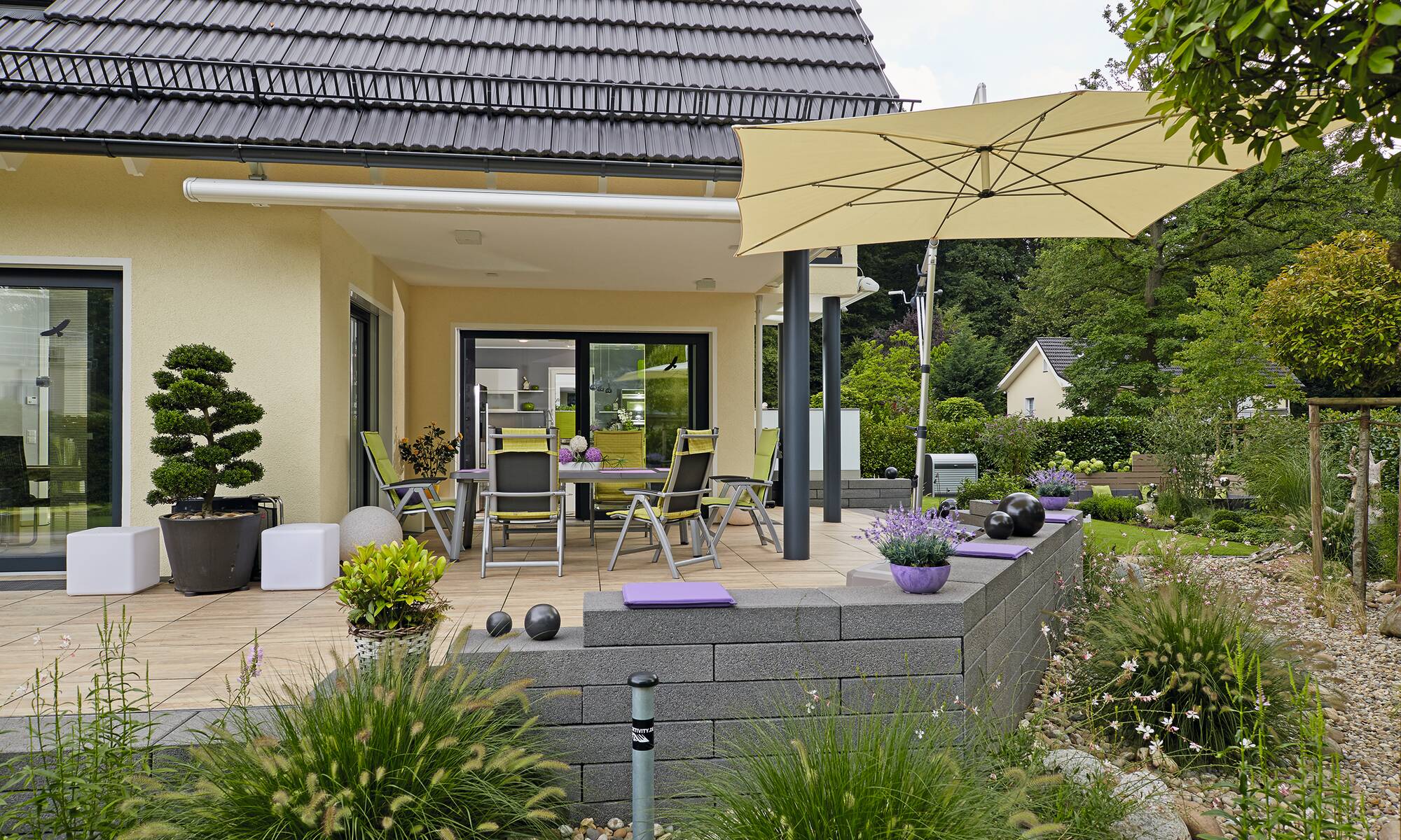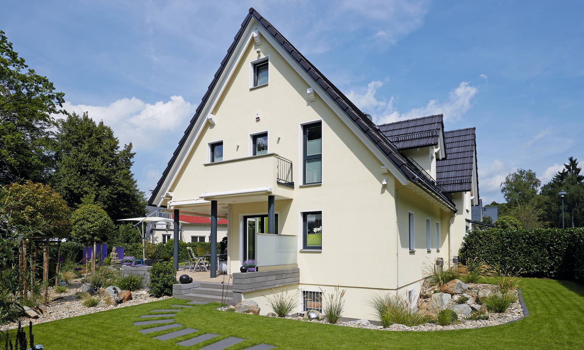 Mit diesem frei geplanten Architektenhaus hat sich das Bauherrenpaar ihre Wohlfühloase erschaffen. Es verfügt über drei Giebel, zwei Balkone, eine Garage sowie einen Wohnkeller. Das steile Satteldach in Kombination mit dem hellgelben Putz und den anthrazitgrauen Fensterahmen und Ziegeln verleiht dem Eigenheim ein modernes Aussehen.