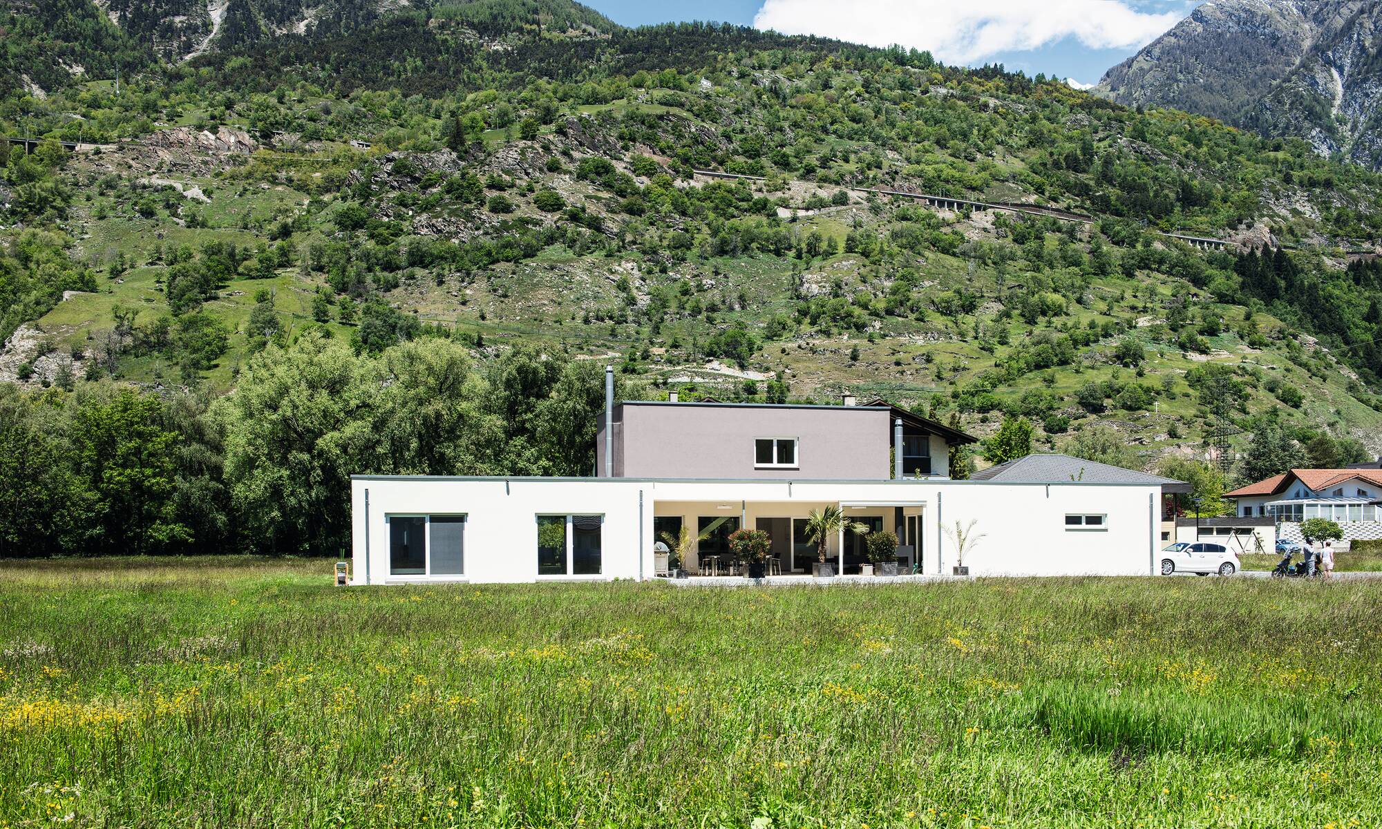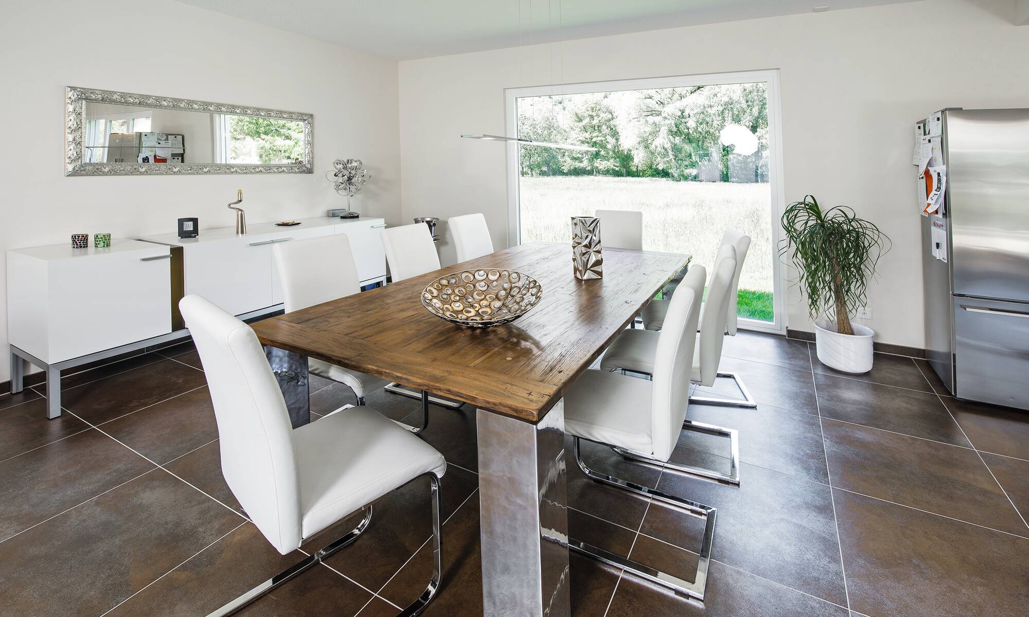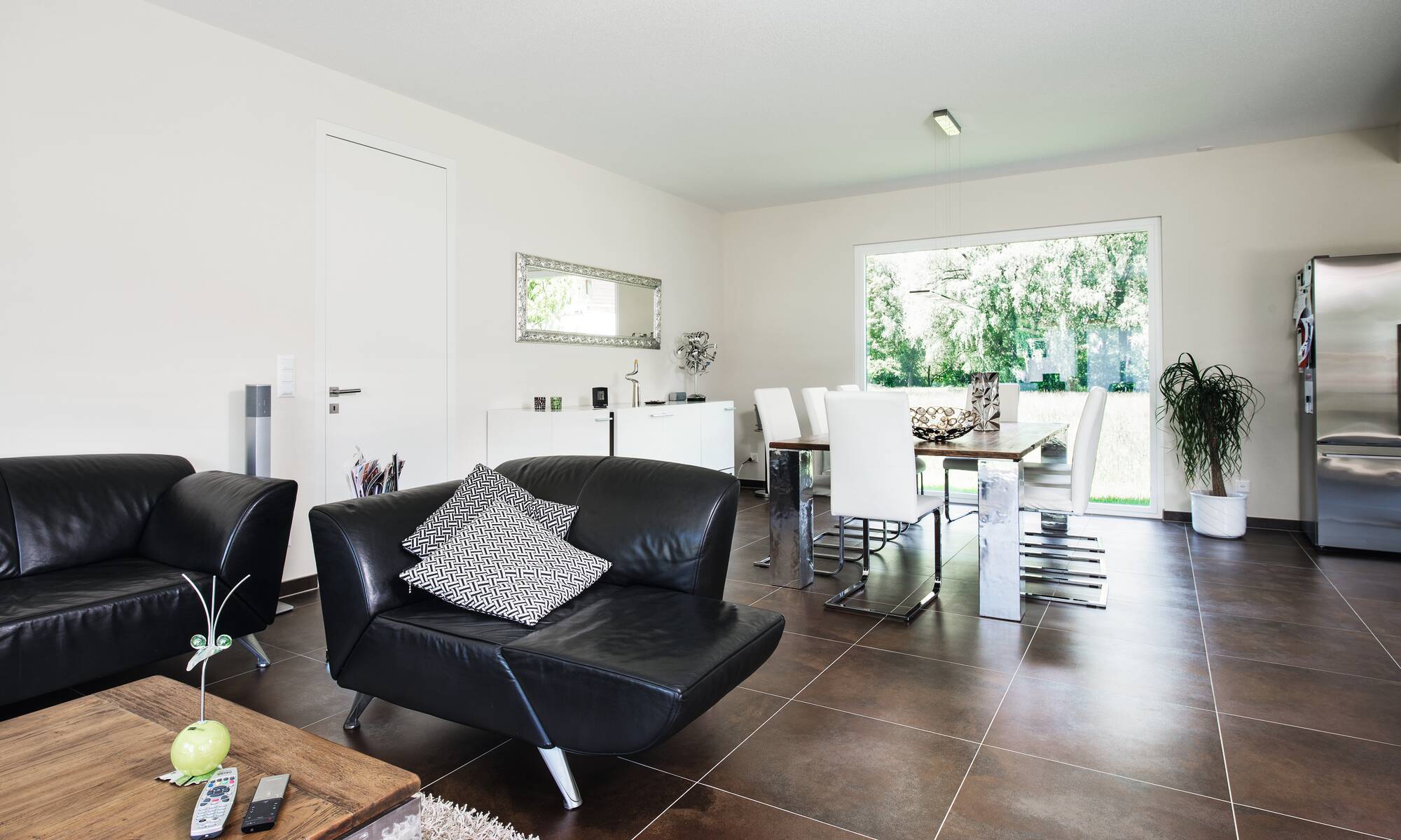 Am Rande eines idyllisch gelegenen Schweizer Örtchens realisierte eine Baufamilie diesen exklusiven Bungalow mit u-förmigem Grundriss und großer Terrasse. Die geschickte Raumeinteilung, die sich durch den schmalen Grundriss ergeben hat, erleichtert den gesamten Tagesablauf der Familie: „Keller, Garage und Hauswirtschaftsraum sind ideal miteinander verbunden. So kann man Einkäufe schnell in den Keller bringen oder die Wäsche machen, bevor es in den Wohnbereich geht“, so der Bauherr. Inspiriert durch italienische Einrichtungshäuser entstand ein mediterranes Raumkonzept, bei dem Braun- und Beigetöne dominieren. Im Bekanntenkreis gilt der Bungalow als „schönstes Haus im Ort“. Der zufriedene Bauherr resümiert: „Im Nachhinein würden wir alles wieder genauso machen.“