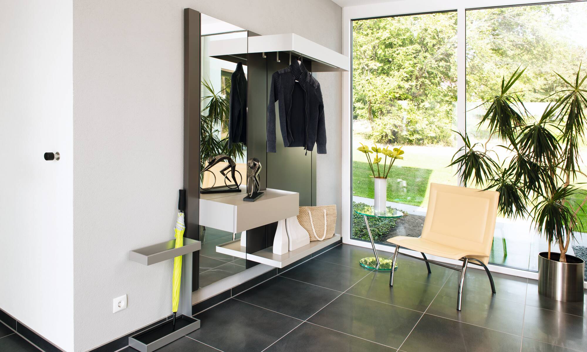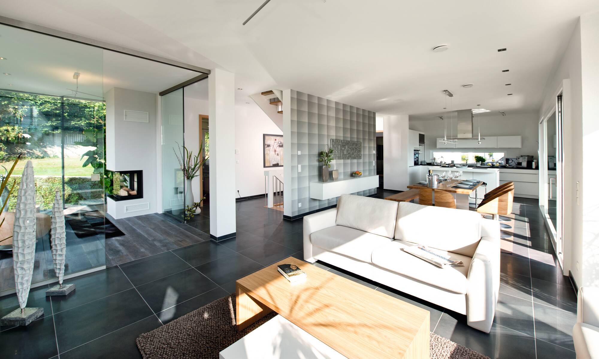In unserem Ausstellungshaus in Villingen-Schwenningen trifft der Charme eines gemütlichen Einfamilienhauses auf die Eleganz eines repräsentativen Wohnhauses. Die Architektur des frei geplanten Architektenhauses von WeberHaus Individual ist durch eine kubische Bauform mit geraden Linien geprägt. Das Haus überzeugt im modernen und zugleich klassischen Bauhausstil. Unter dem Flachdach des zeitlosen Traumhauses verbergen sich zwei Vollgeschosse und damit jede Menge Raum zum Wohlfühlen, Entspannen und Glücklichsein. Anthrazitgraue Fensterrahmen bilden einen harmonischen Kontrast zur weiß verputzten Außenfassade.