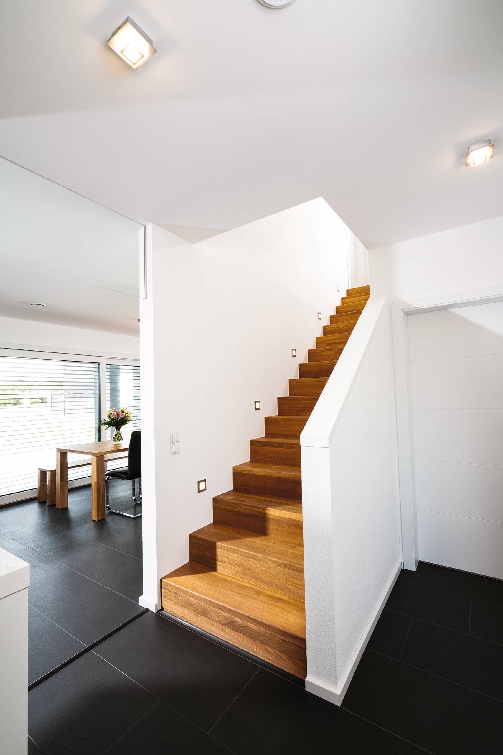 Der Rechteckerker sowie der zurückversetzte Eingangsbereich lockern den weißen Kubus auf. Farblich abgesetzte Gestaltungselemente an der Fassade setzen kleine Akzente. Eine Garage schließt an das Wohnhaus direkt an. Zum Garten hin öffnen sich große Fensterfronten, so dass reichlich Tageslicht in den offenen Wohn-, Ess- und Küchenbereich gelangt. Über eine großzügige Schiebetür erreicht man die Terrasse. Der Balkon darüber spendet Schatten und lädt zum Verweilen ein.