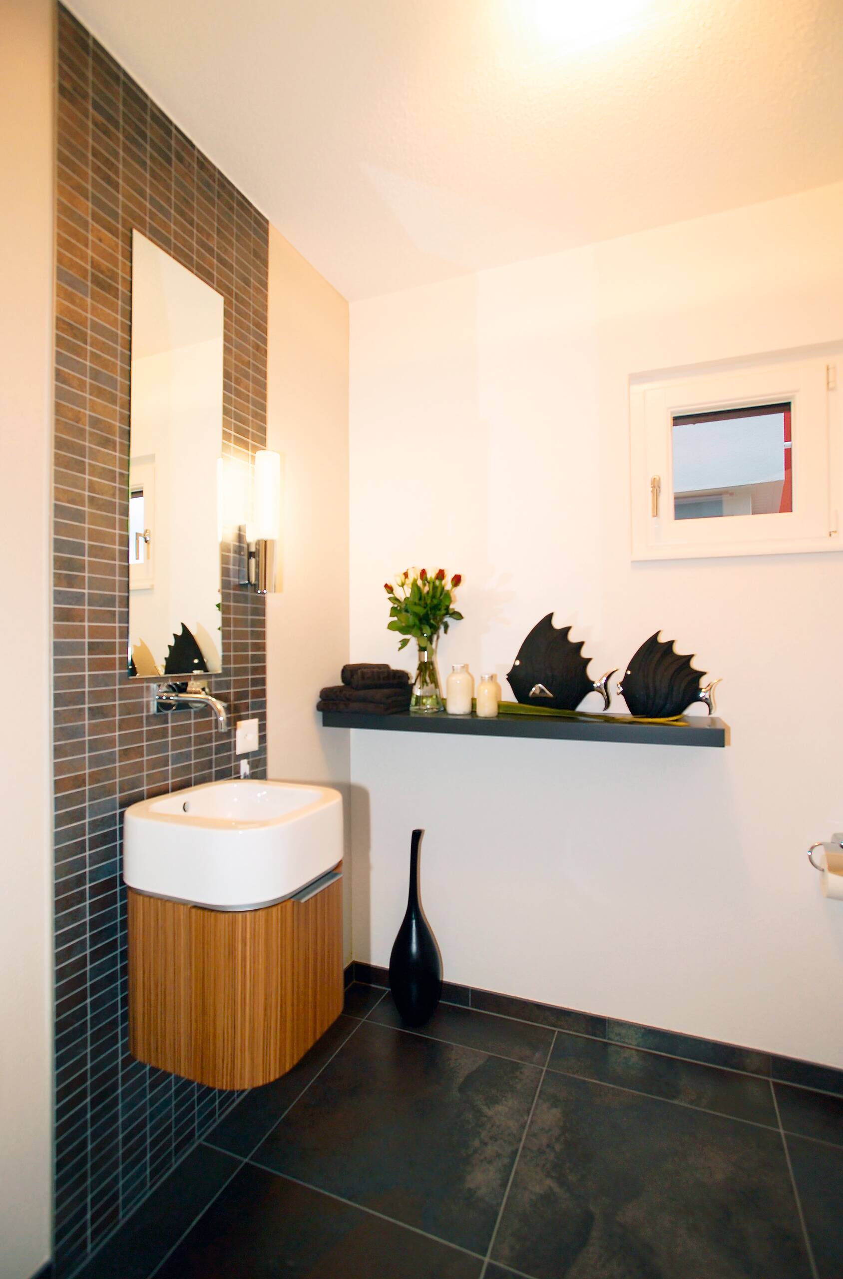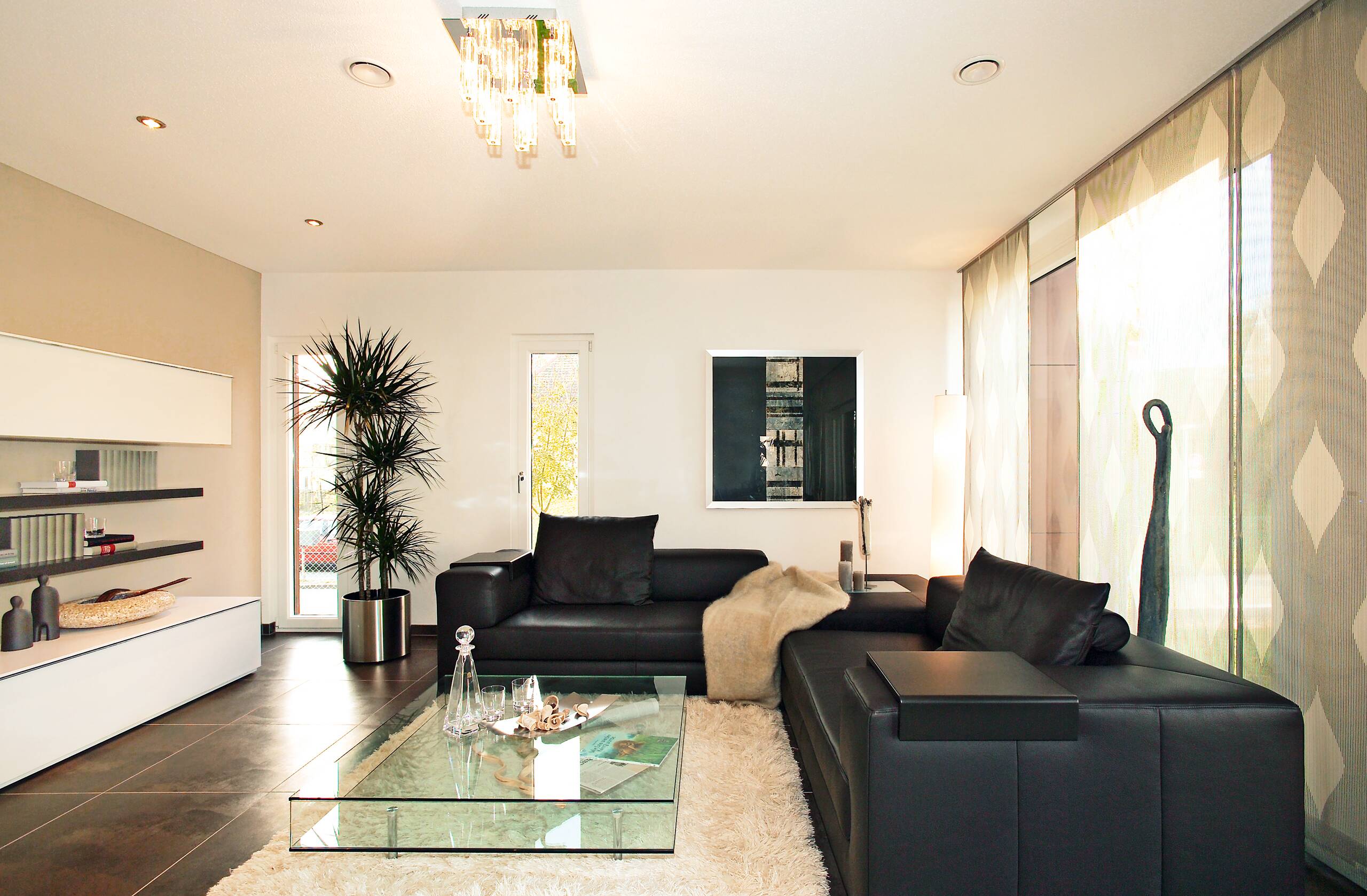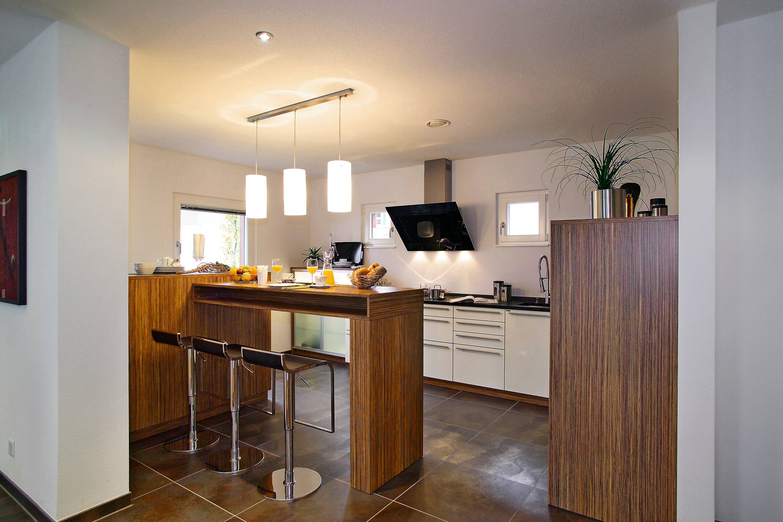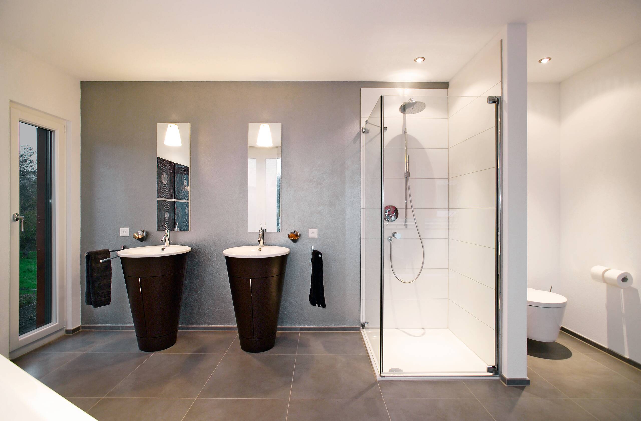 Großformatige Bodenfliesen im Eingangsbereich spiegeln die Großzügigkeit des Entwurfs wider. Die Aufteilung der Innenräume ist offen, kommunikativ und geradlinig mit klarer Gliederung der Funktions- und Rückzugsräume. Die Gestaltung der Räume sowohl im Erdgeschoss als auch im Obergeschoss lassen durch die zentrale Treppenposition sämtliche Variationen der Grundrissgestaltung zu.