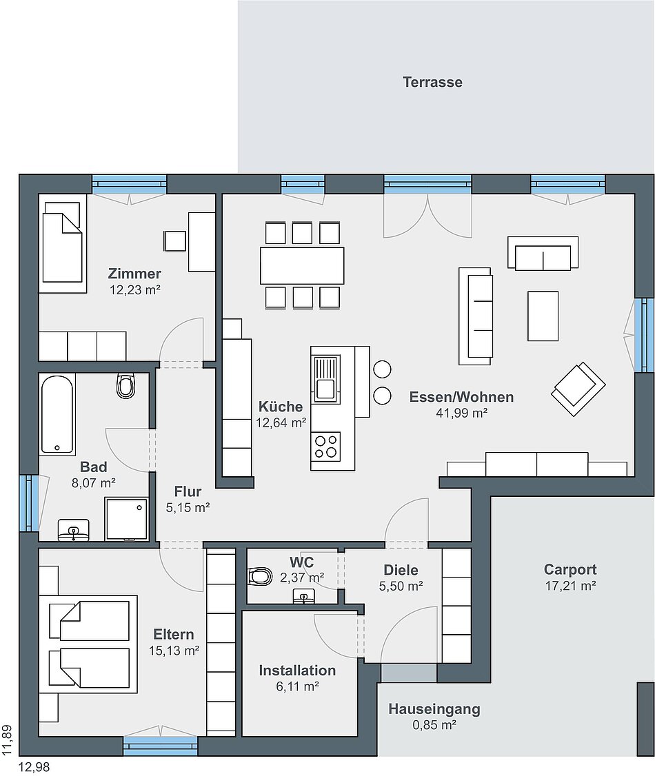 Die Terrasse für sonnige Tage und laue Nächte. Ein echter Hingucker dank der attraktiven Kombination aus Holz und Putz. Und auch die inneren Werte stimmen. Der offene Wohn- und Essbereich mit integrierter Küche wird schnell zum kommunikativen Mittelpunkt des Hauses. Ein kleiner Flur verbindet das Bad mit dem Schlafzimmer und einem weiteren Raum.