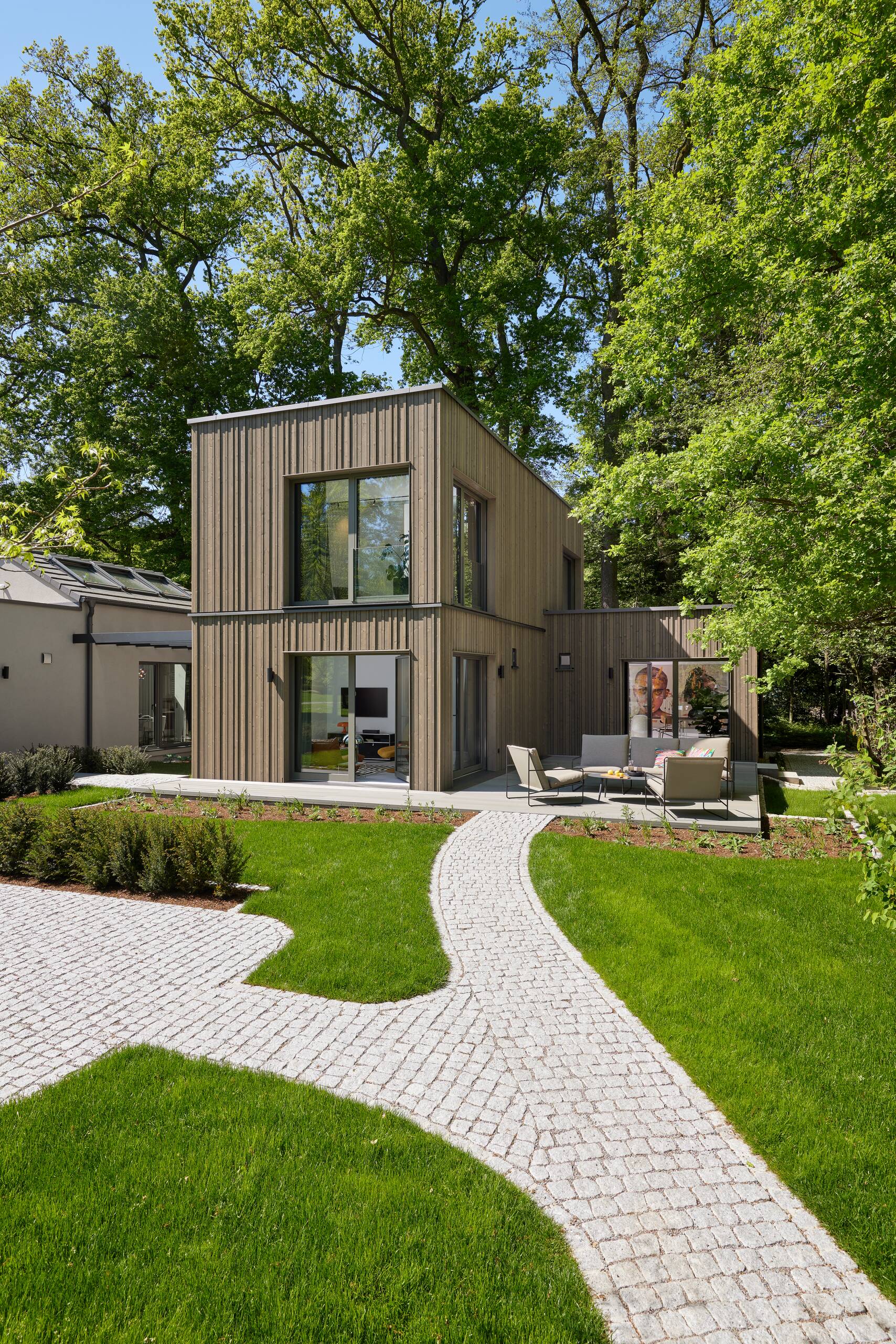 Dieser Entwurf aus der Baureihe OPTION präsentiert eine zweigeschossige Variante mit praktischem Anbaumodul, das neben dem Essbereich oder optional neben der Küche platziert werden kann. Wie alle Häuser dieser Reihe überzeugt es durch klare Linien und minimalistische Architektur, die sich auf das Wesentliche konzentriert. Die edle Holzfassade strahlt Ruhe und Wärme aus, während die großzügigen Fenster lichtdurchflutete Räume schaffen. Perfekt für Singles oder Paare, bietet das zweigeschossige Haus mit Anbaumodul ein durchdachtes Raumkonzept mit einem geräumigen Schlafzimmer und einem separaten Home-Office. Der funktionale Grundriss und das klare Design schaffen eine harmonische Atmosphäre – ohne überflüssigen Ballast, dafür mit Fokus auf Komfort und moderne Eleganz.