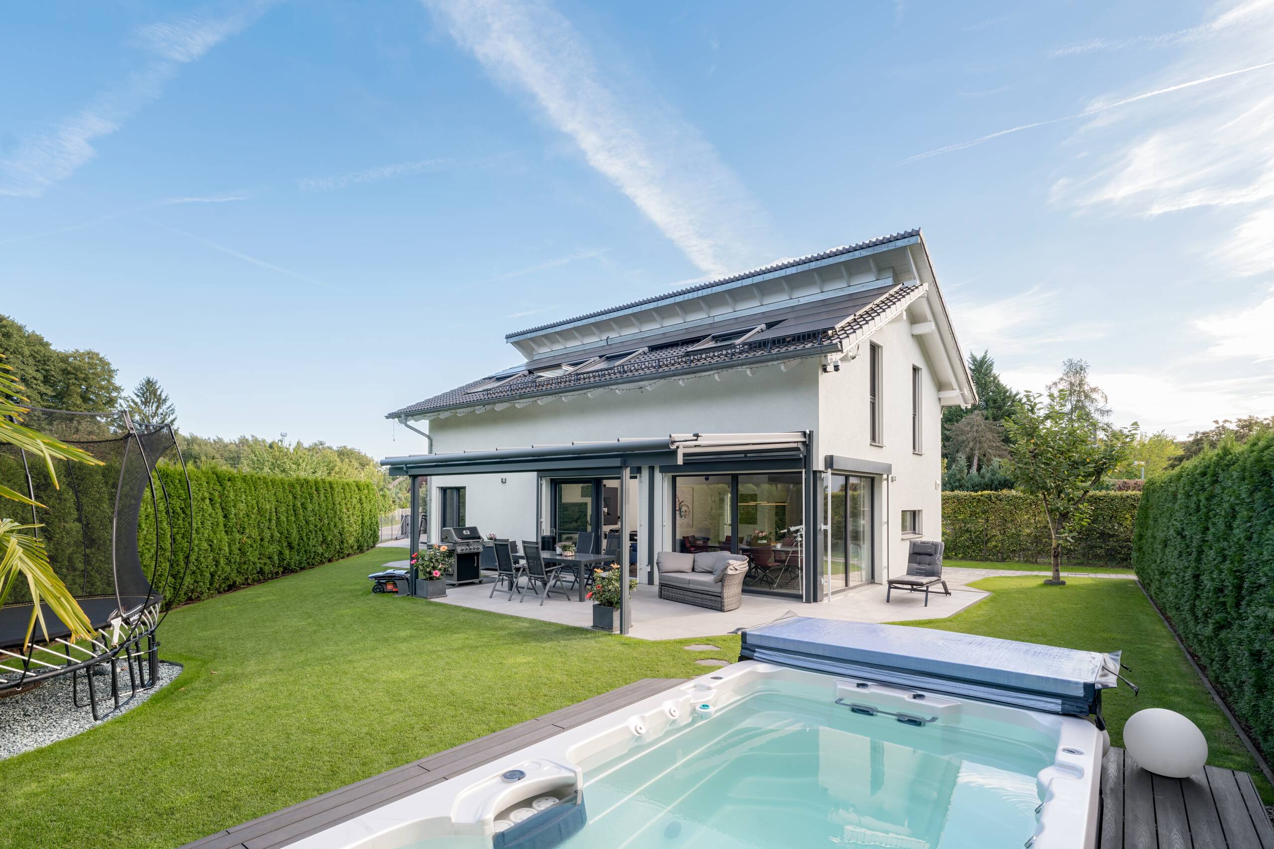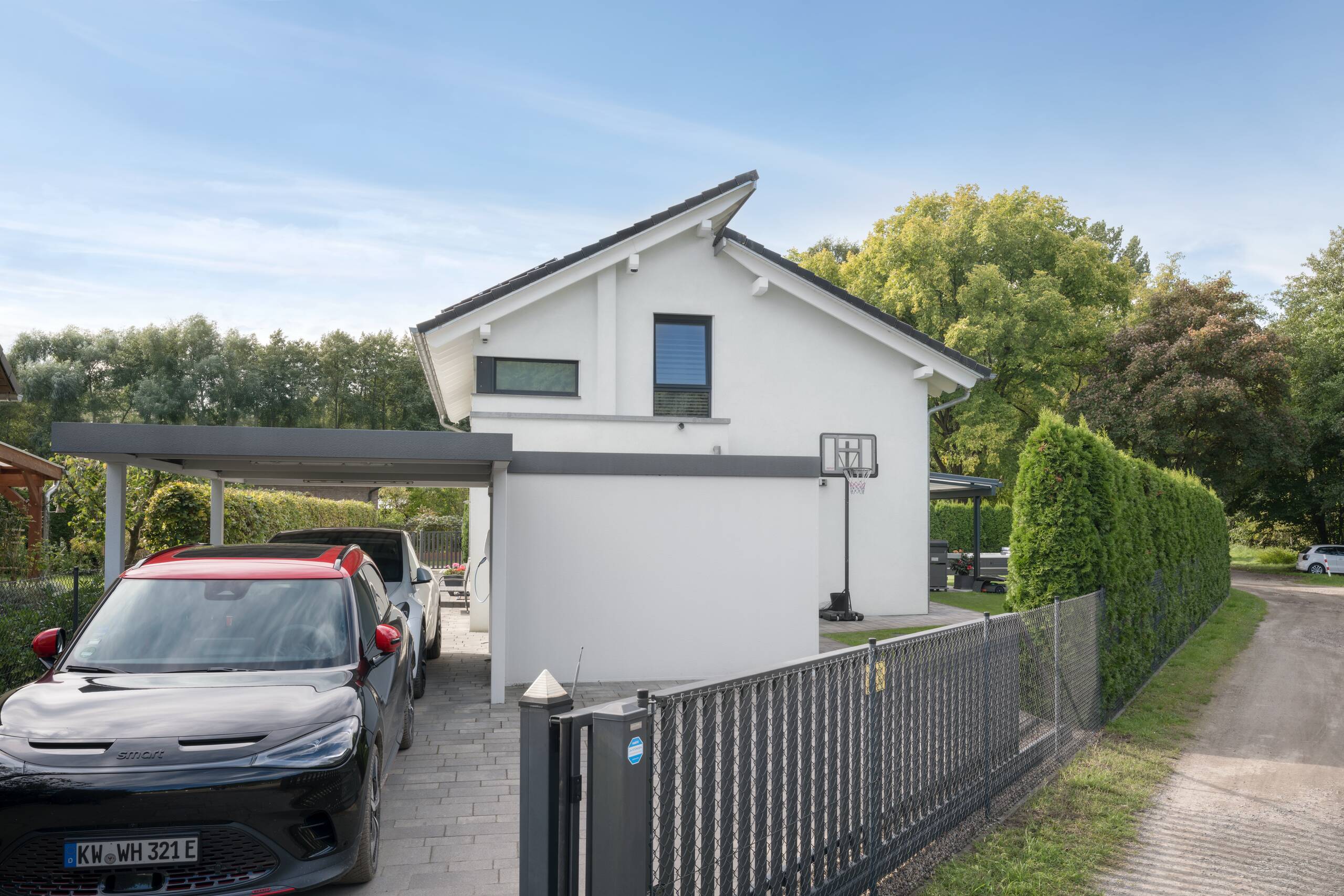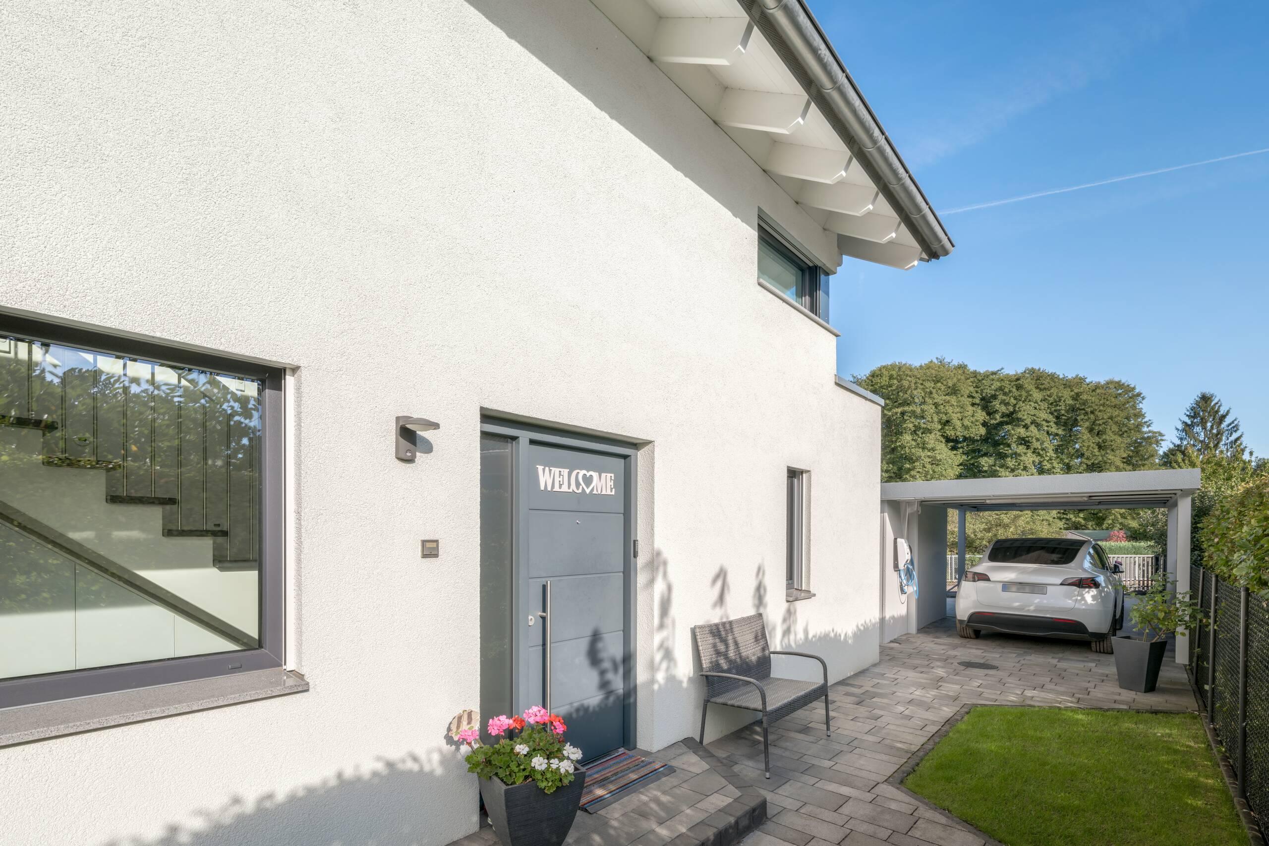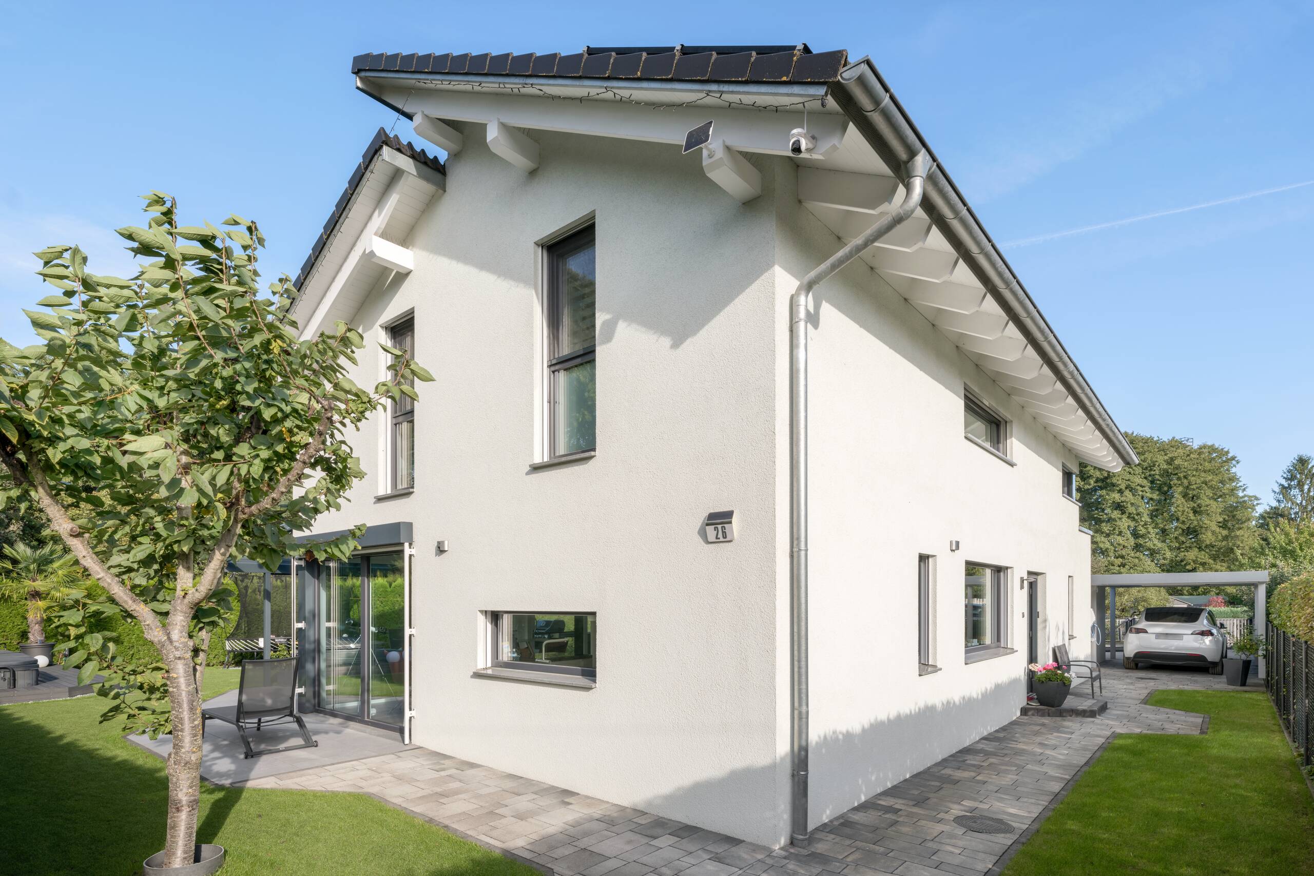 Dieses moderne Familienhaus zieht mit seiner ungewöhnlichen Dachform alle Blicke auf sich. Das versetzte Pultdach verleiht dem Gebäude nicht nur eine dynamische Silhouette, sondern bietet auch optimale Voraussetzungen für die Installation einer leistungsstarken Photovoltaikanlage. Der schlichte, weiß verputzte Baukörper wird erweitert von einer eingeschossigen Auslucht, die Platzgewinne im Innern schafft. Trotz seiner grosszügigen Abmessungen von 13,66 x 8,10 m wirkt er leicht und offen. Das ist vor allem den Fenstern und Verglasungen in unterschiedlichsten Formaten zu verdanken.