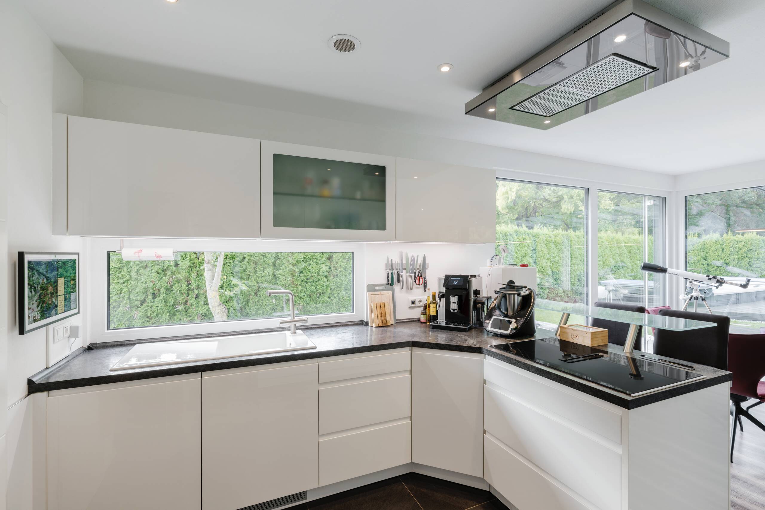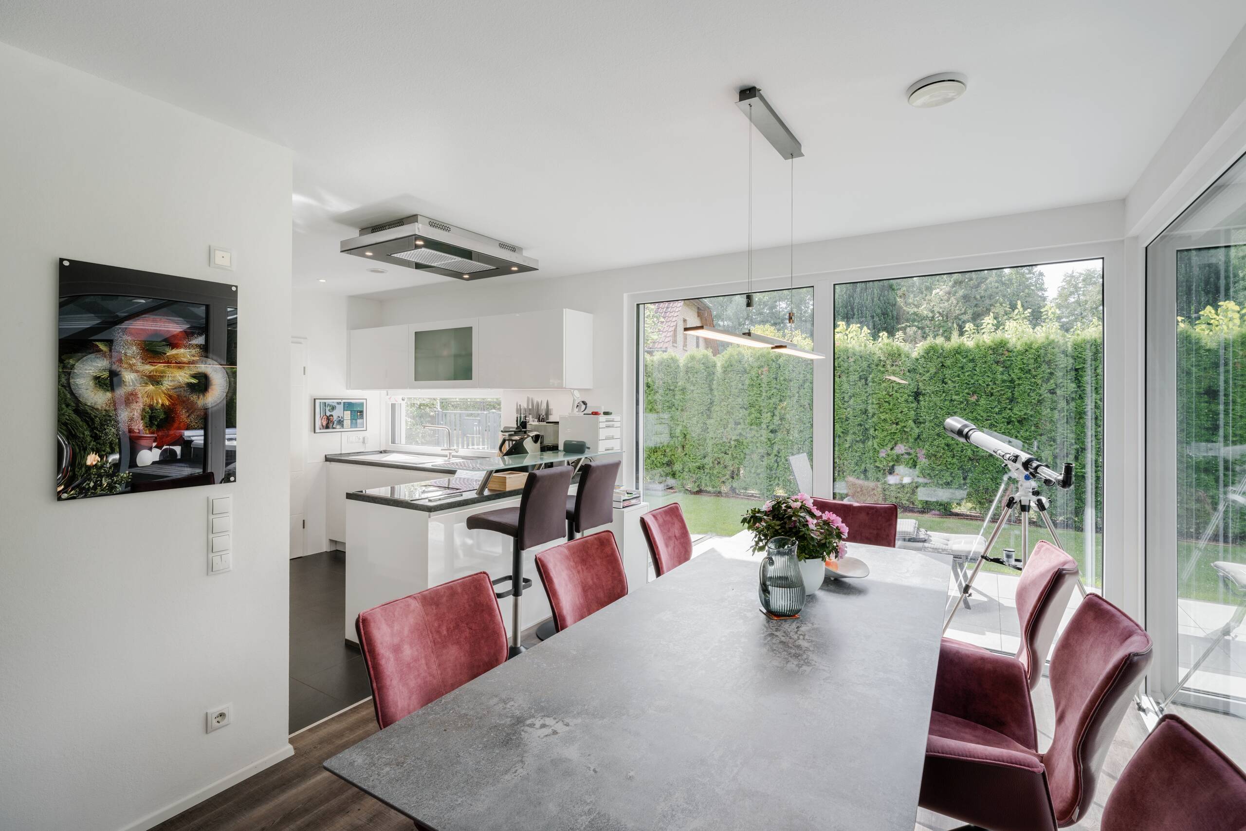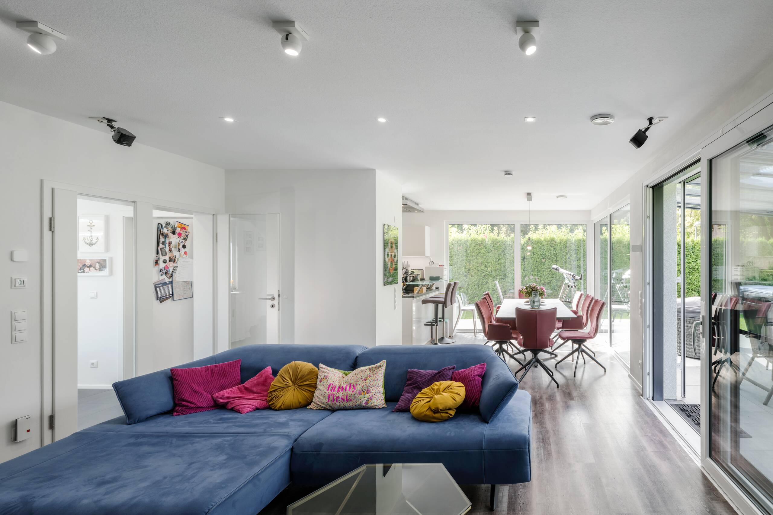 Dieses moderne Familienhaus zieht mit seiner ungewöhnlichen Dachform alle Blicke auf sich. Das versetzte Pultdach verleiht dem Gebäude nicht nur eine dynamische Silhouette, sondern bietet auch optimale Voraussetzungen für die Installation einer leistungsstarken Photovoltaikanlage. Der schlichte, weiß verputzte Baukörper wird erweitert von einer eingeschossigen Auslucht, die Platzgewinne im Innern schafft. Trotz seiner grosszügigen Abmessungen von 13,66 x 8,10 m wirkt er leicht und offen. Das ist vor allem den Fenstern und Verglasungen in unterschiedlichsten Formaten zu verdanken.