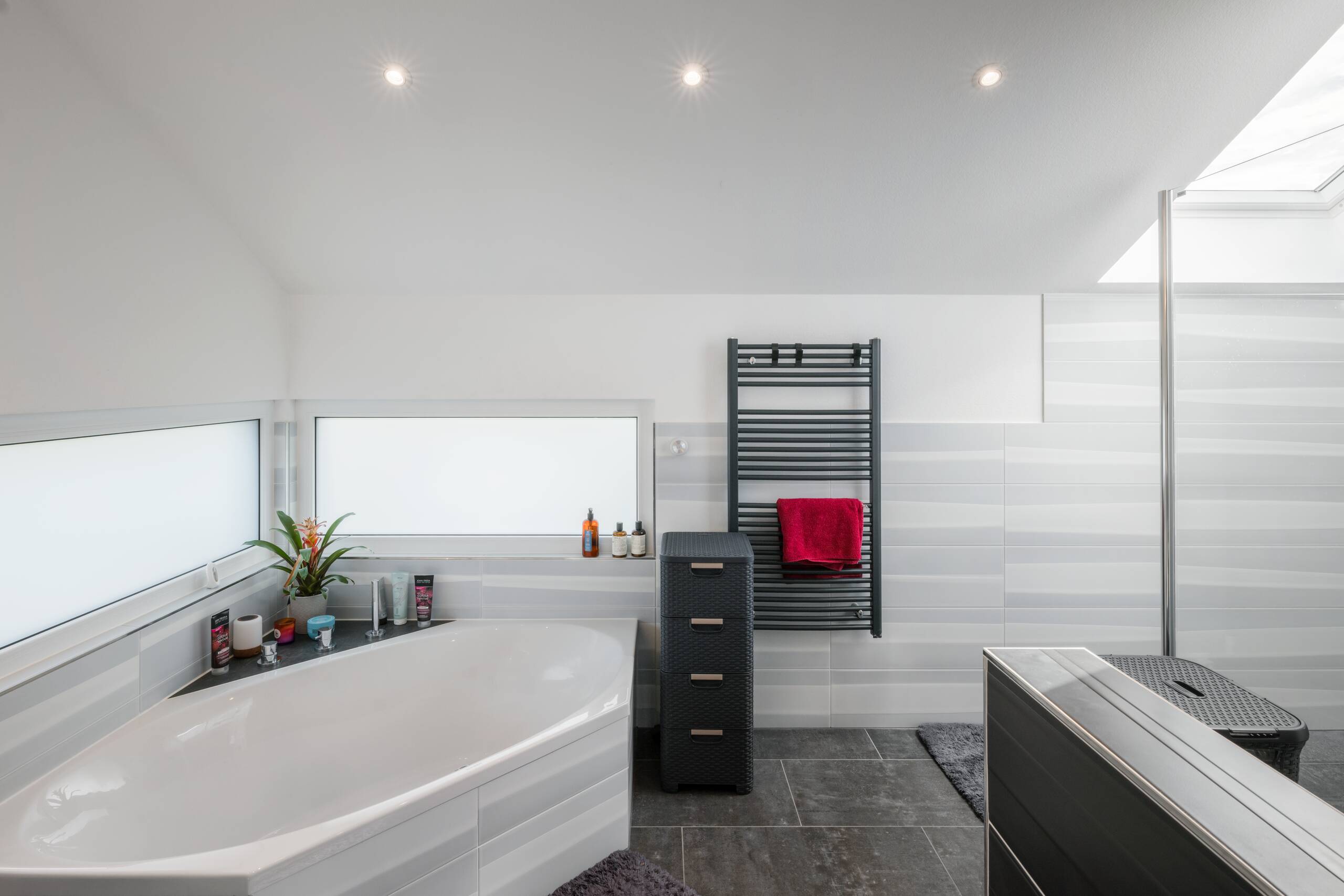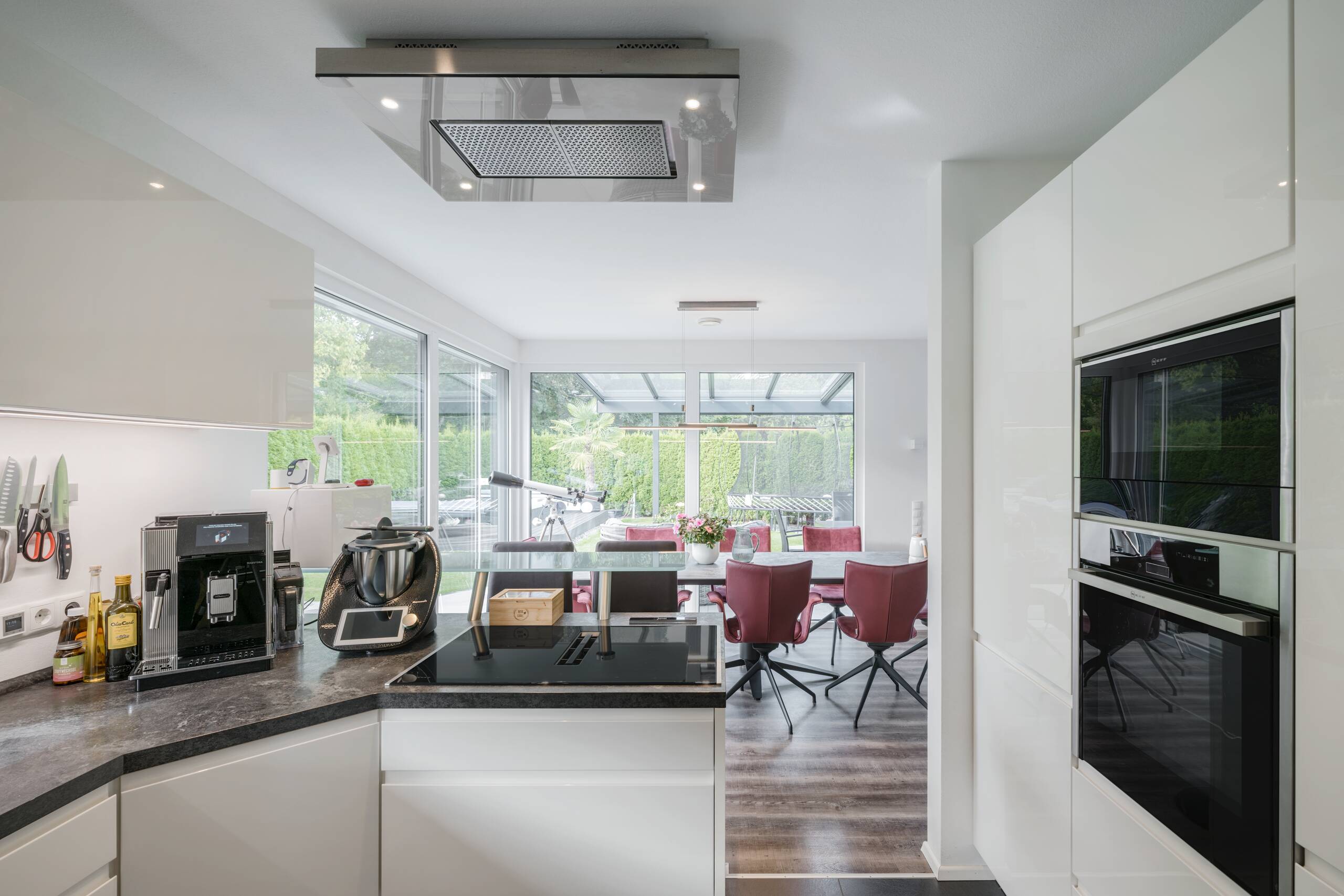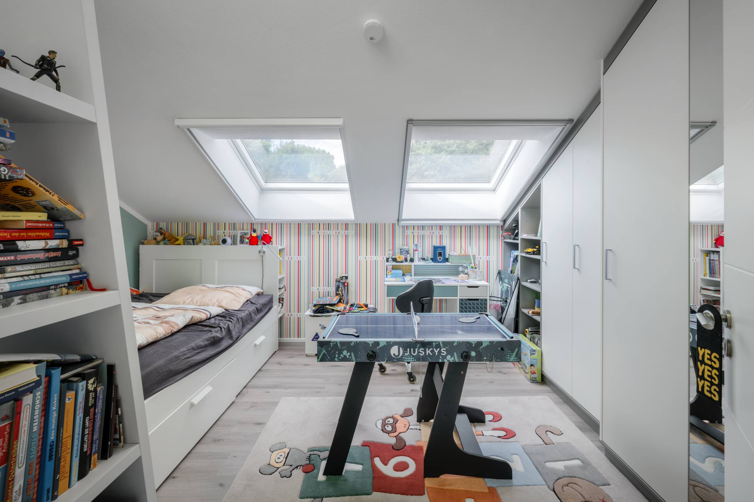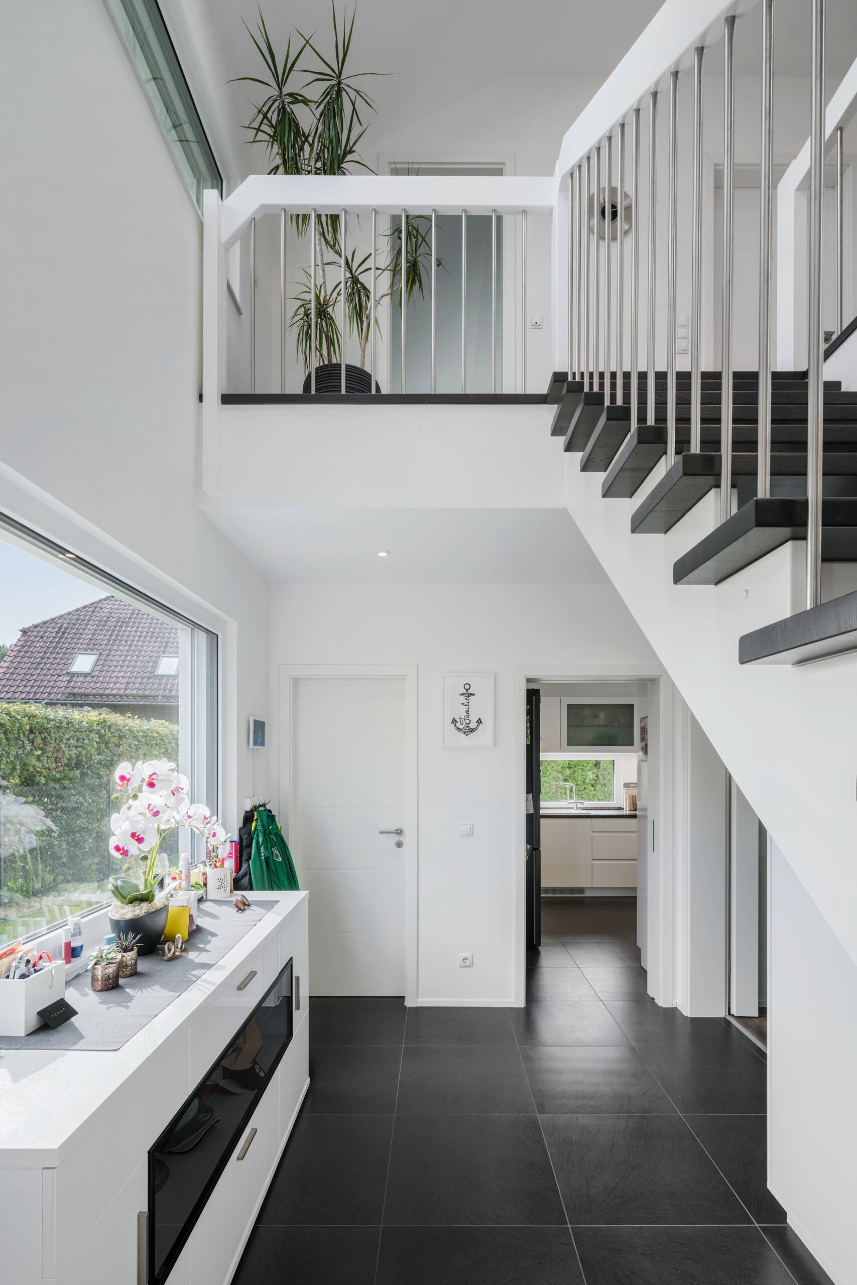 Dieses moderne Familienhaus zieht mit seiner ungewöhnlichen Dachform alle Blicke auf sich. Das versetzte Pultdach verleiht dem Gebäude nicht nur eine dynamische Silhouette, sondern bietet auch optimale Voraussetzungen für die Installation einer leistungsstarken Photovoltaikanlage. Der schlichte, weiß verputzte Baukörper wird erweitert von einer eingeschossigen Auslucht, die Platzgewinne im Innern schafft. Trotz seiner grosszügigen Abmessungen von 13,66 x 8,10 m wirkt er leicht und offen. Das ist vor allem den Fenstern und Verglasungen in unterschiedlichsten Formaten zu verdanken.