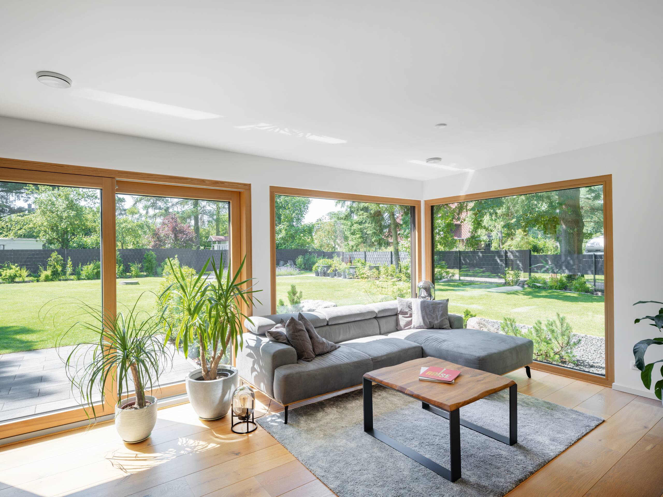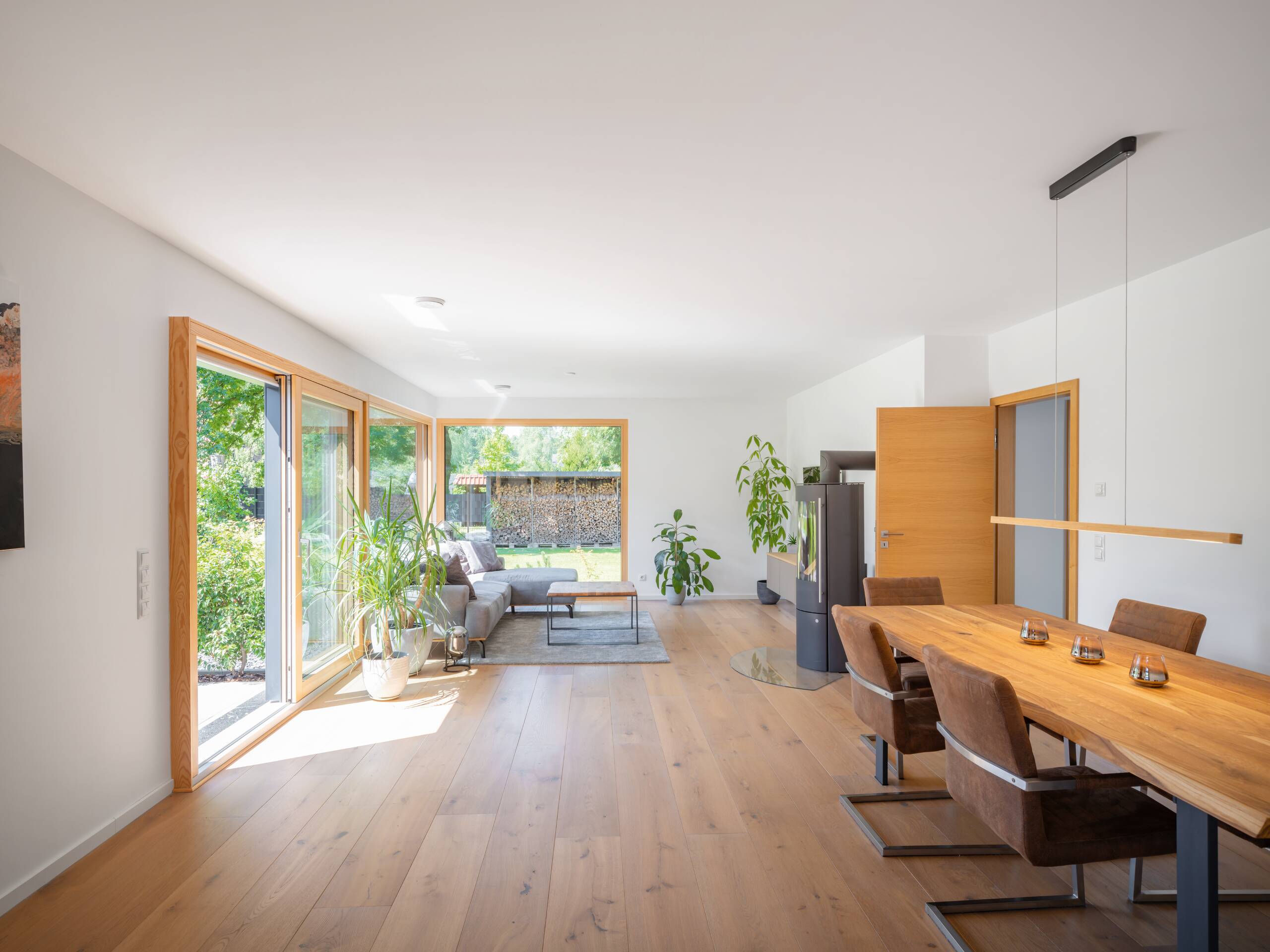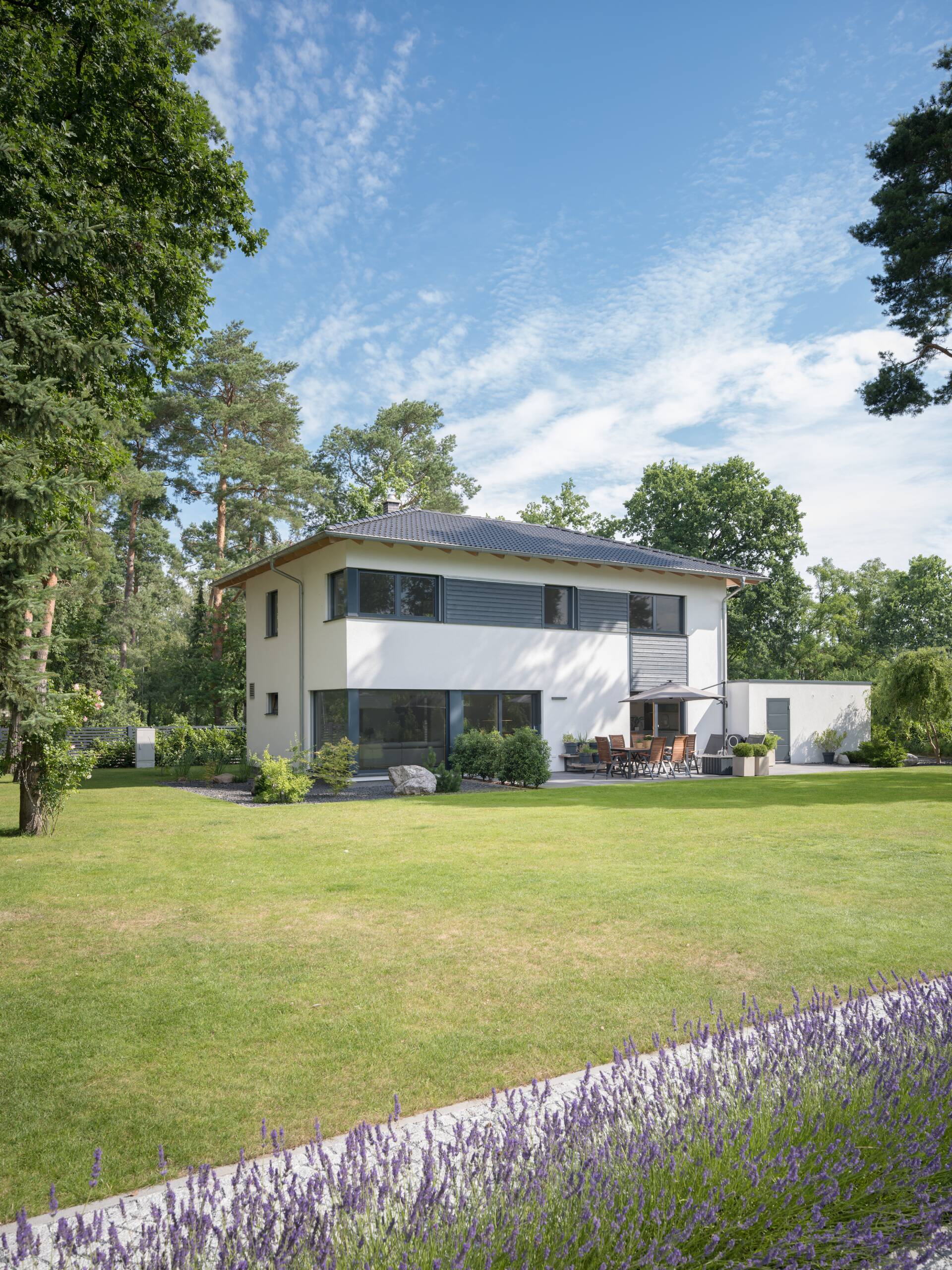 Geradlinig und schnörkellos präsentiert sich diese Villa. Im Zentrum steht ein quaderförmiger Baukörper, der von einem eleganten, dunkel eingedeckten Walmdach gekrönt wird. Ins Auge fallen die anthrazitfarbenen Holzverschalungen am Obergeschoss, die einen schönen Kontrast zur strahlend weißen Putzfassade bilden. Während sich das Gebäude zur Strassenseite eher geschlossen zeigt, öffnet es sich zum Garten hin mit raumhohen Verglasungen.