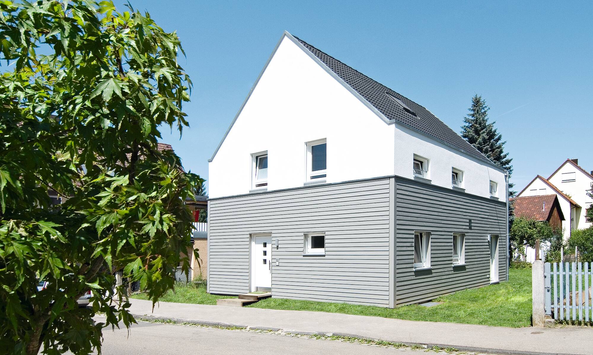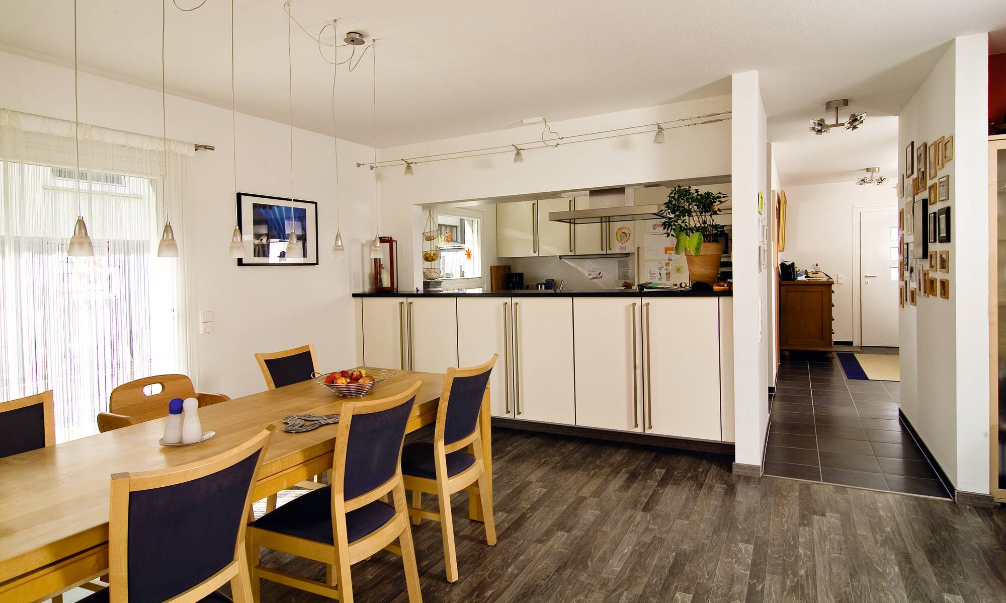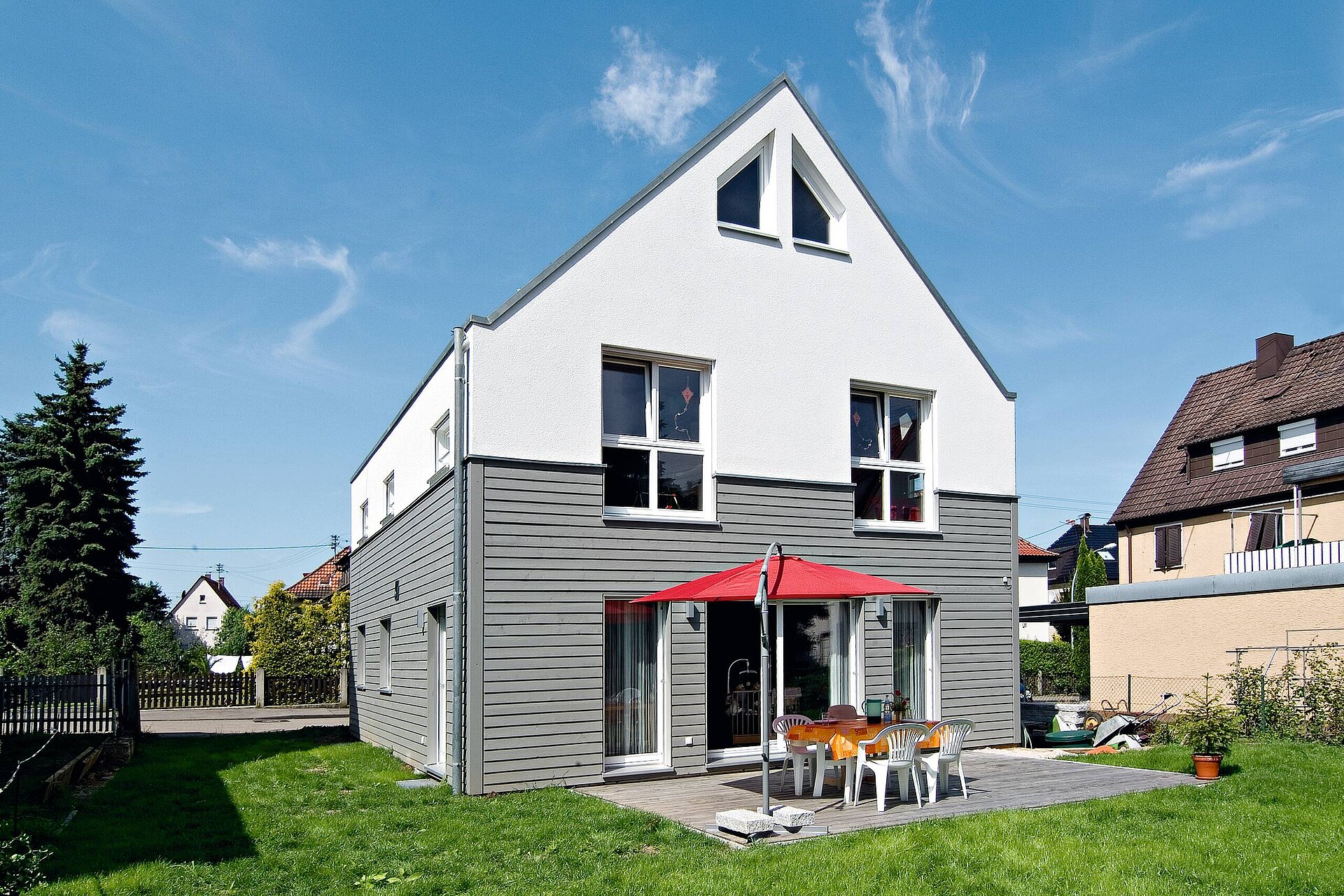 Schon lange träumte Familie Wolfer von einem eigenen Haus mit einem offen gestalteten Wohn-Ess-Bereich. Dieser Wunsch wurde mit einem frei geplanten WeberHaus schnell Realität. Klare Linien und symmetrische Formen prägen die Architektur des schmucken Stadthauses. So sind auf einer kleinen Grundfläche ganze 131 Quadratmeter Wohnfläche entstanden. Und daraus können bei Dachbodenausbau sogar noch mehr werden. Melanie Wolfer findet die Galerie unter dem Satteldach besonders schön und auch, dass sie durch die großen Glasschiebetüren im Erdgeschoss ihre Kinder beim Spielen im Garten immer im Blick hat. Ihr Mann Axel ist nach wie vor von der Heiztechnik des Hauses begeistert: Das Haus besitzt einen Keller und heizt mit Erdwärme. Bei der Fassadengestaltung setzte das Ehepaar auf ein Duo aus weißen Edelputz und hellgrauer Holzverschalung.