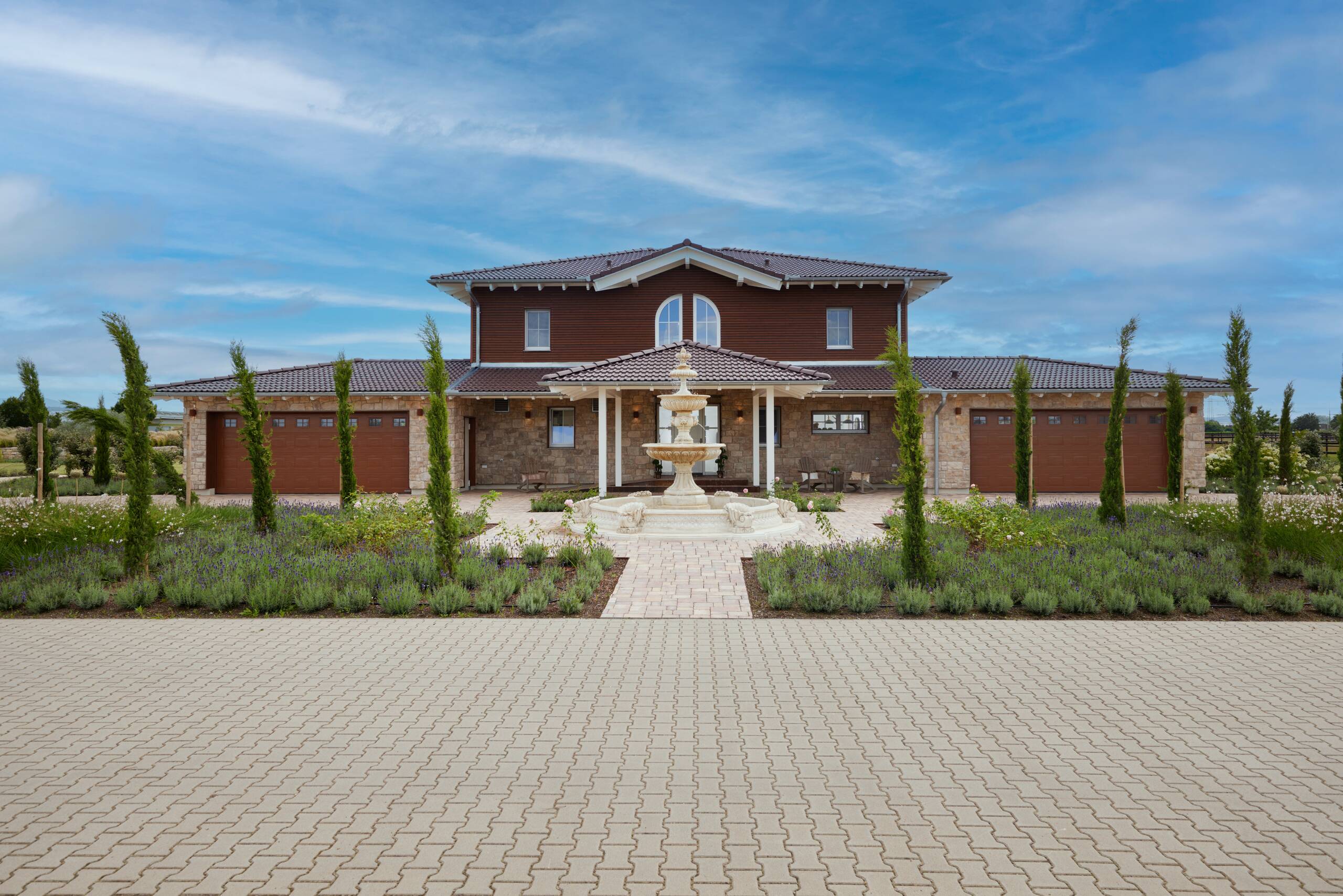Als Teil eines großen Trainings- und Zuchtbetriebs für Westernpferde war klar, dass sich das neue Wohnhaus im modernen Western-Look präsentieren sollte. Für Cowboy-Romantik sorgen unter anderem das von Stützen getragene Vordach, die halbrunden Fenster, die beiden Loggias auf der Gartenseite sowie rotbraune Holzverschalung am Obergeschoss. Das Untergeschoss hüllt sich in rustikale Steinverblender, die dem Gebäude einen mediterranen Touch verleihen.