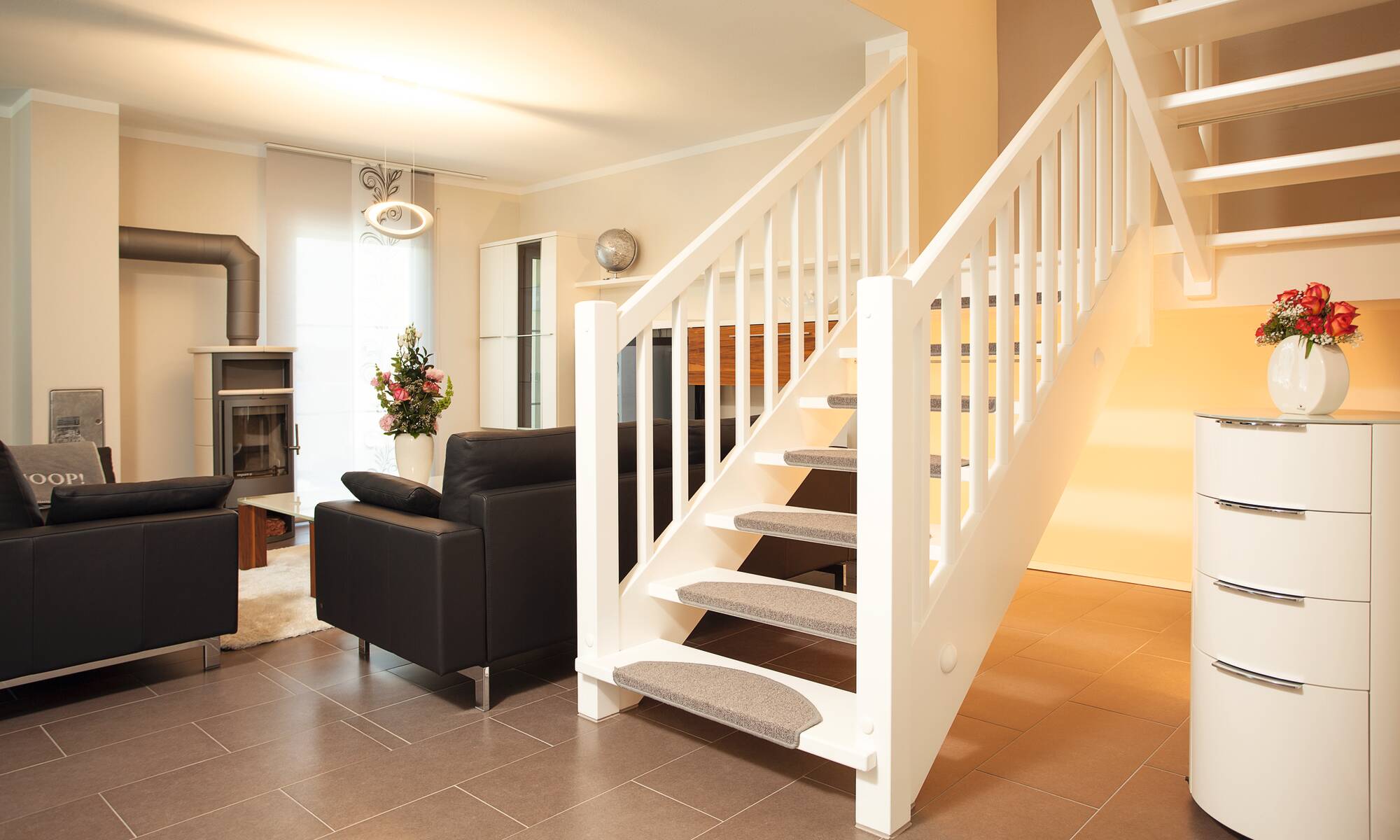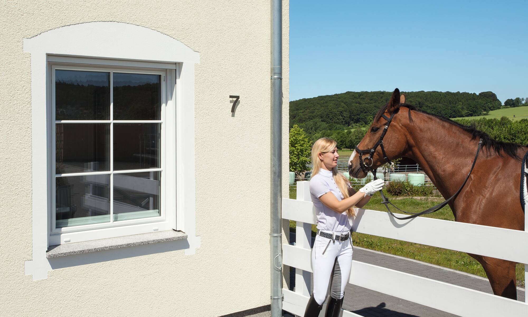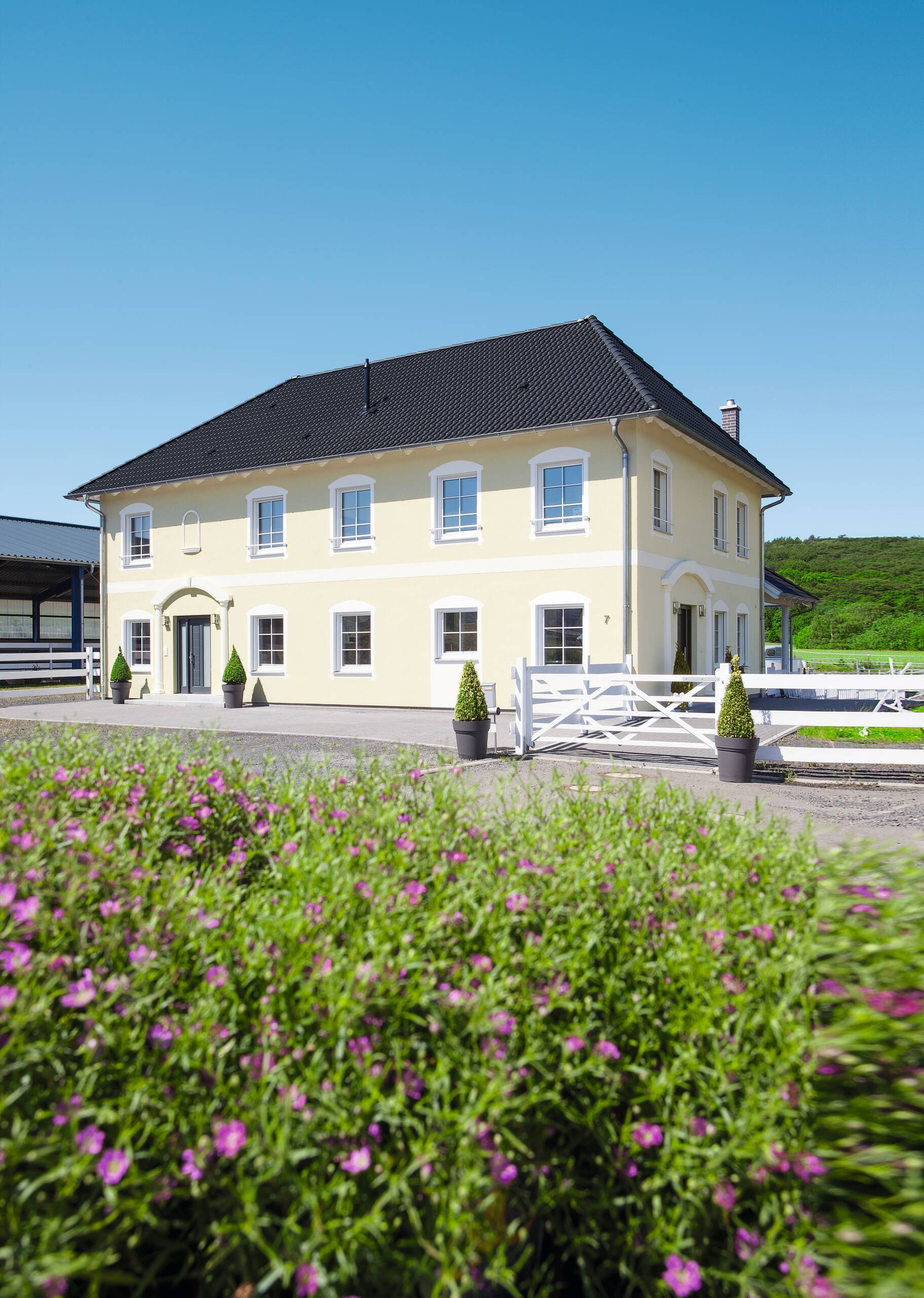 Zusammen leben und doch getrennte Räume, dieser Wunsch wurde in diesem Kundenhaus verwirklicht. Die Familie besitzt einen Reitstall, somit entspricht das Äußere des Hauses auch mehr einer repräsentativen Villa auf einer Ranch als einem gewöhnlichen Entwurf. Pastellgelbe Fassade und ein grau gedecktes Dach komplettieren diesen Look. Im Gewerbegebiet gelegen, beherbergt das Anwesen nicht nur die zwei Familien mit ihren Hunden, sondern auch die 16 Pferde des Reiterhofes. Über der Eingangstür zu den insgesamt rund 276 Quadratmetern heißt ein verspielter Rundbogen auf angedeuteten Säulen die Besucher willkommen. Dieses Haus ist alles, nur nicht verwechselbar.