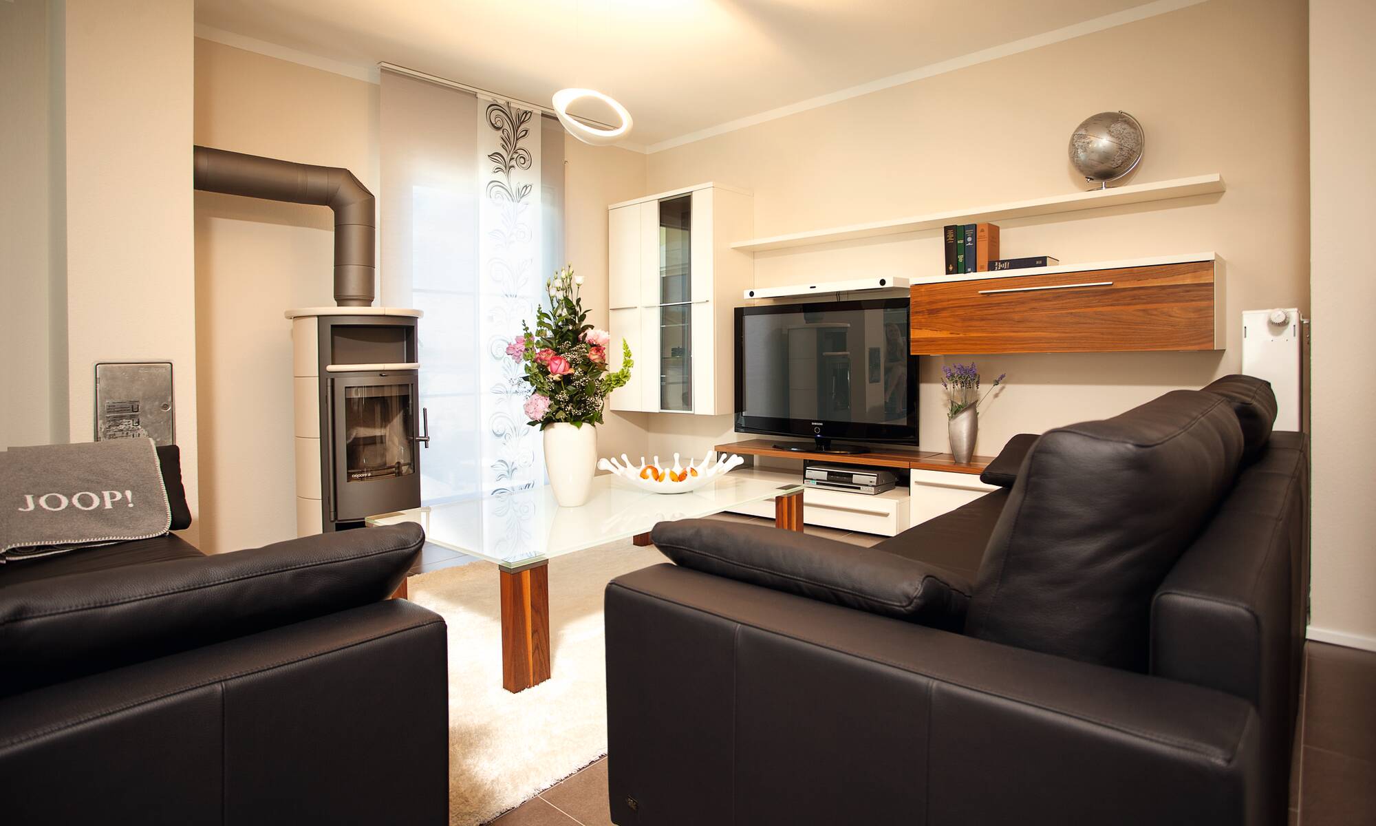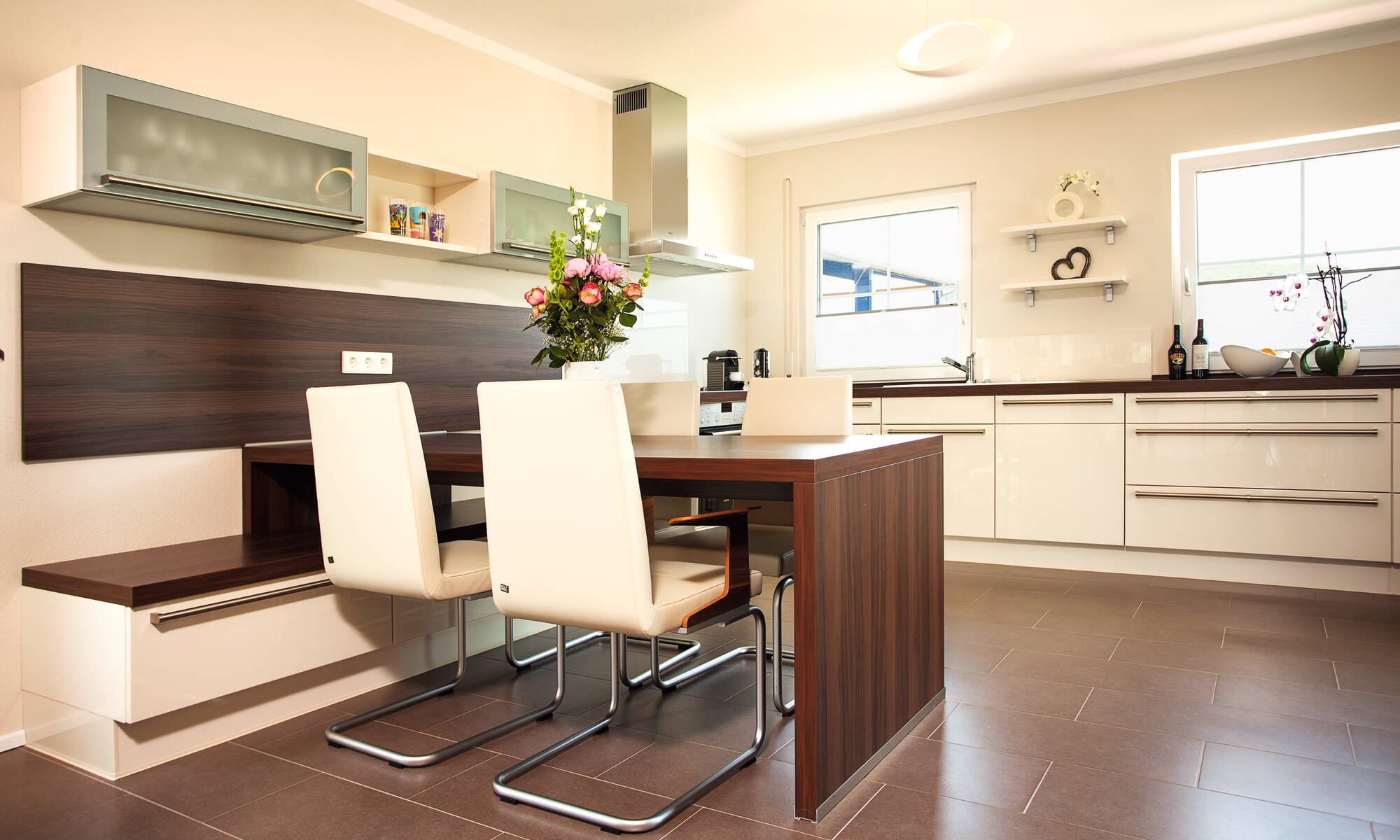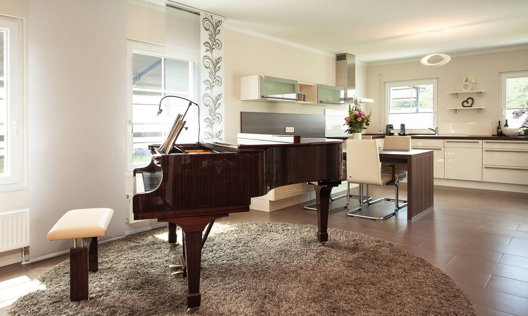 Zusammen leben und doch getrennte Räume, dieser Wunsch wurde in diesem Kundenhaus verwirklicht. Die Familie besitzt einen Reitstall, somit entspricht das Äußere des Hauses auch mehr einer repräsentativen Villa auf einer Ranch als einem gewöhnlichen Entwurf. Pastellgelbe Fassade und ein grau gedecktes Dach komplettieren diesen Look. Im Gewerbegebiet gelegen, beherbergt das Anwesen nicht nur die zwei Familien mit ihren Hunden, sondern auch die 16 Pferde des Reiterhofes. Über der Eingangstür zu den insgesamt rund 276 Quadratmetern heißt ein verspielter Rundbogen auf angedeuteten Säulen die Besucher willkommen. Dieses Haus ist alles, nur nicht verwechselbar.