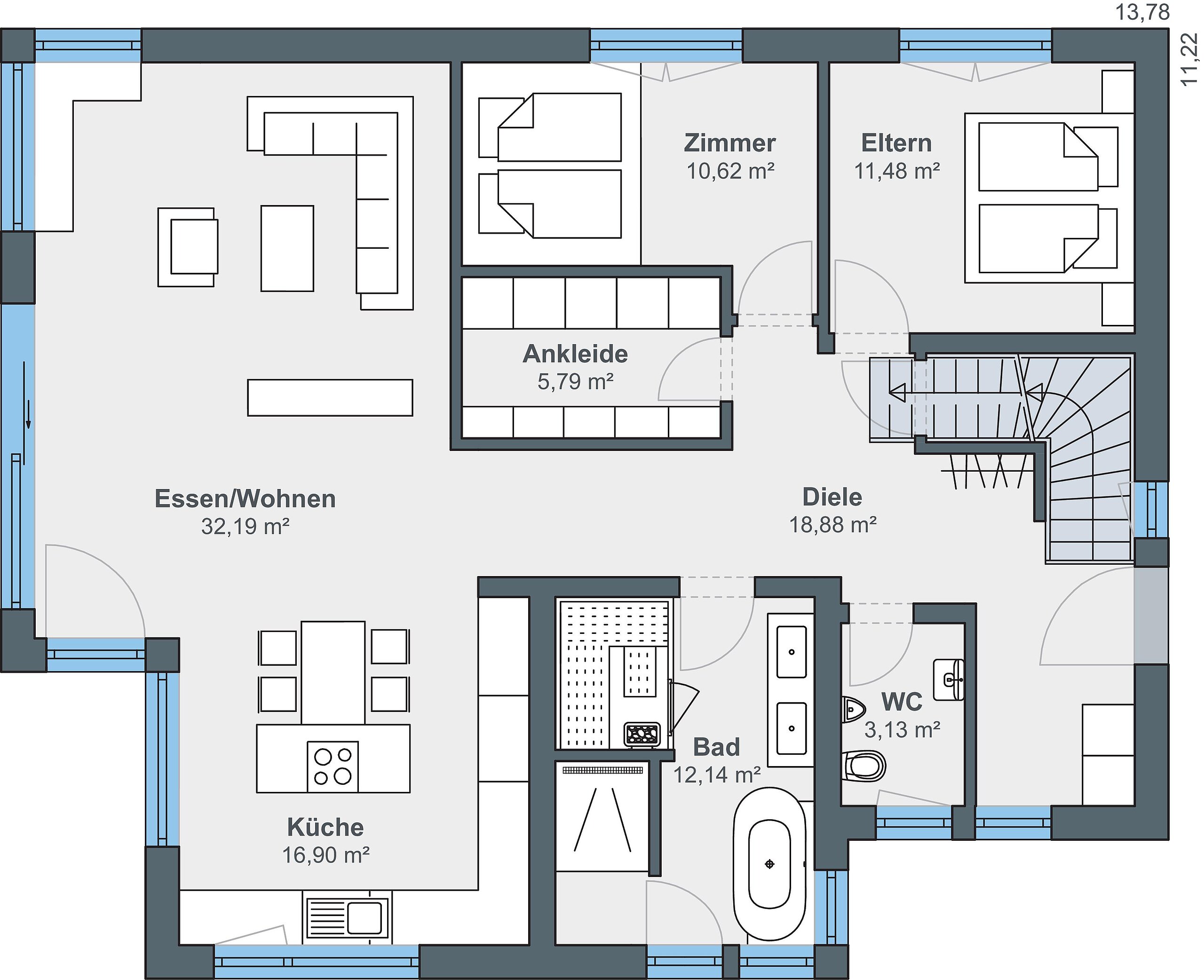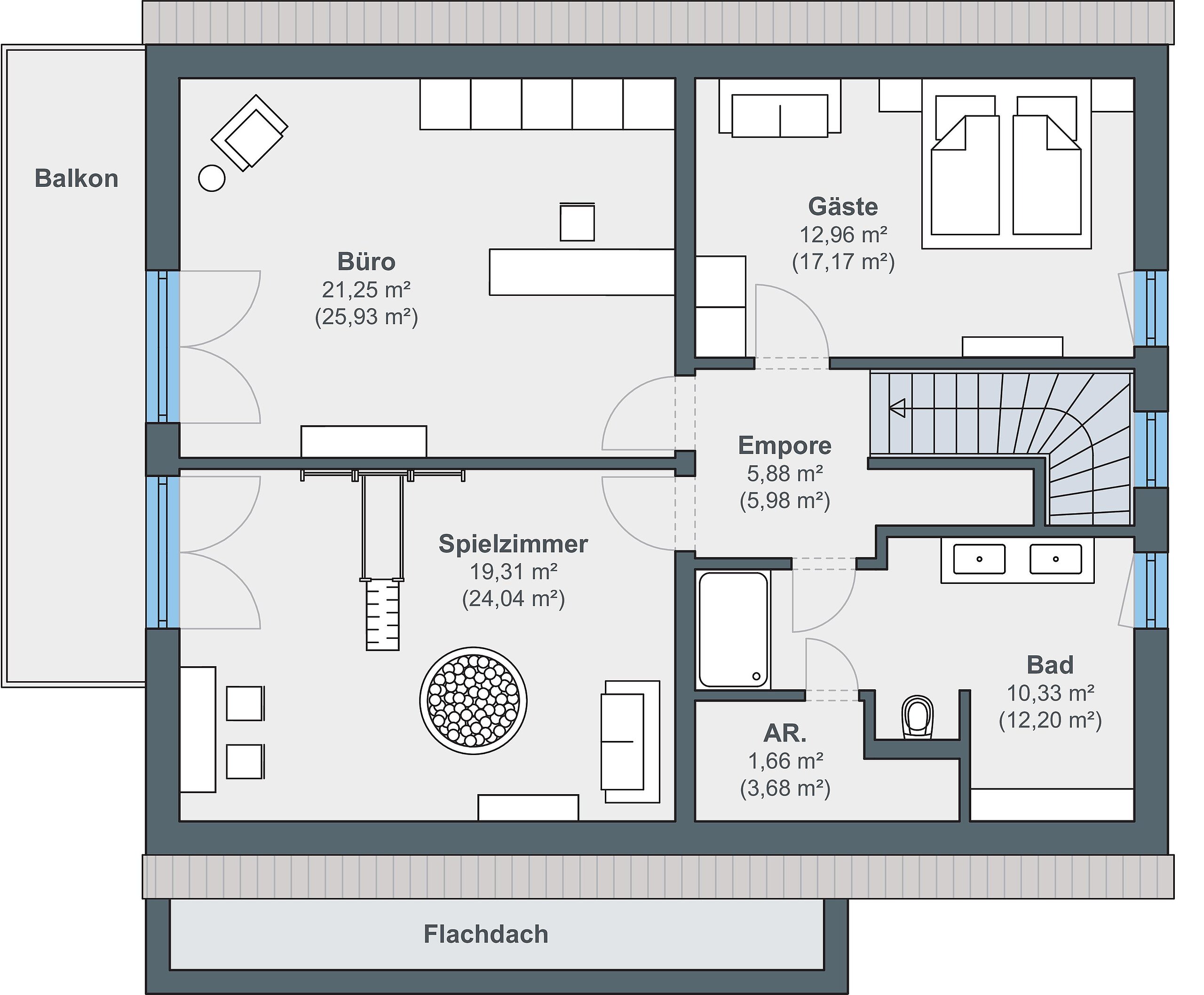 Eine Herausforderung für das Planungsteam war der Wunsch, auf einer Ebene zu wohnen. „Das Hauptleben soll sich wie bei einem Bungalow im Erdgeschoss abspielen, was natürlich eine gewisse Grundfläche erfordert. Gleichzeitig sollten die Gemeinschaftsräume nicht darunter leiden“, erklärt Elvira Huber. Ihr Mann Timo ergänzt: „Wir haben dann zusammen mit WeberHaus die Lösung gefunden, dass wir das Erdgeschoss mit zwei Erkern erweitern, ohne dabei das Gesamthaus unnötig zu vergrößern. Das wäre dann auch ein anderer Kostenrahmen gewesen.“