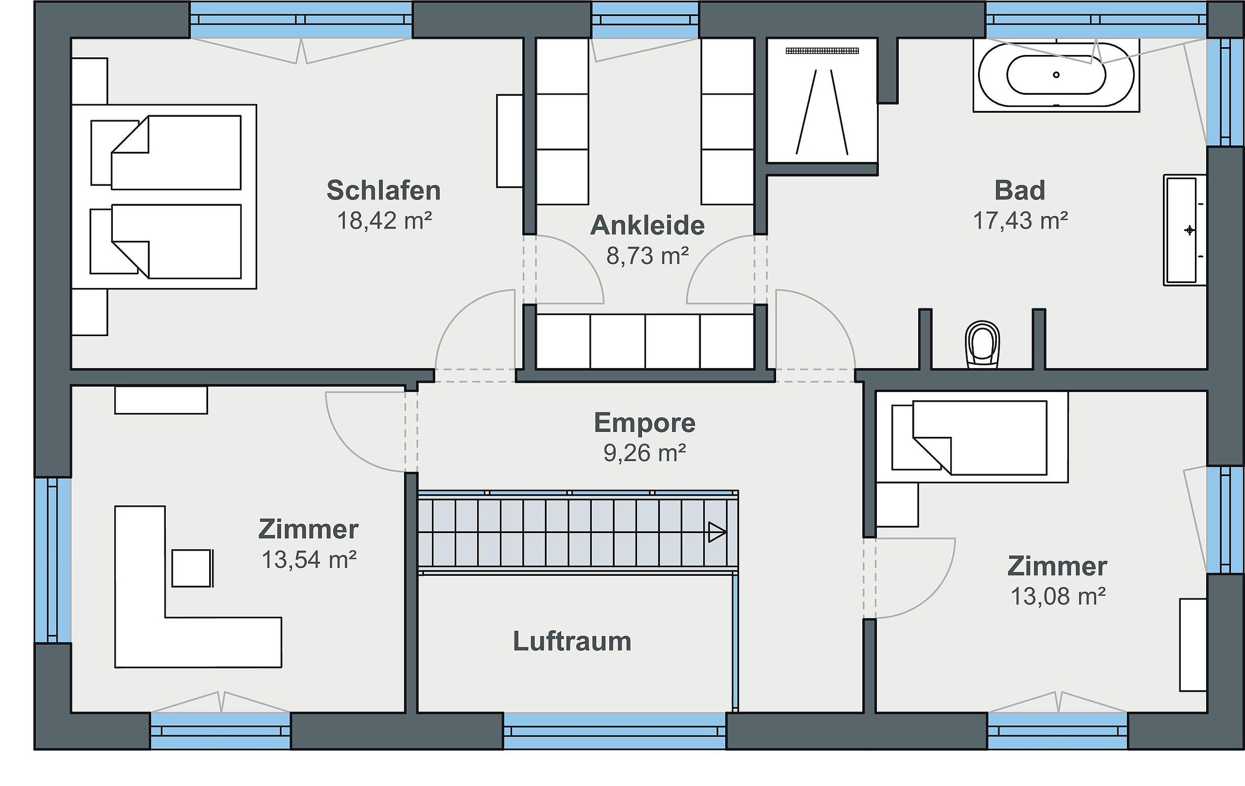 Das Obergeschoss steht dem Erdgeschoss hinsichtlich Platzangebot und Wohnkomfort in nichts nach. Um die Empore gruppieren sich das Schlafzimmer mit angeschlossener Ankleide, ein großes Badezimmer, ein Gästezimmer sowie ein ruhiges Büro. „Viele unserer Familienangehörigen und Freunde meinen, dass das Haus zu groß für zwei Leute sei“, erzählt Fabian Menger lachend. „Die meisten mussten aber eingestehen, dass es nicht nur außen schön aussieht, sondern auch innen gut geplant ist.“ Das findet auch der Bauherr: „Jedem, mit dem ich über das Haus rede, sage ich, dass ich immer wieder mit WeberHaus bauen würde. Es gab von der Planung bis hin zum Einzug keine Probleme“, so das positive Fazit.